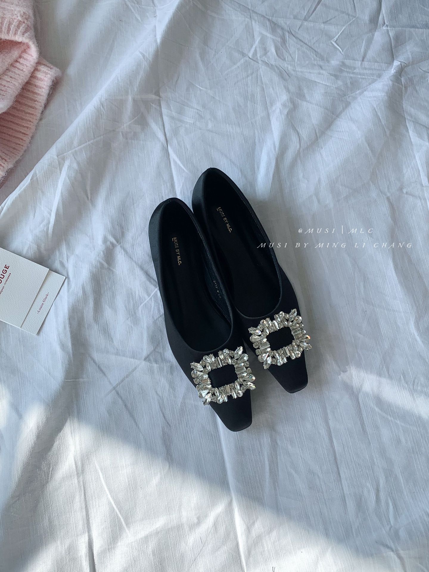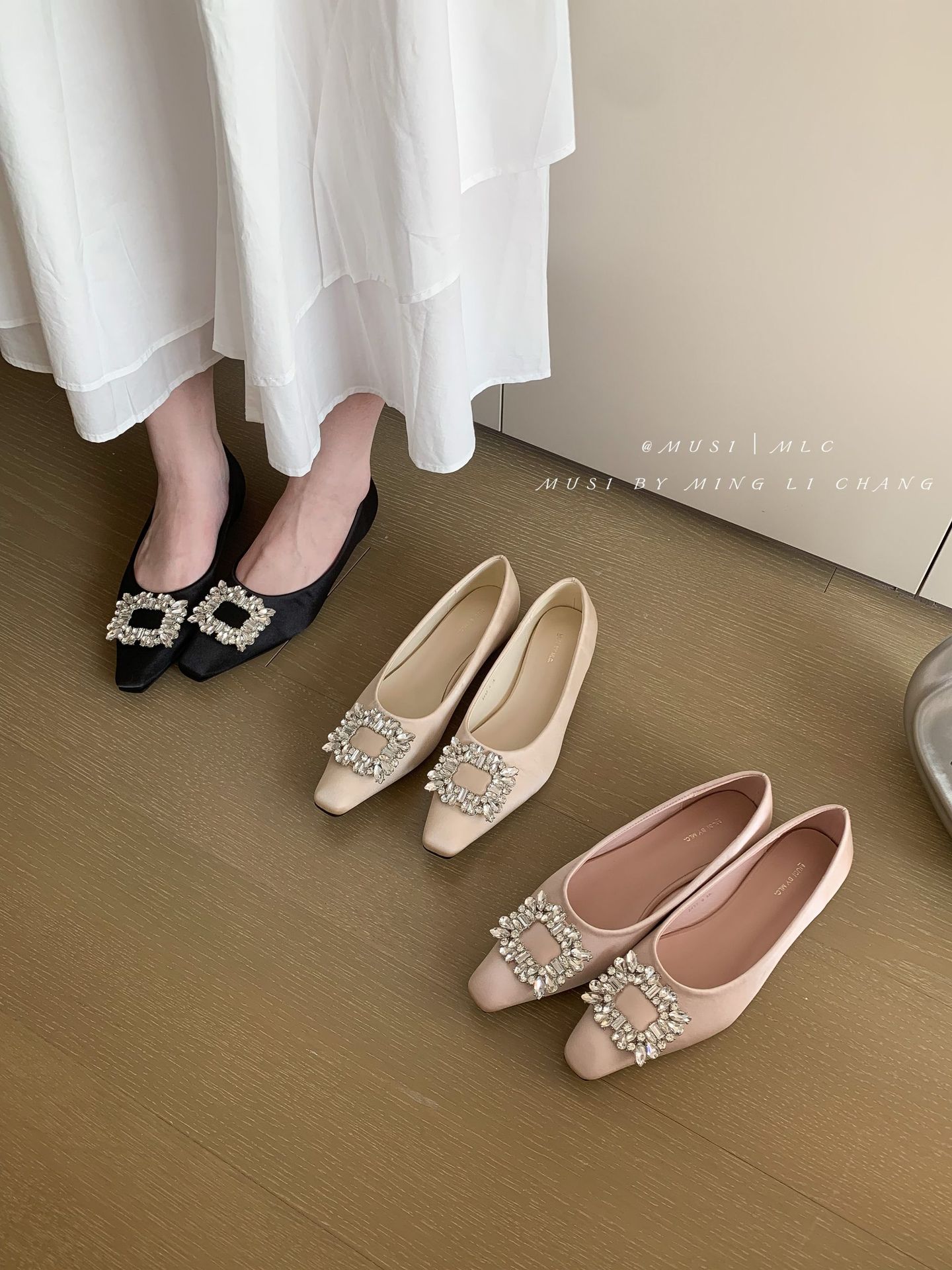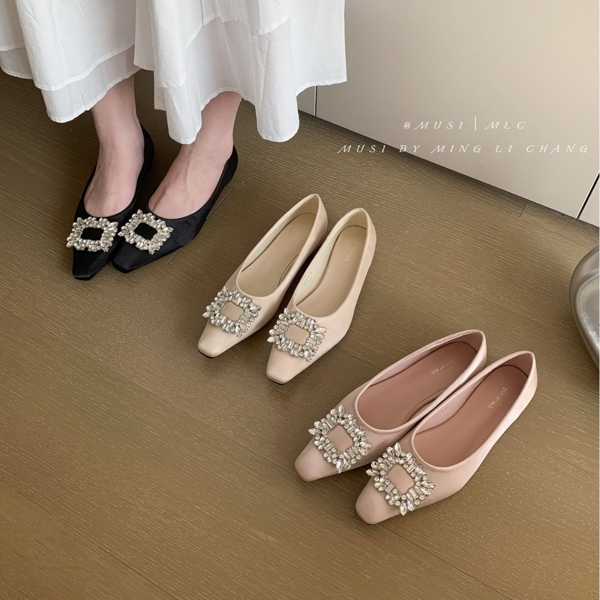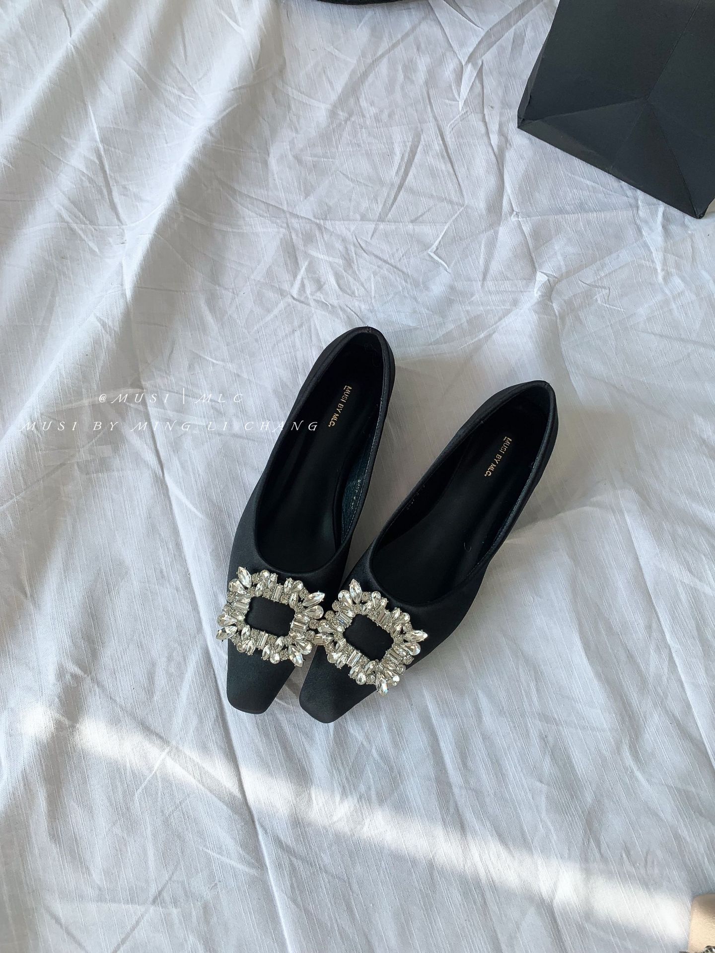 2025 봄과 가을 새로운 통근 올 매치 싱글 슈즈 라인 스톤 스퀘어 버클 얕은 입 플랫 슈즈 슬립 온 여성용 프렌치 레이디 슈즈스토어 가기