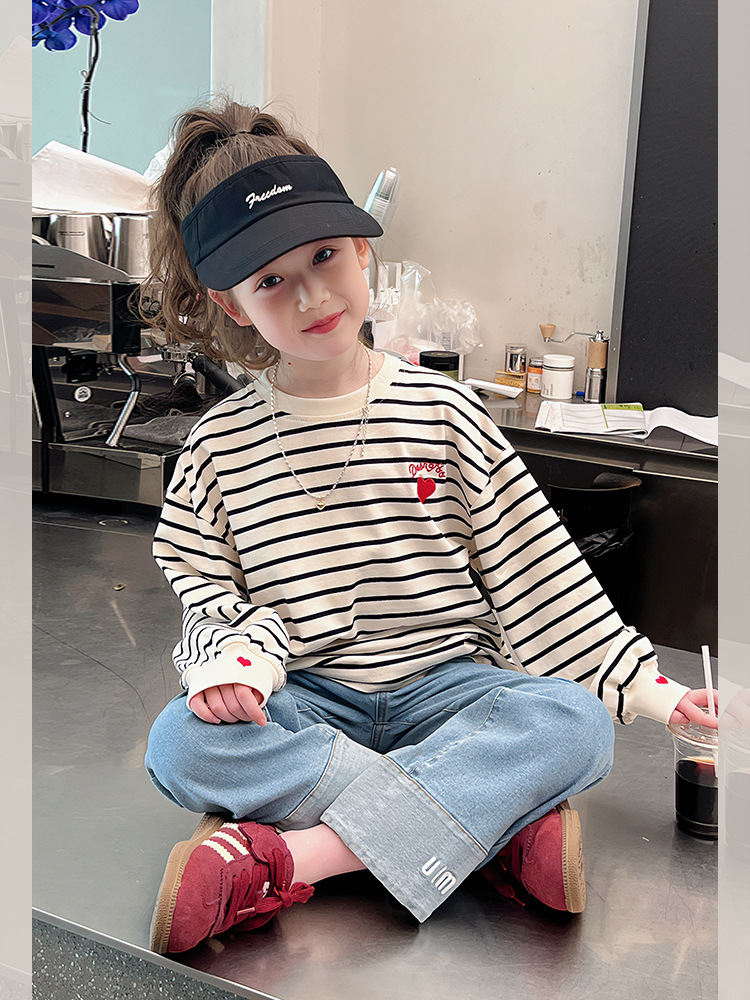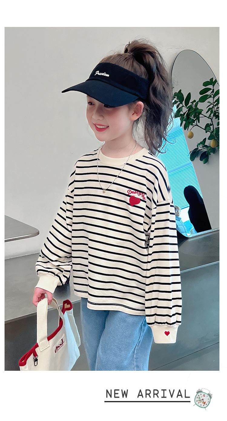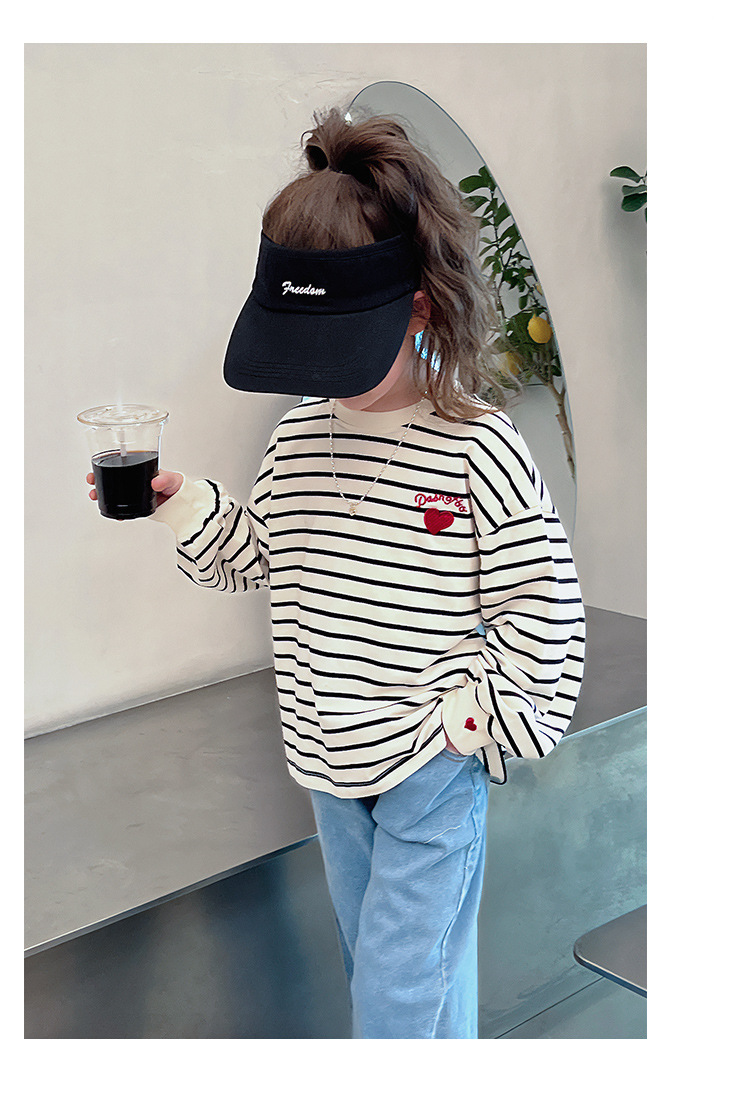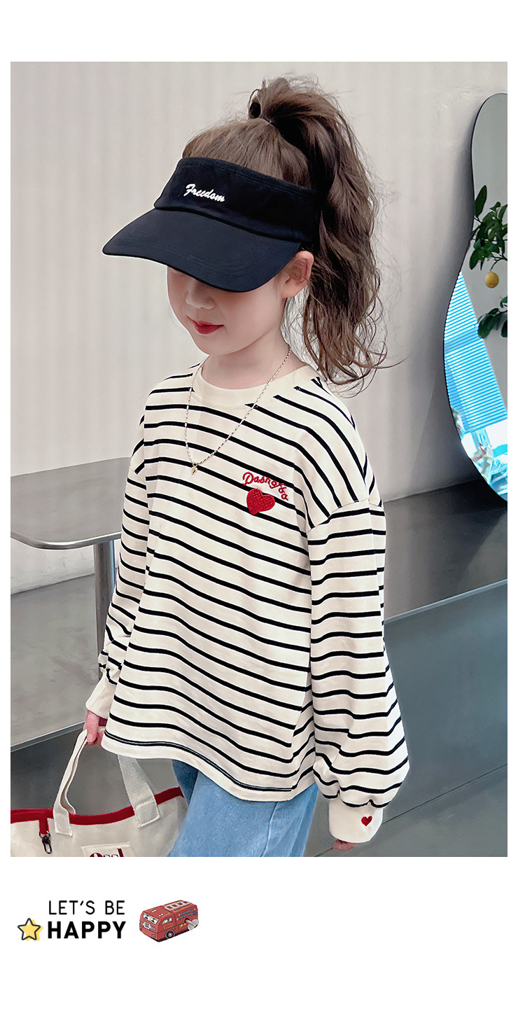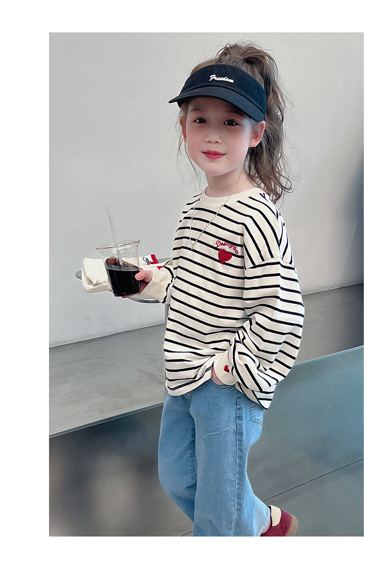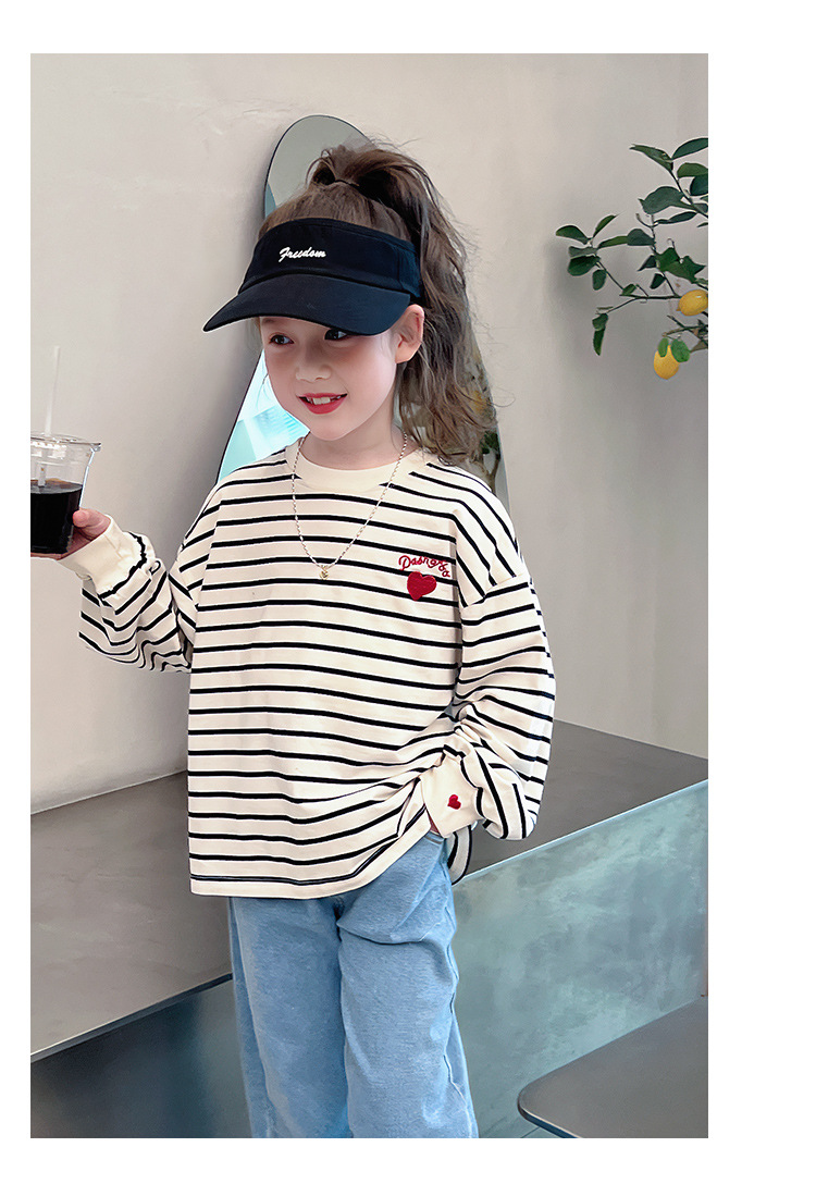 소녀 줄무늬 어깨베이스 셔츠 어린이 서양식 긴 소매 티셔츠 대형 아동복 한국 스타일 톱 2025 봄 새로운 스타일스토어 가기