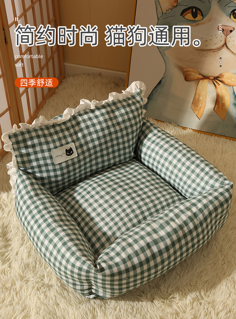 도매 고양이 둥지 겨울 소파 둥지 반 폐쇄 따뜻한 녹색 레이스 애완 동물 소파 쿠션 고양이 사육장 두껍게 앉아