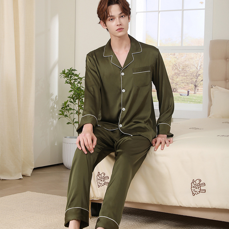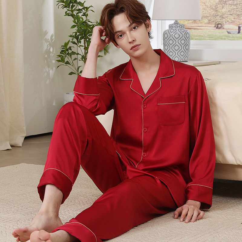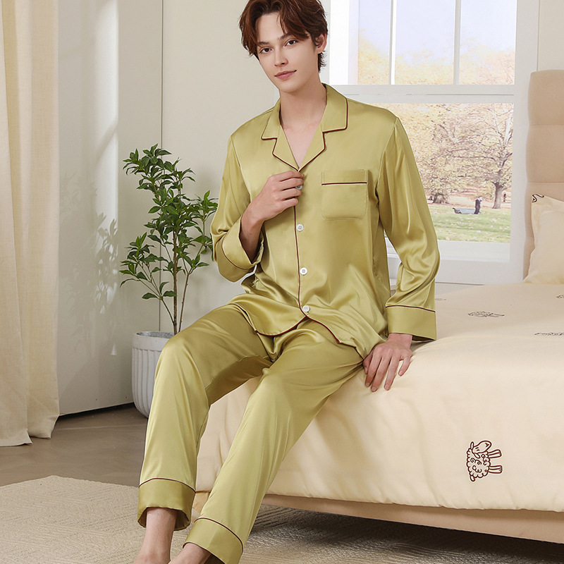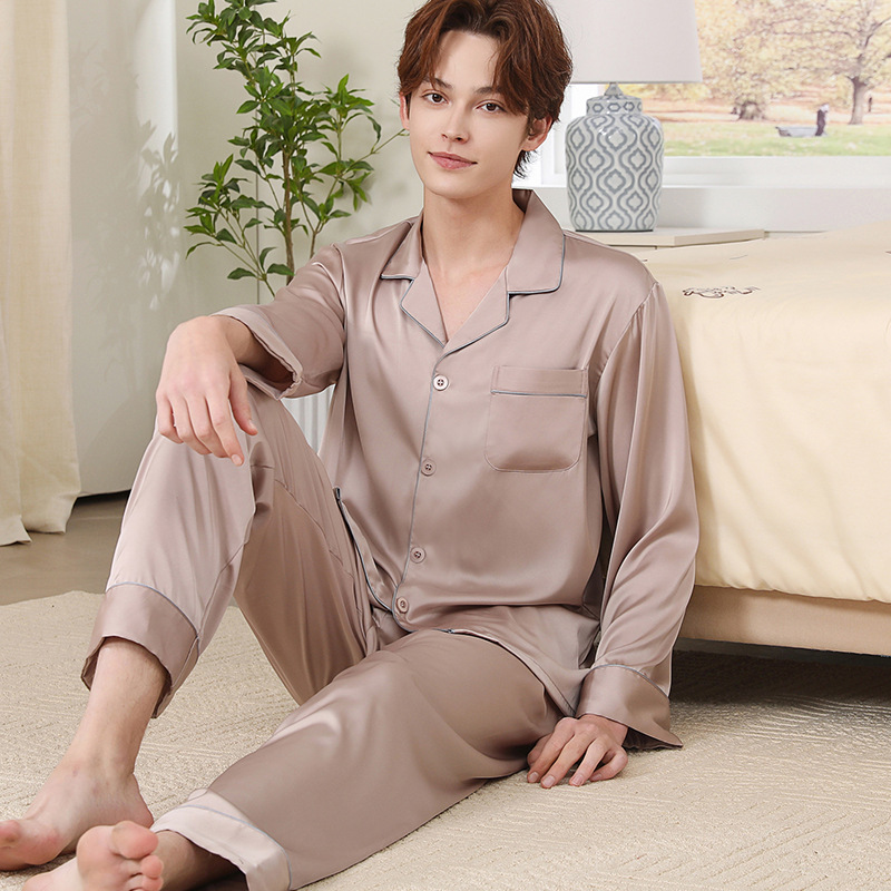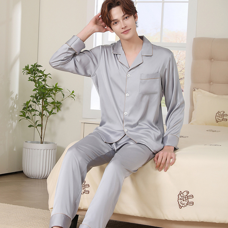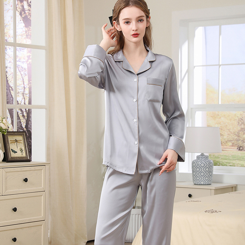커플의 새로운 잠옷 여성 시뮬레이션 실크 얇은 남성 옷깃 긴팔 바지 봄 가을 여름 홈웨어 얼음 실크