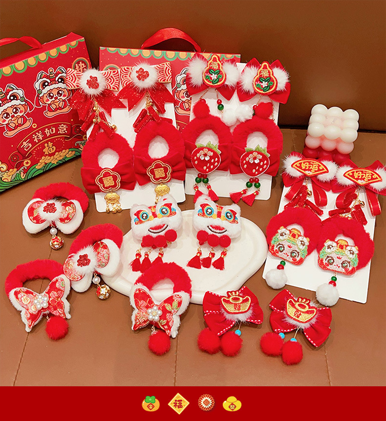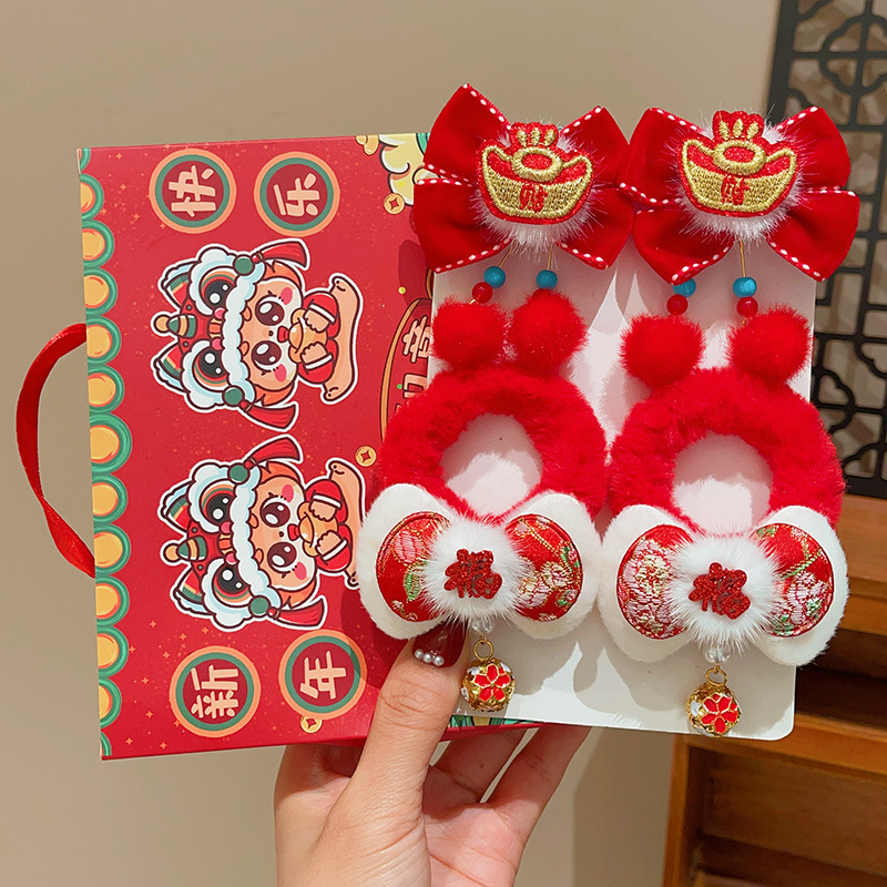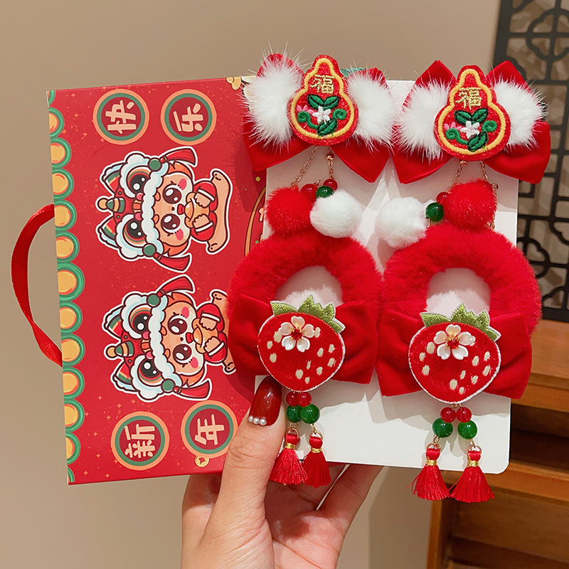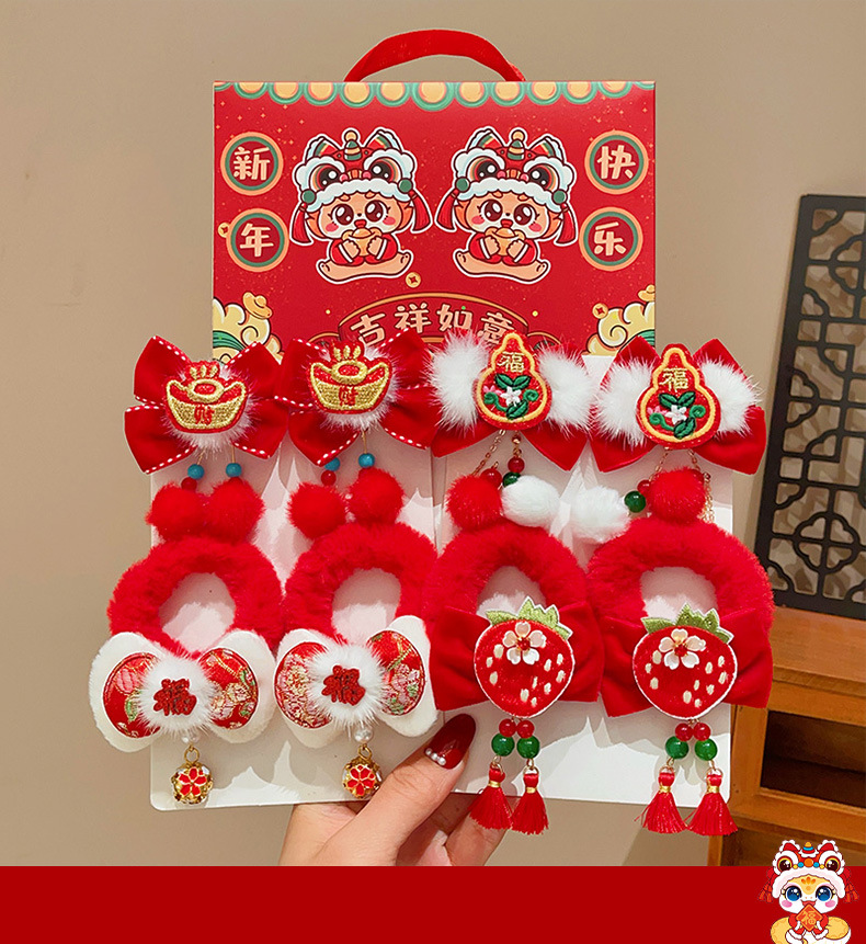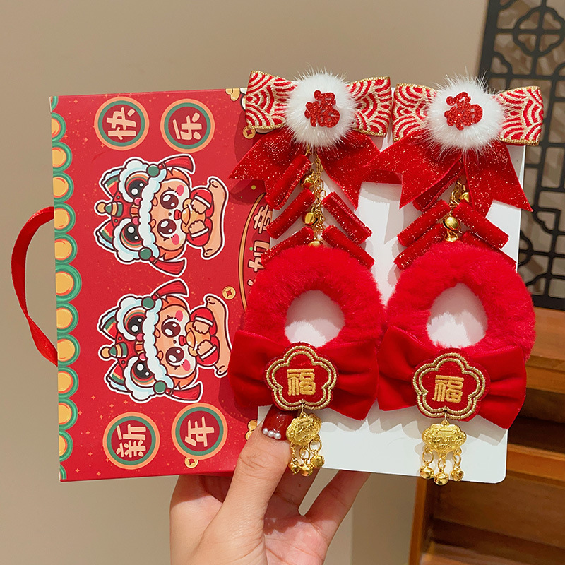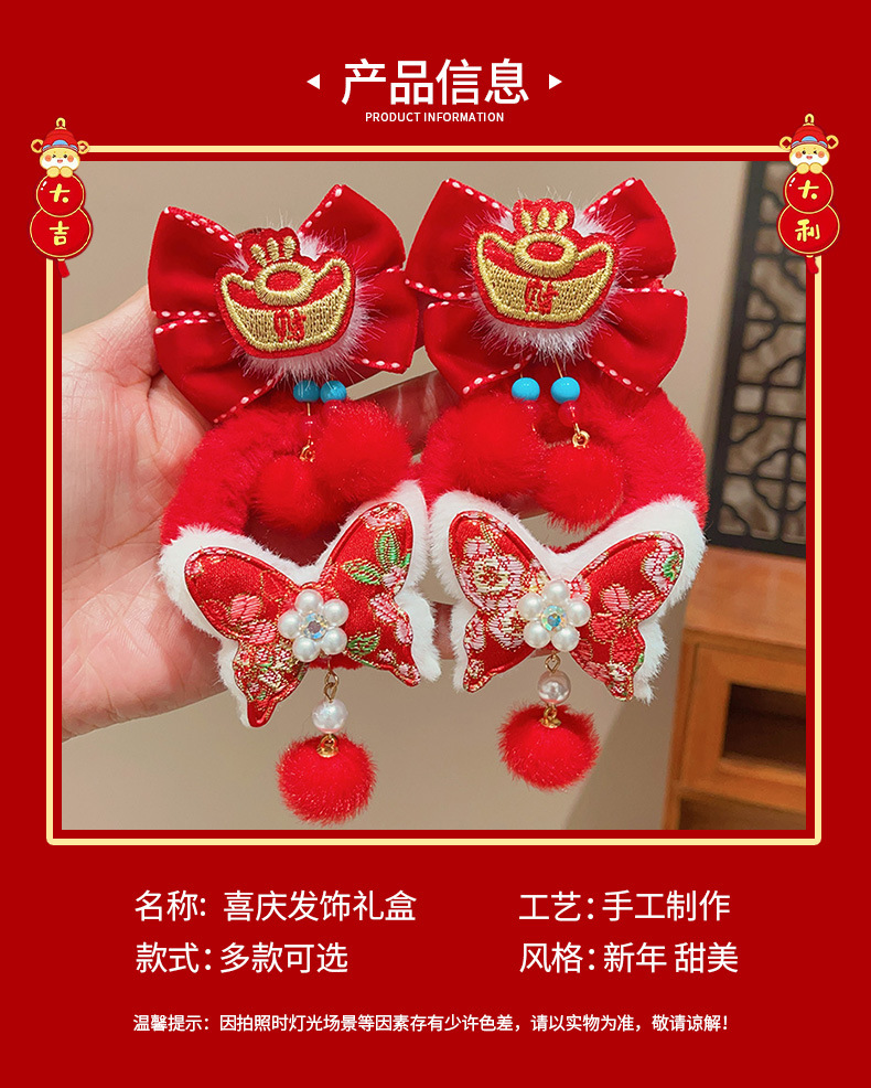 새해 어린이 봉제 헤어 밴드 헤어핀 헤드웨어 선물 세트 봄 축제 빨간 머리핀 헤드 로프 소녀 헤어 액세서리 클립