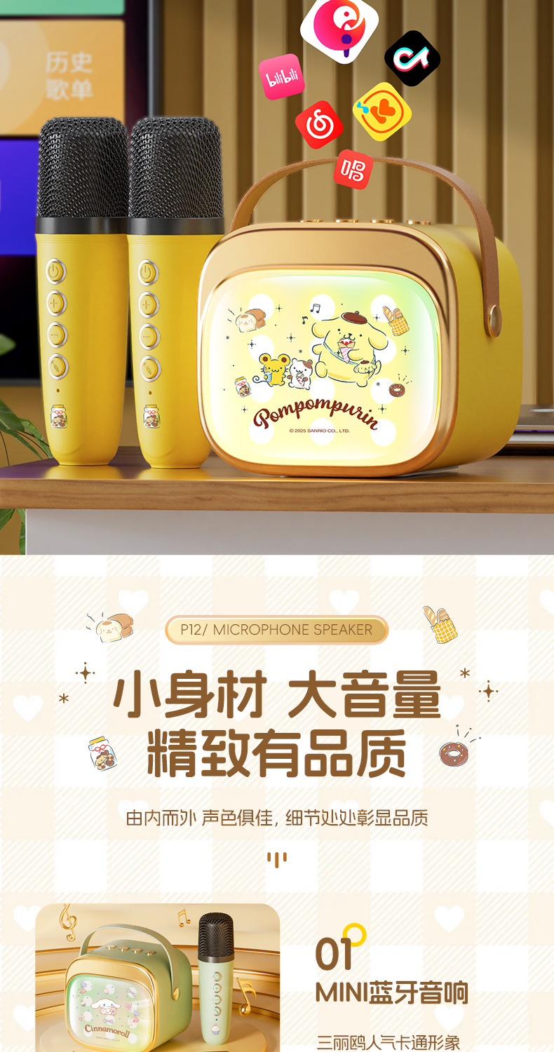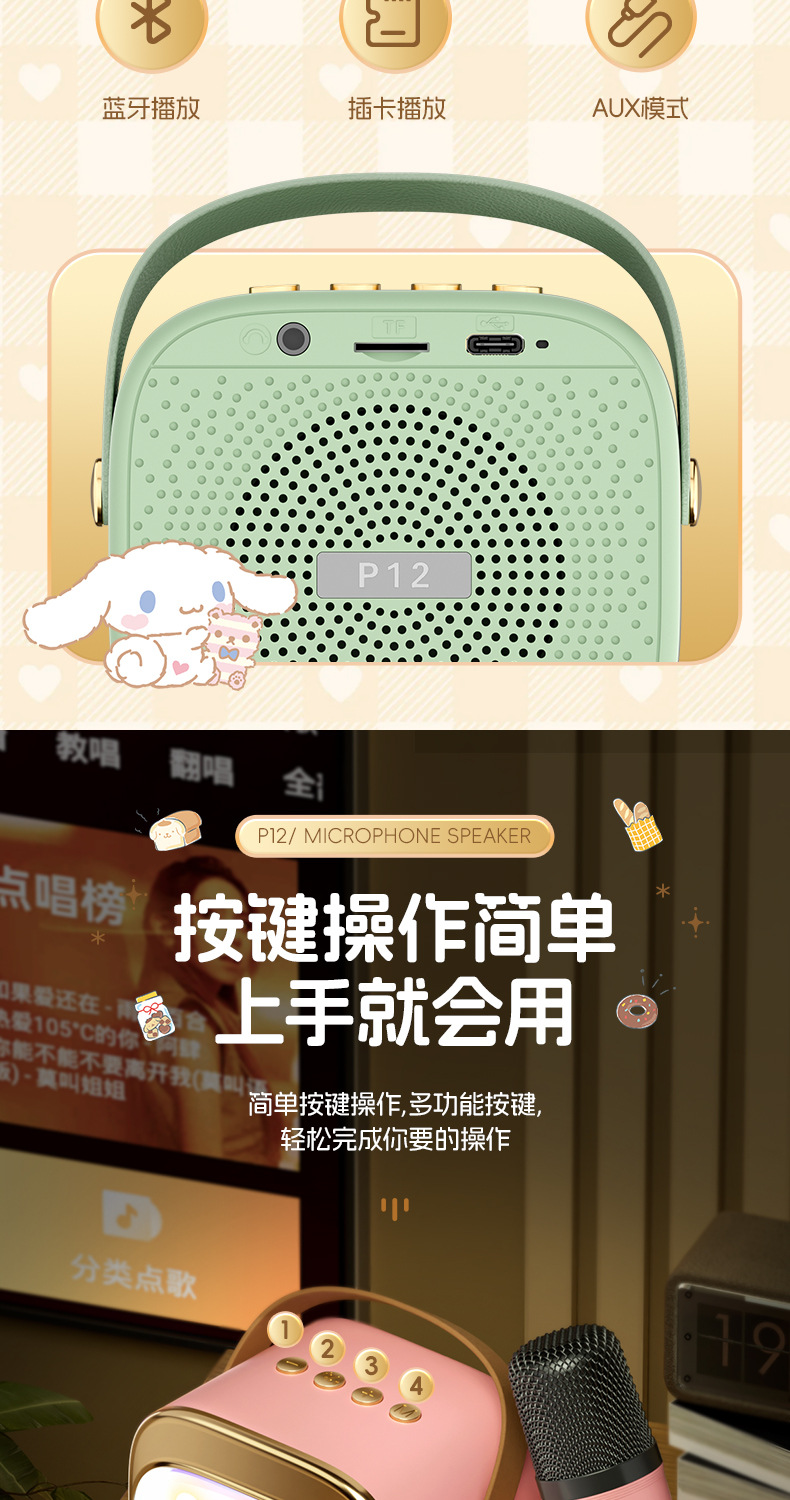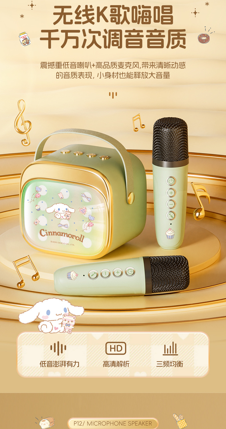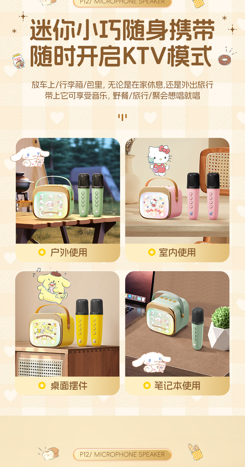 산리오 P12 무선 블루투스 오디오 통합 마이크 휴대 전화 블루투스 노래 어린이 국가 K-노래 작은 스피커