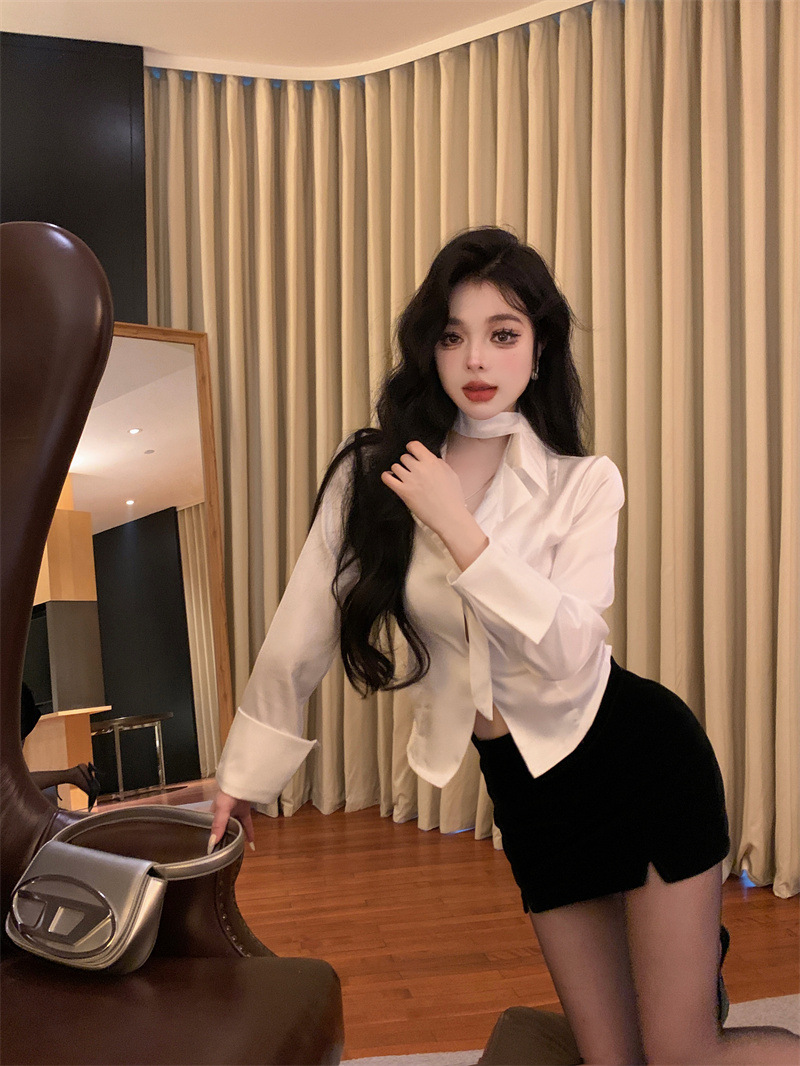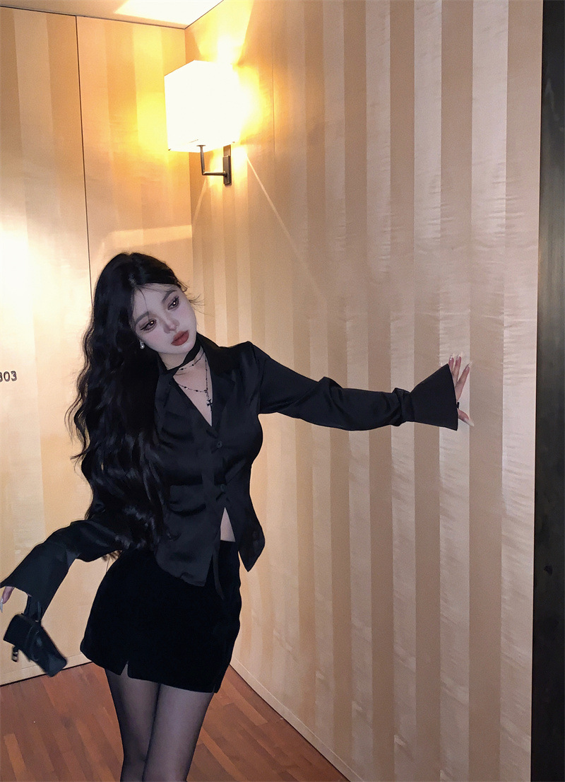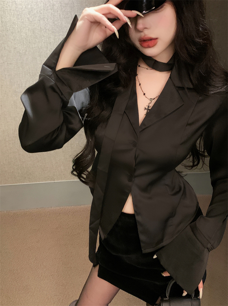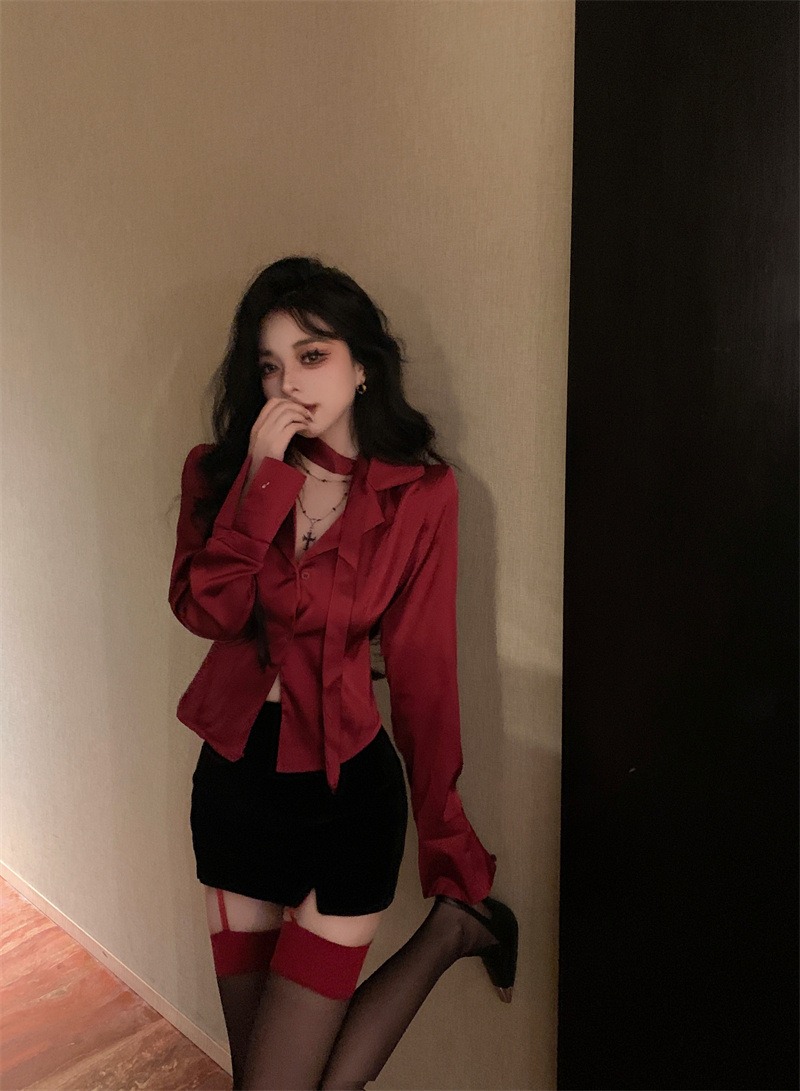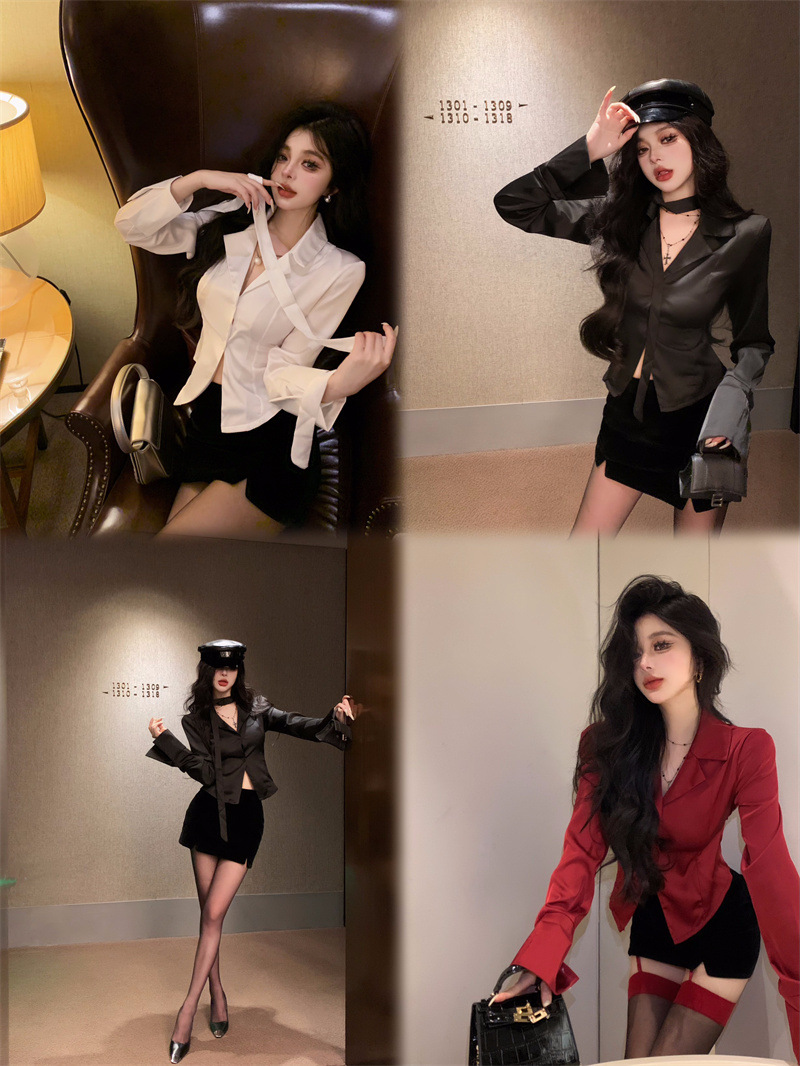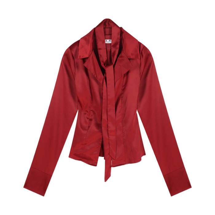 로즈 세그먼트 프랑스 리본 긴팔 쉬폰 셔츠 슬림 핏 셔츠 스타일 순수한 욕망 카디건 탑