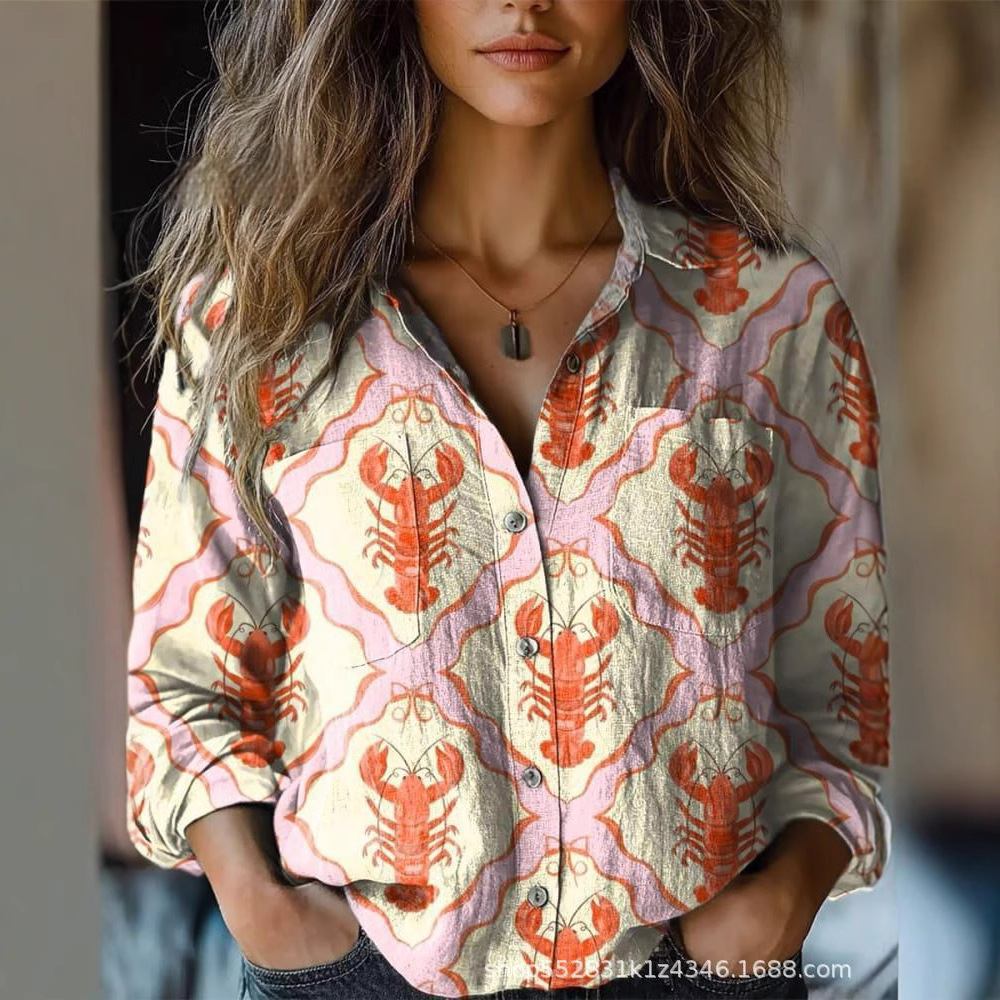 2025 봄 대외 무역 여성 셔츠 국경 간 랍스터 v-neck 인쇄 복고풍 여성 셔츠 아마존스토어 가기