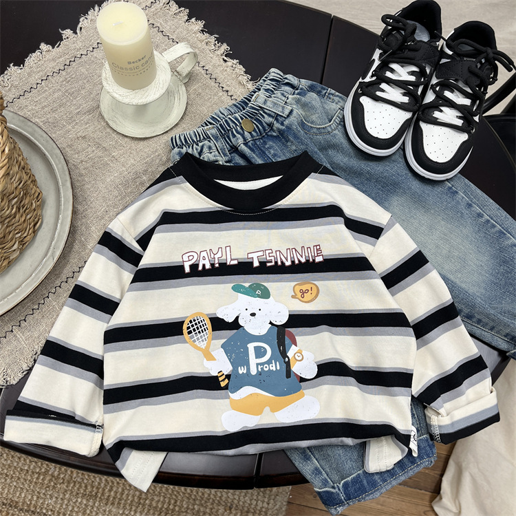 아기 한국 만화 재미있는 라운드 넥 긴팔 티셔츠 소년과 소녀를위한 가을 옷 줄무늬 다목적 가을 기본 셔츠 탑