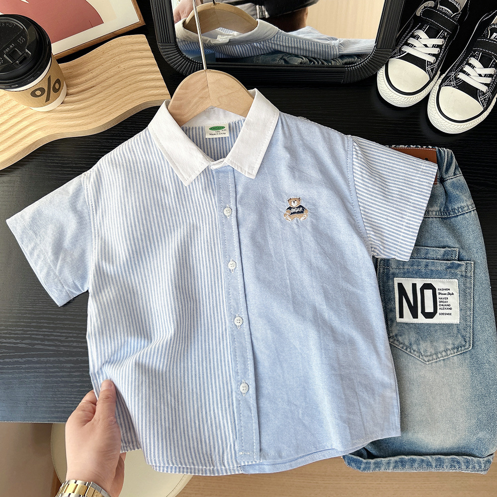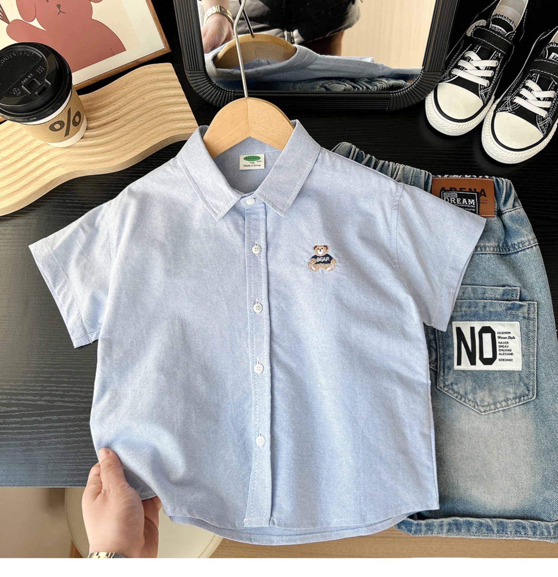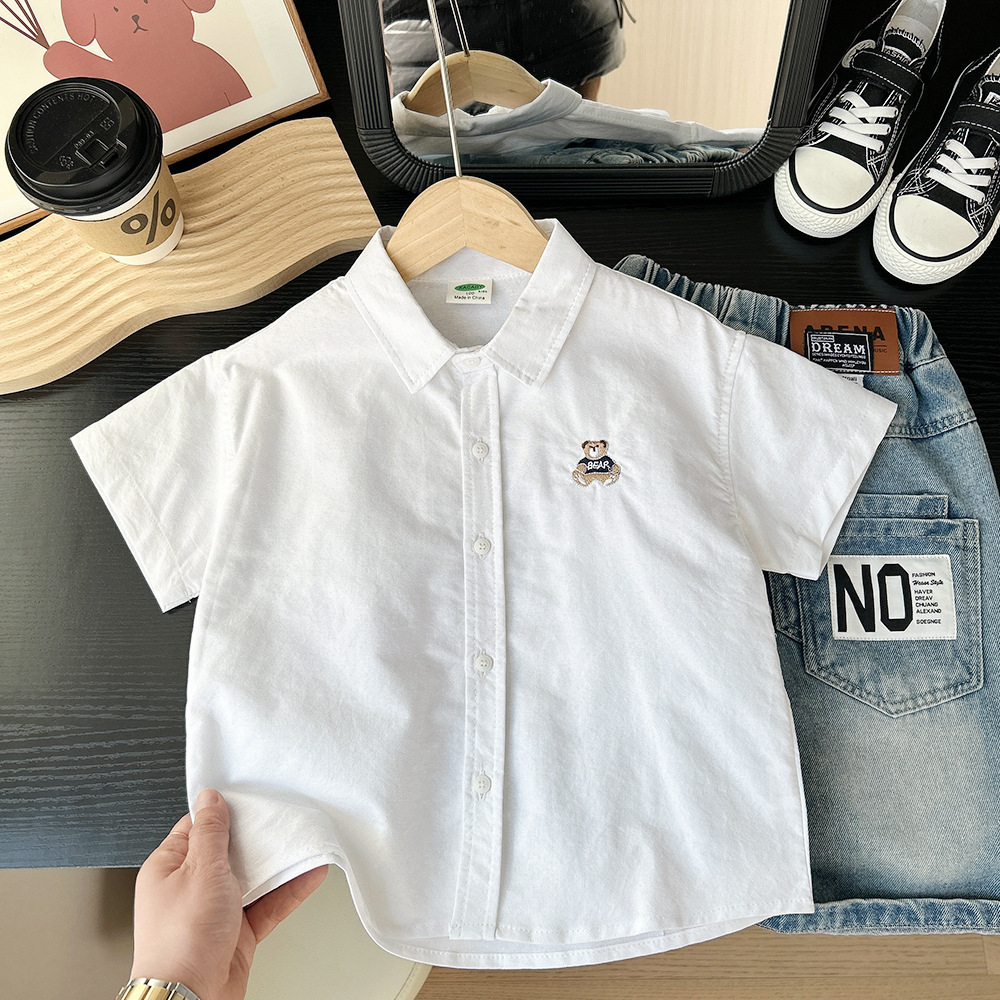 어린이 반팔 셔츠 2025 여름 새 도착 한국 스타일 면 옥스포드 만화 탑 큰 소년과 아기스토어 가기