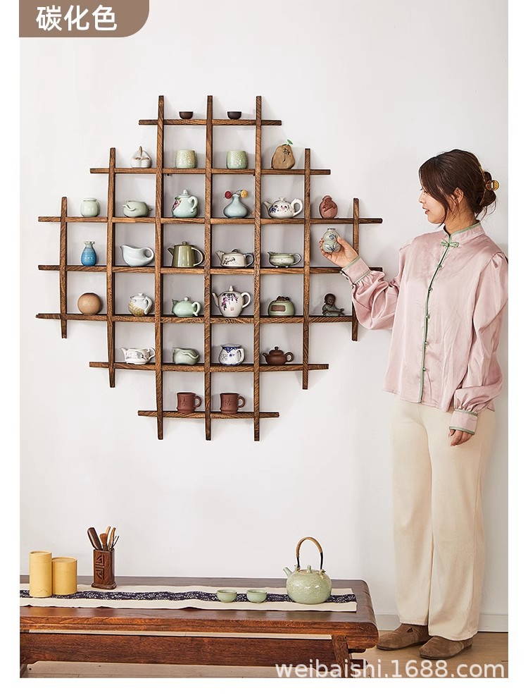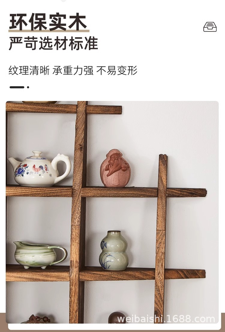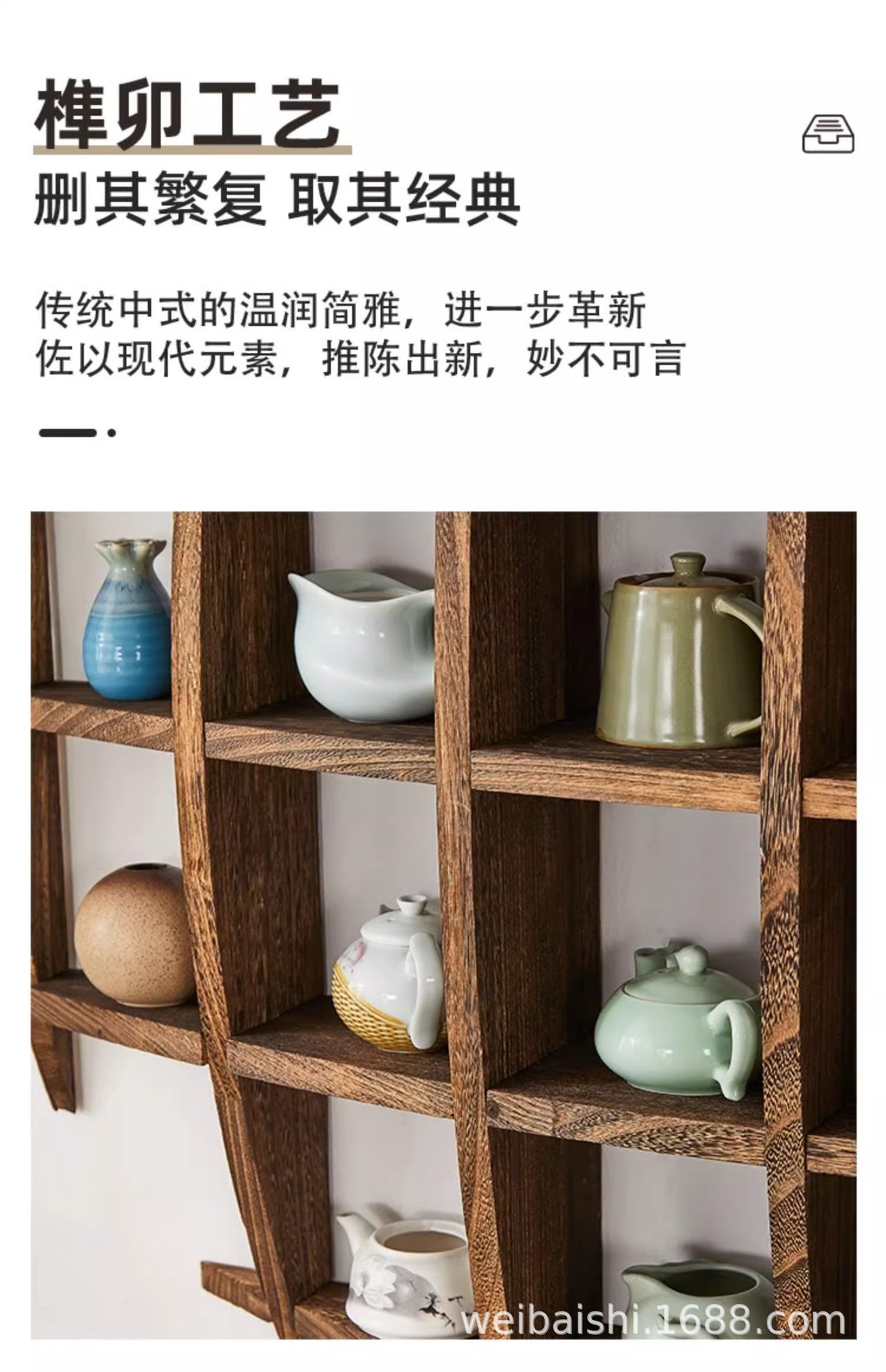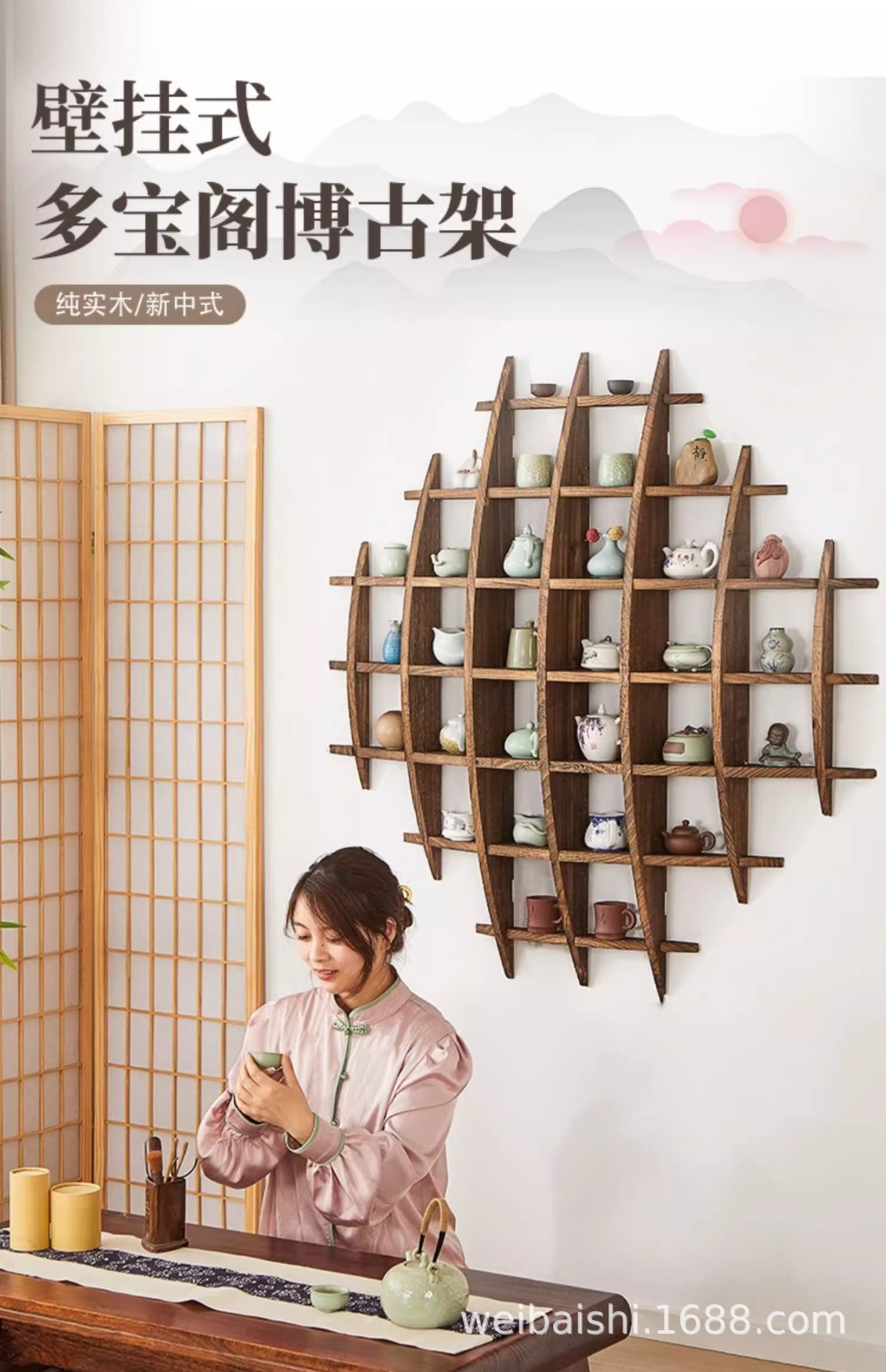새로운 중국 스타일의 벽에 장착 된 티 컵 랙 벽걸이 형 골동품 랙 솔리드 우드 벽 Duobao Pavilion Prellis 랙 스토리지 랙 배경 전시회