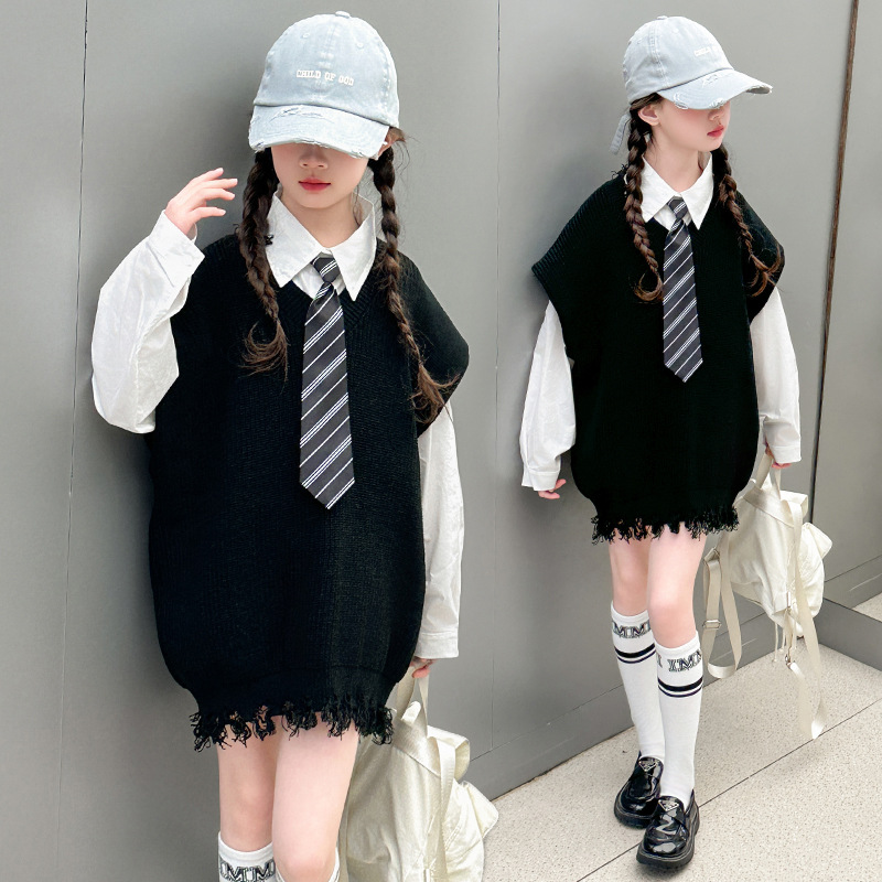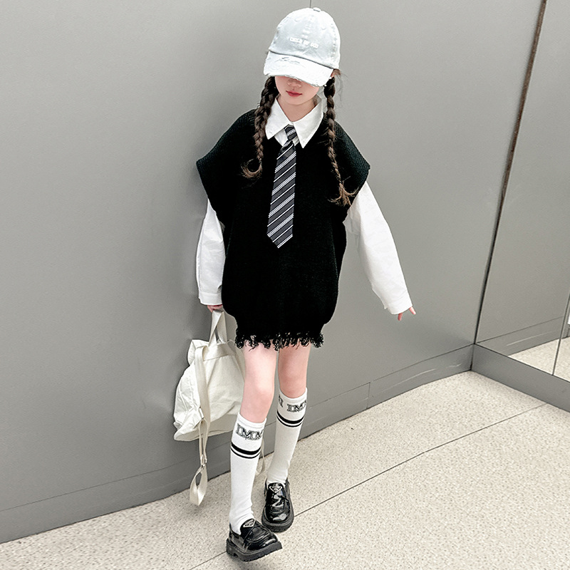 소녀 2025 세트 새로운 소녀 세련된 봄과 가을 옷 어린이 니트 조끼 셔츠 투피스 세트