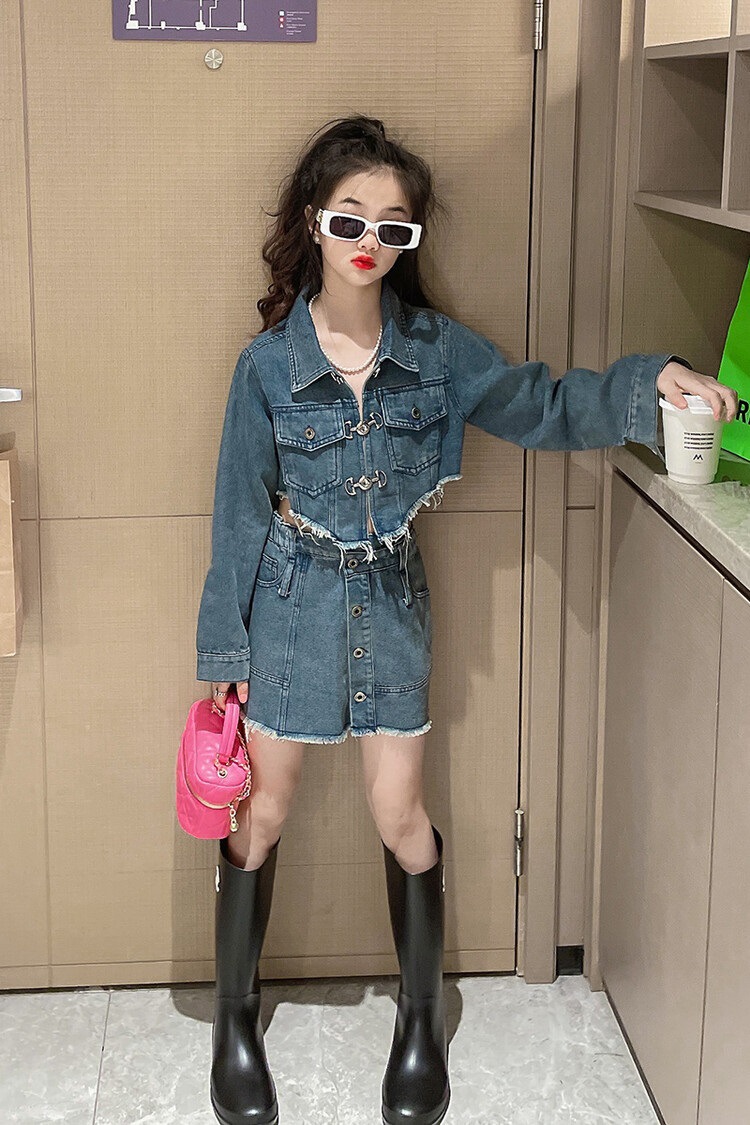 Meng'erfei 아동복 및 핸드 네일 데님 세트 블루 그레이 8 데님 재킷 재고 바지