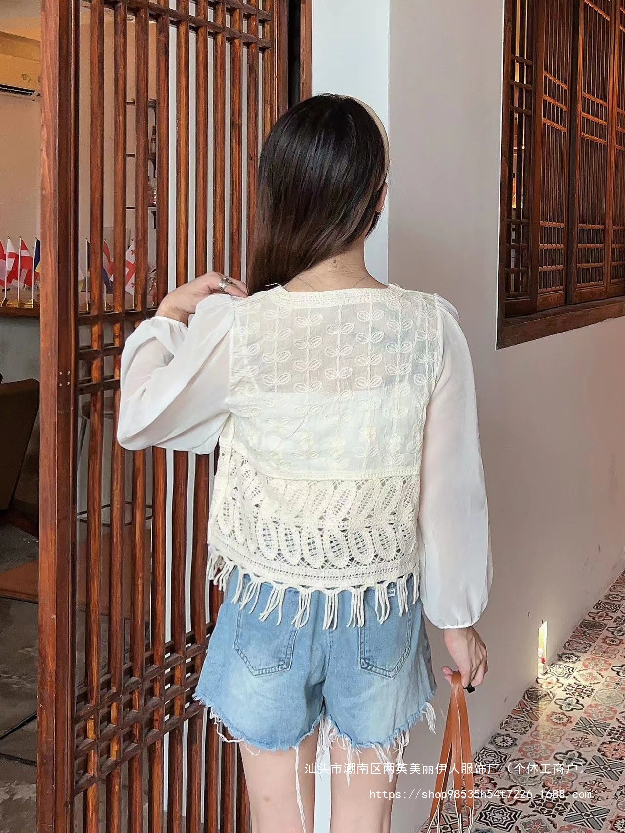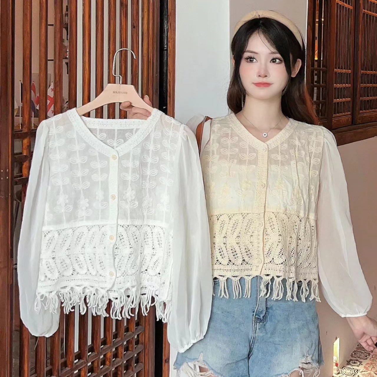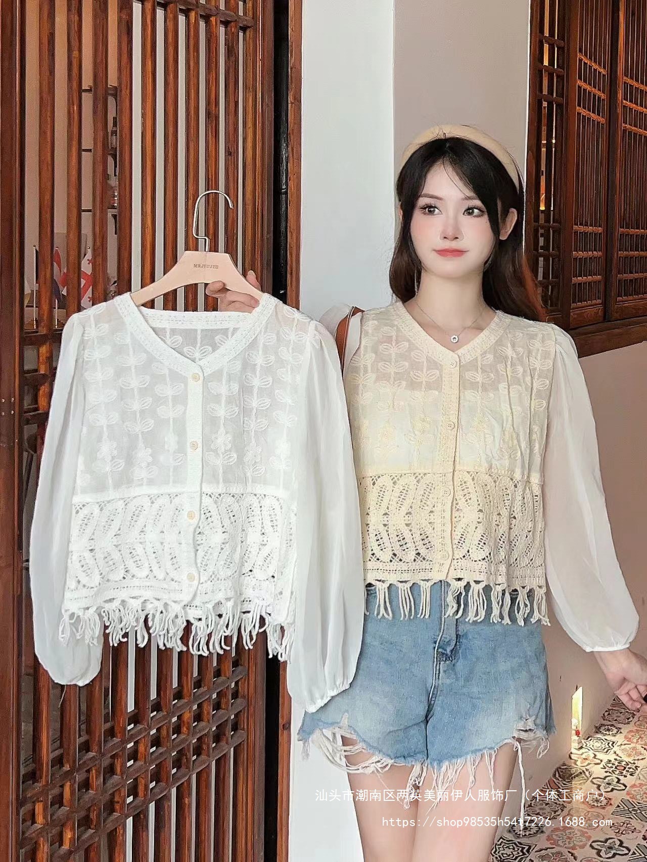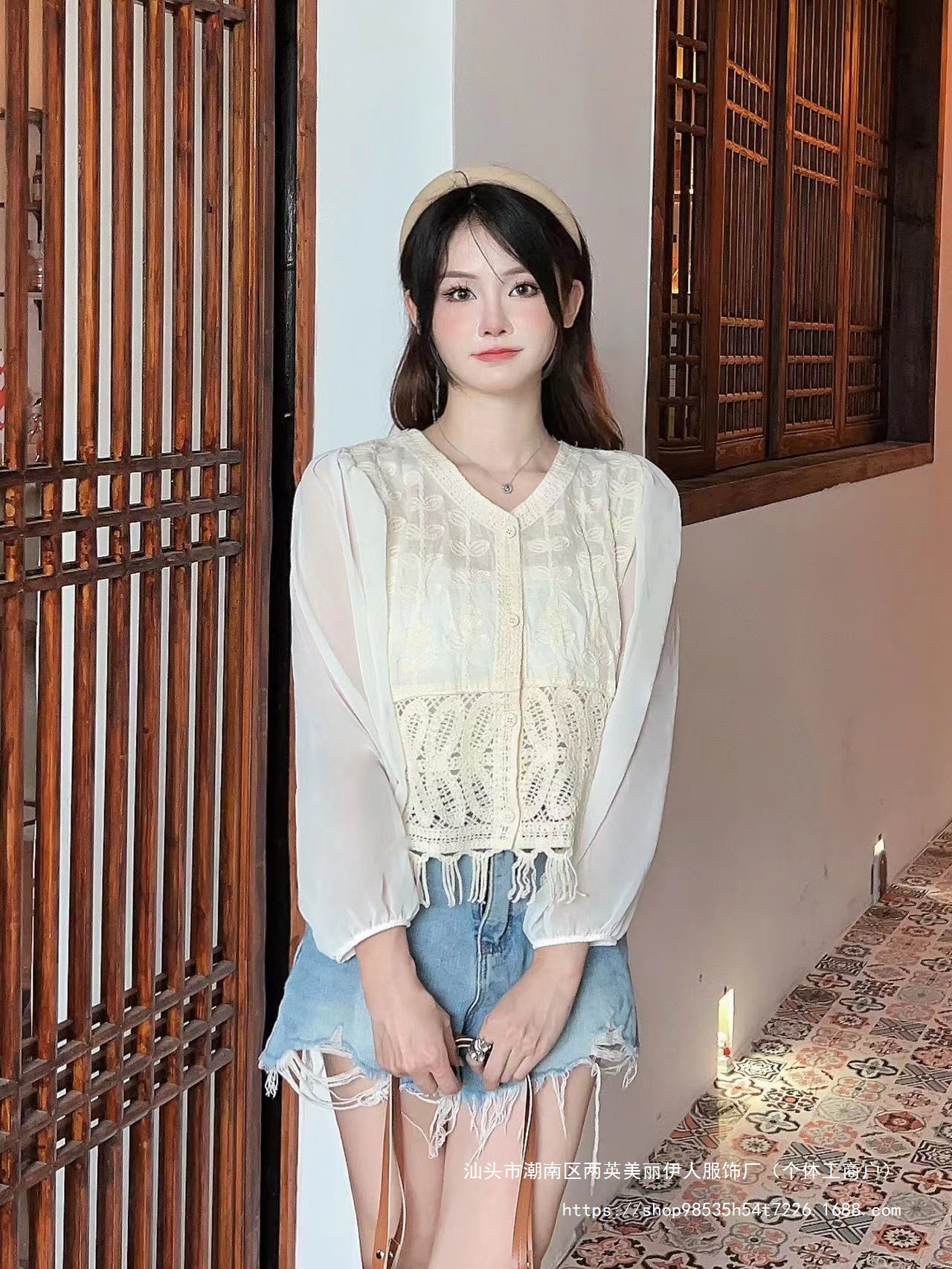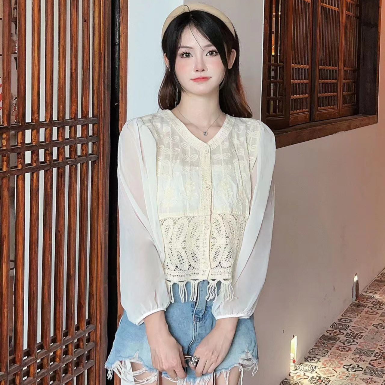 코튼 원사 뉴 에이지 감소 스티칭 V 넥 쉬폰 긴 소매 레이스 셔츠 민족 스타일 니트 스위트 랜턴 슬리브 탑