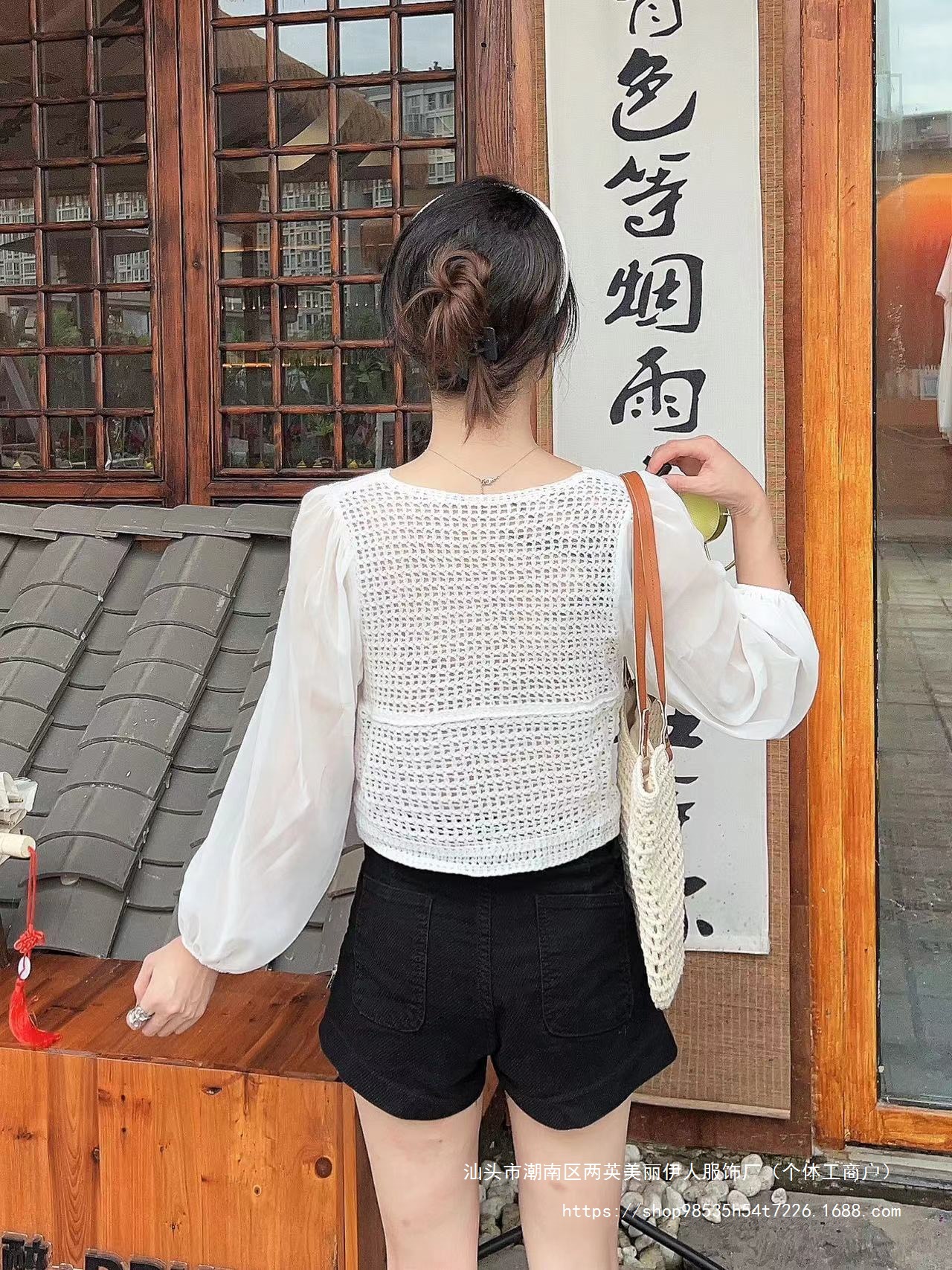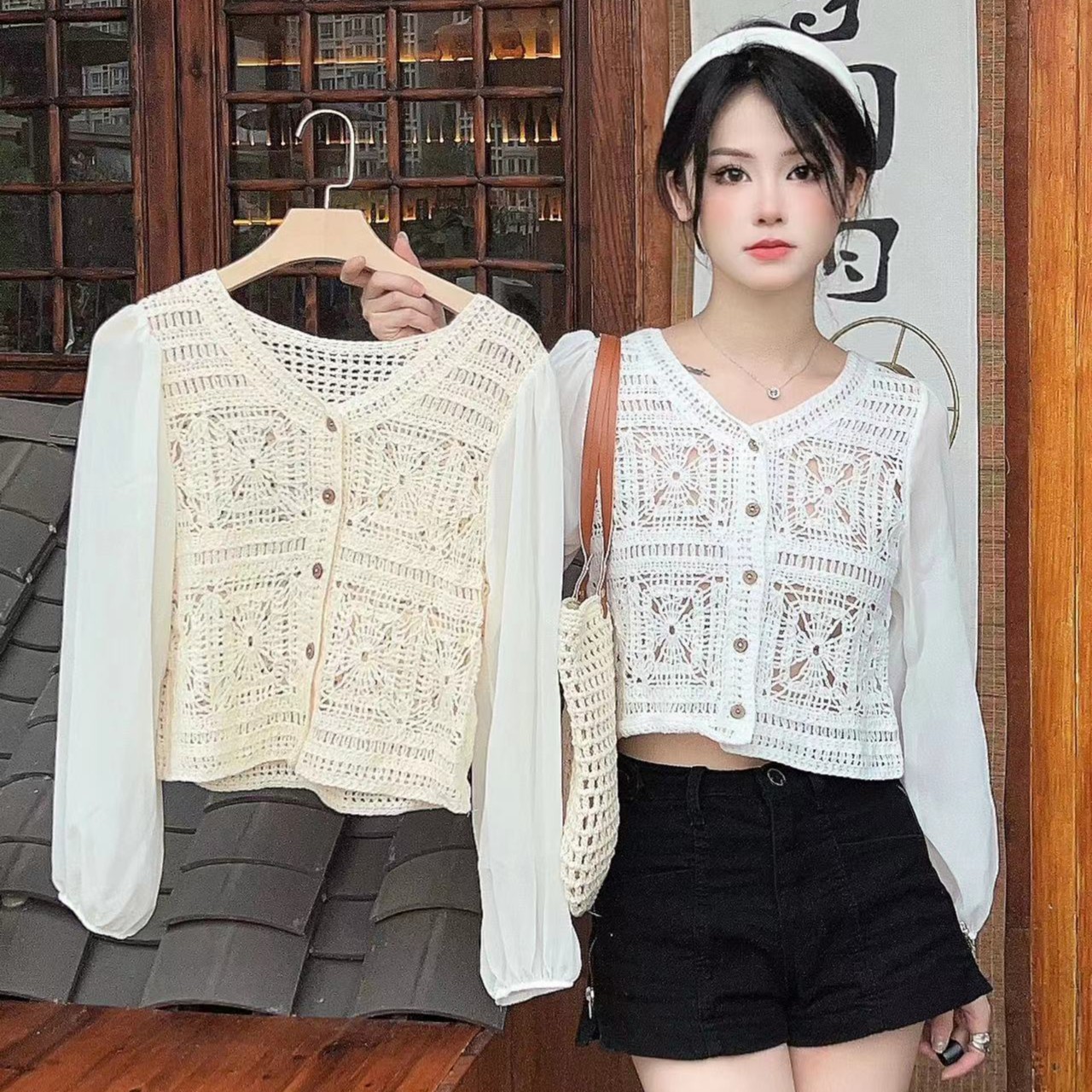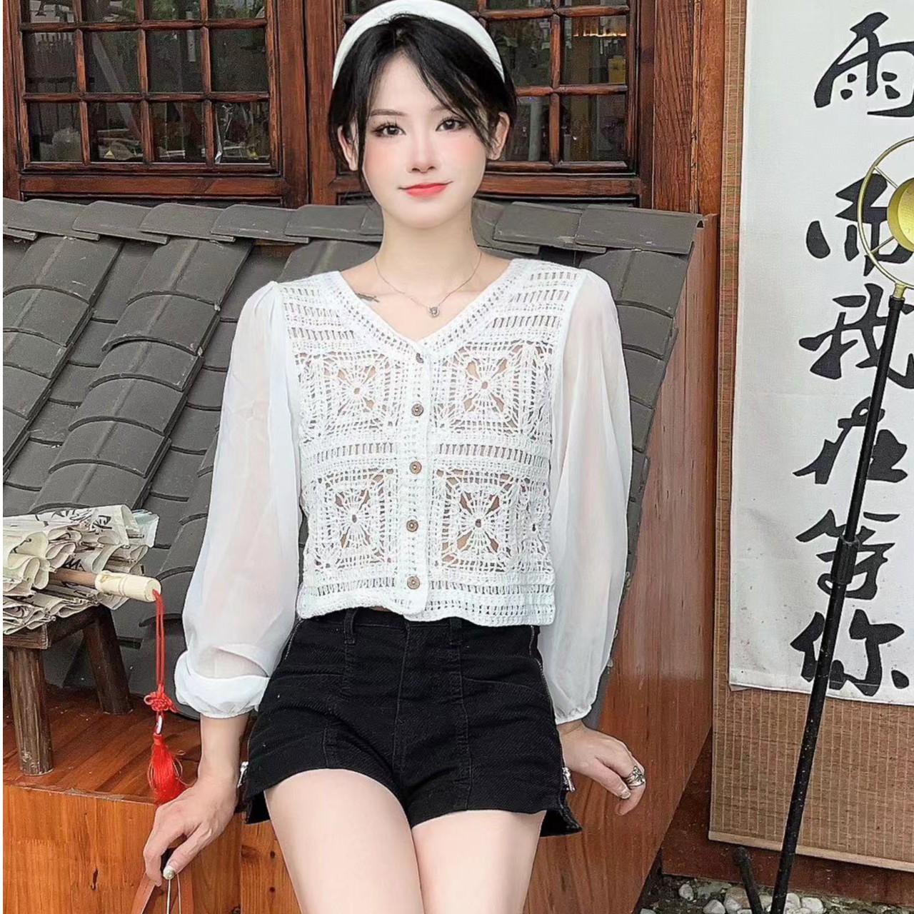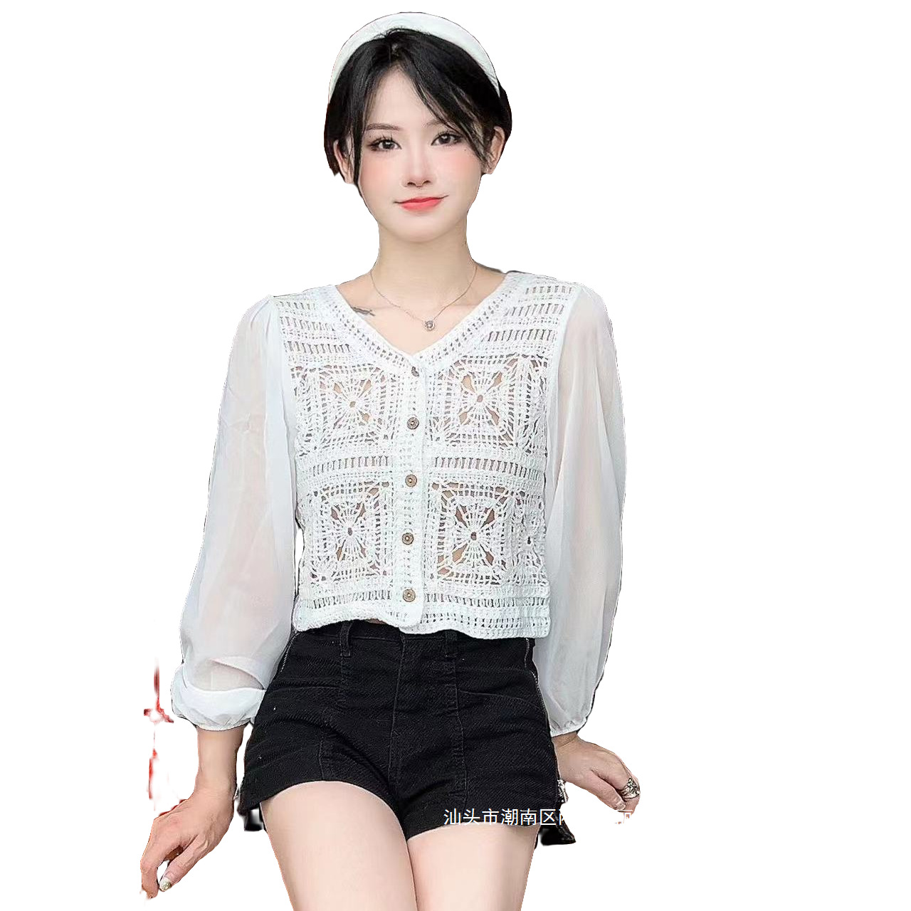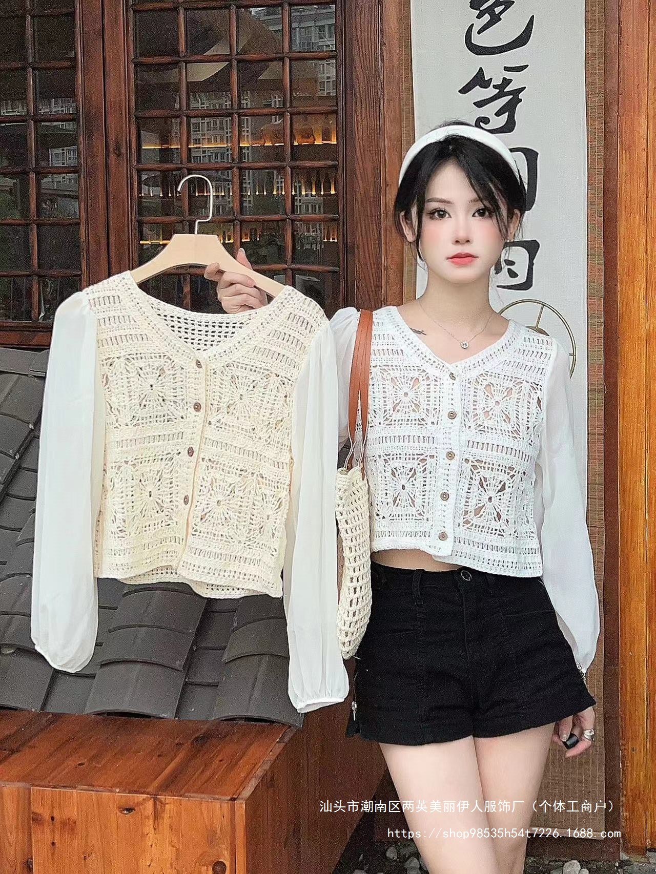 여름 새로운 스티칭 V 넥 쉬폰 셔츠 긴 소매 레이스 셔츠 니트 스위트 랜턴 슬리브 민족 스타일 탑스토어 가기