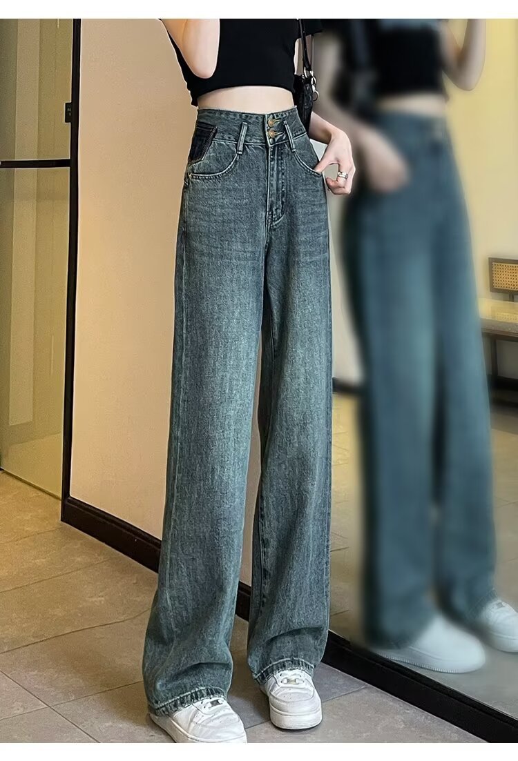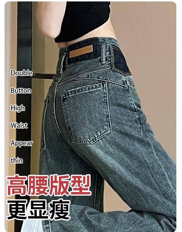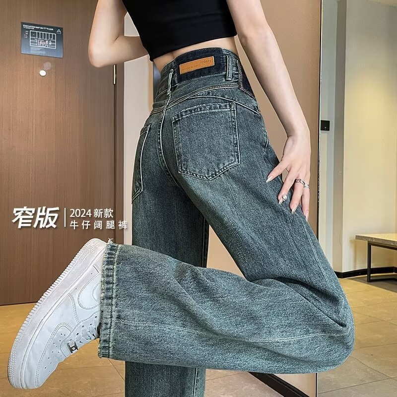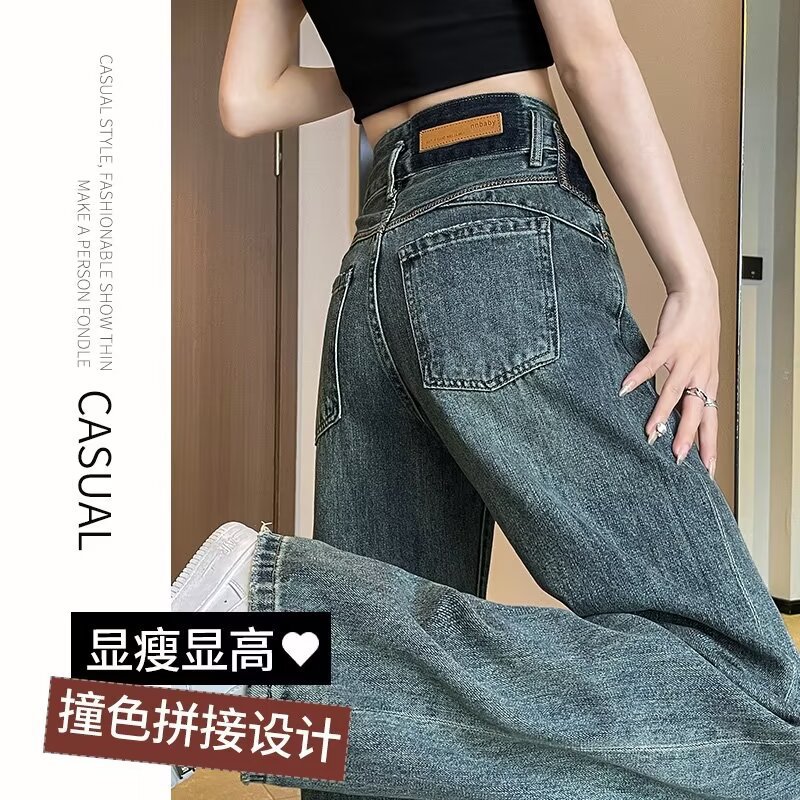 2024 새로운 좁은 넓은 다리 청바지 여성의 봄과 여름 새로운 대비 컬러 높은 허리 디자인 감각 느슨한 스트레이트 바지스토어 가기