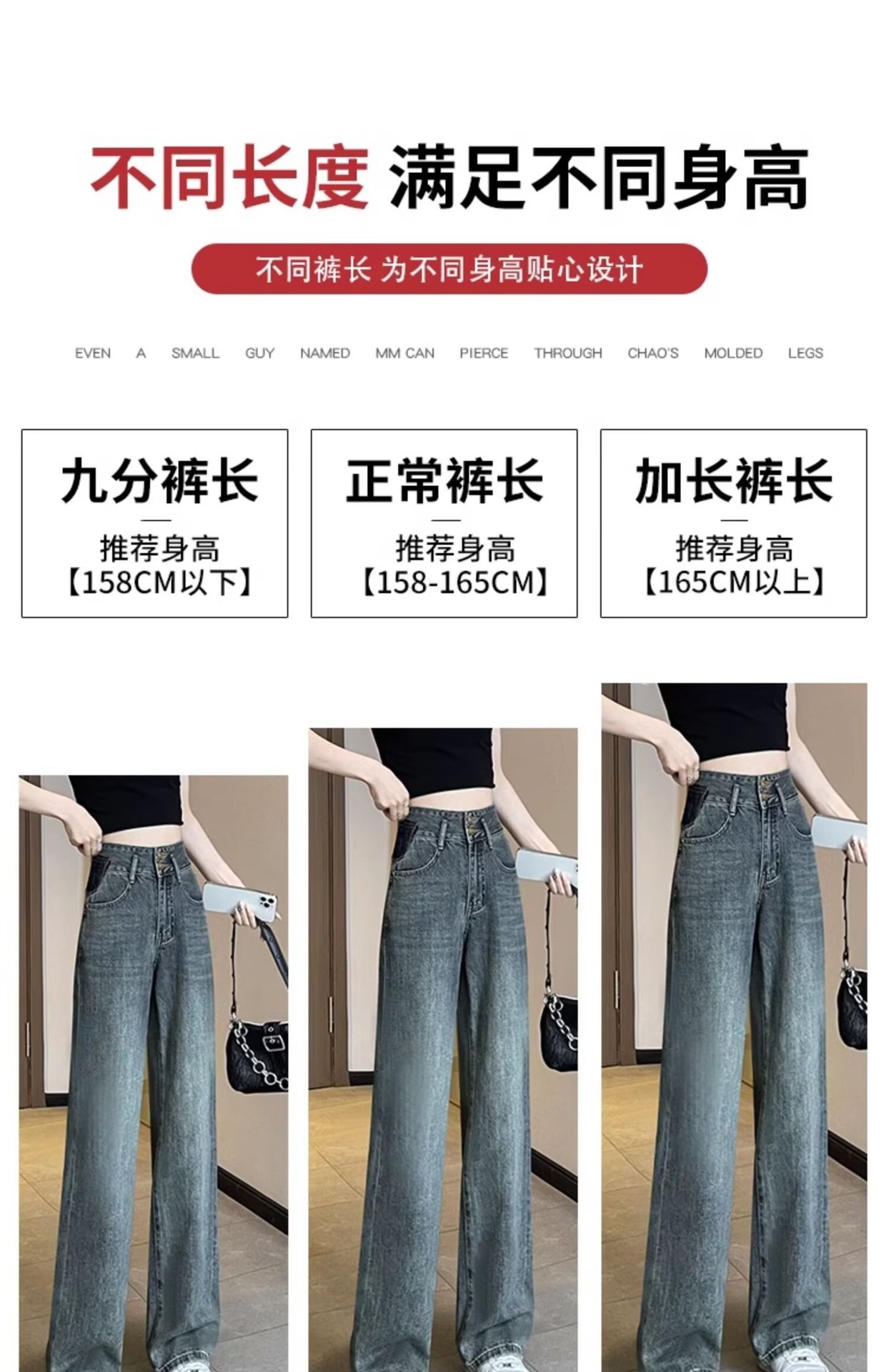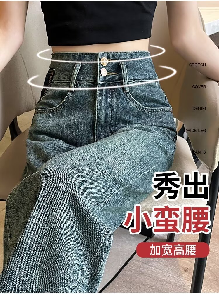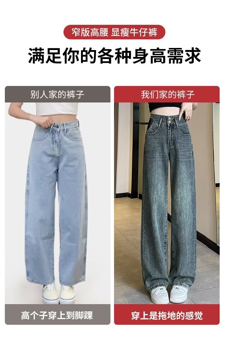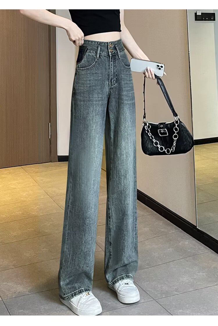 2024 새로운 좁은 넓은 다리 청바지 여성의 봄과 여름 새로운 대비 컬러 높은 허리 디자인 감각 느슨한 스트레이트 바지스토어 가기