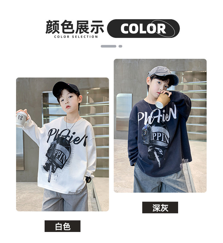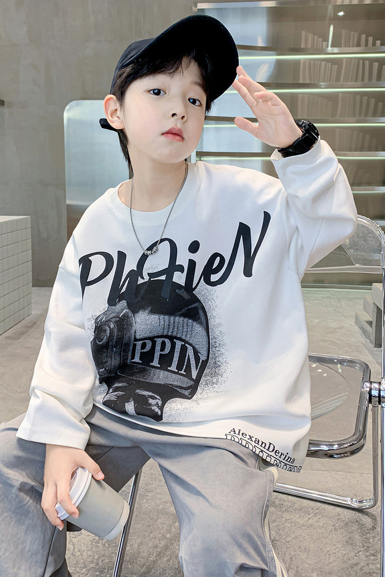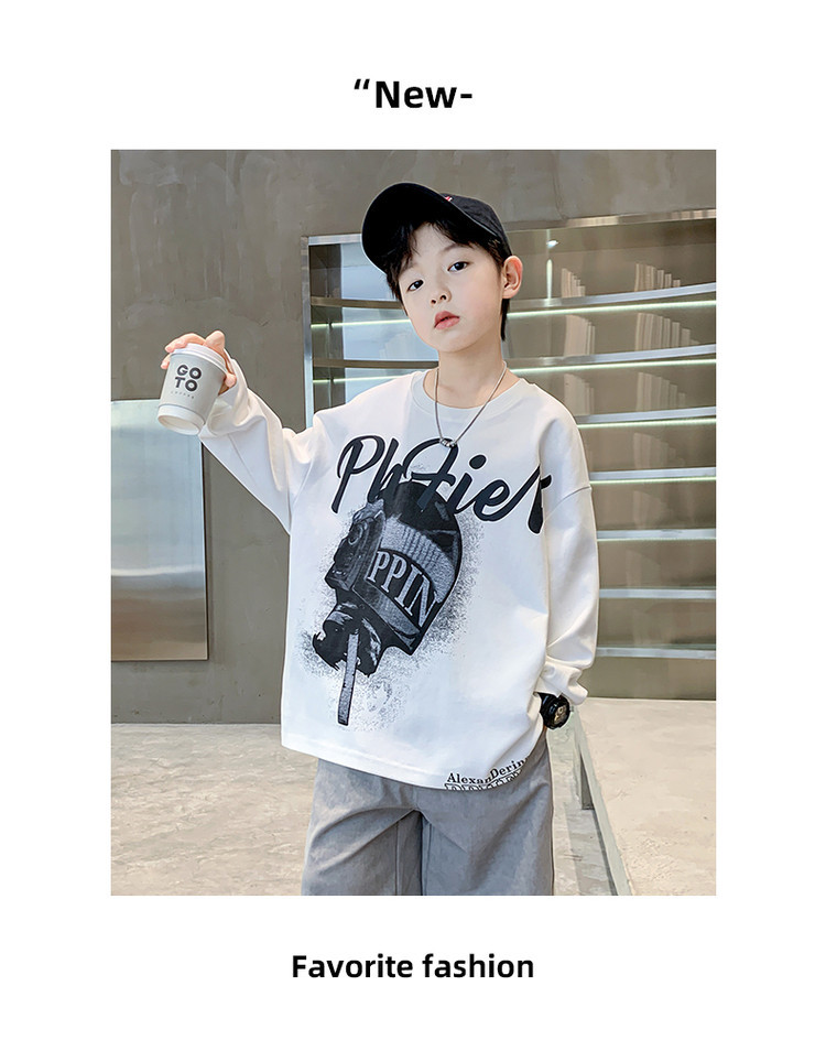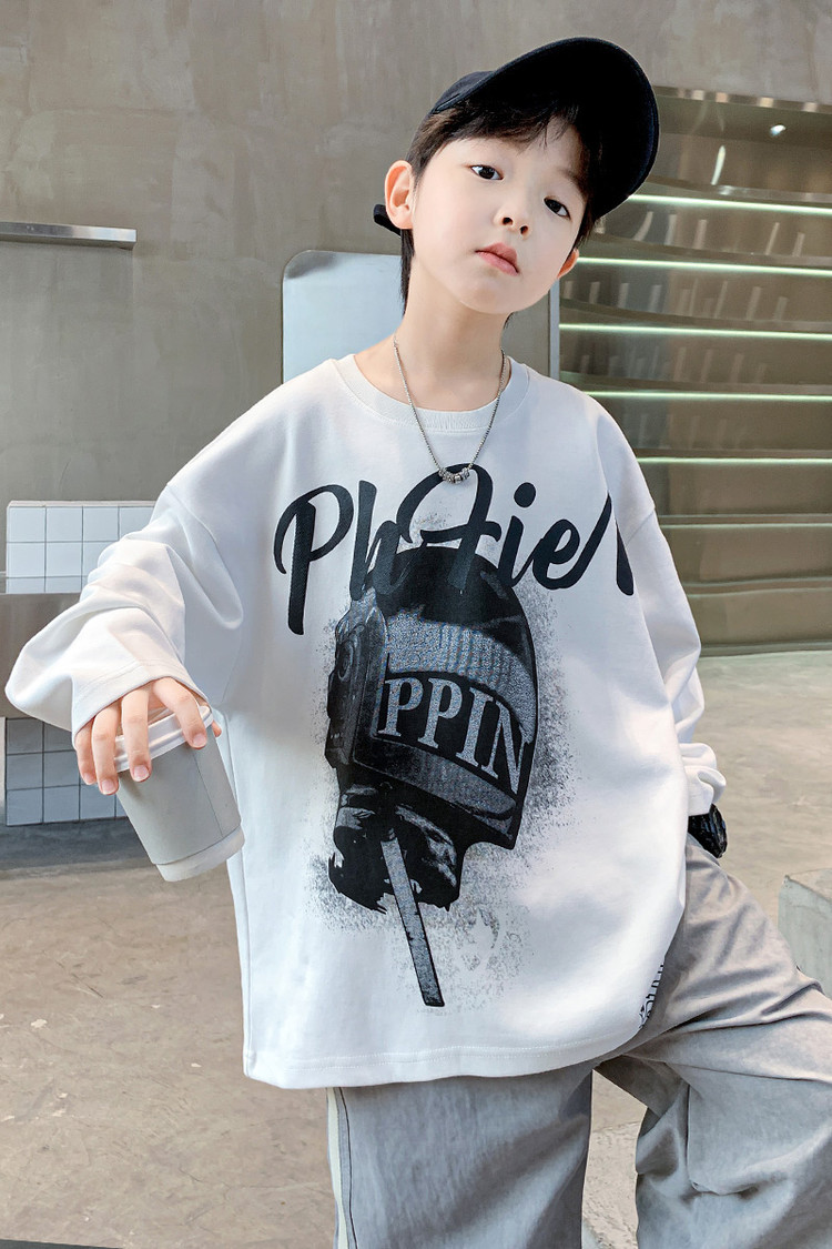 한국 트렌디 한 어린이 티셔츠 유행 봄과 가을 소년의 둥근 목 긴팔 독특한 힙합 스포츠 느슨한 올매치 탑