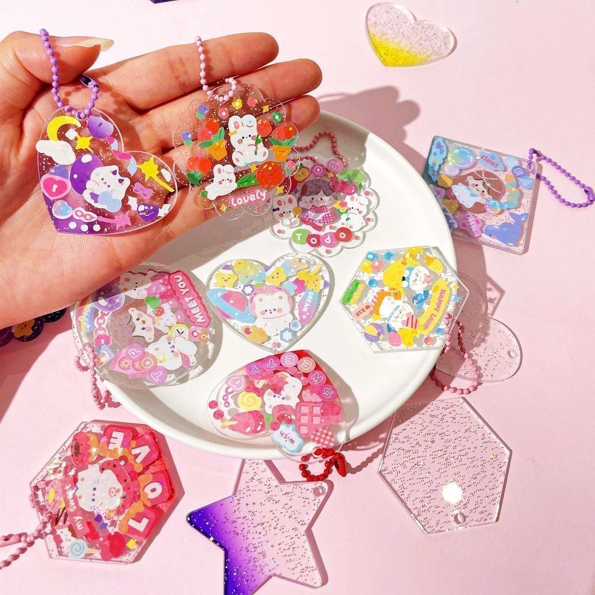 구척 50 100 스티커 세트 아크릴 손 계정 작은 디스크 그라디언트 투명 밝은 파우더 DIY 키 체인스토어 가기