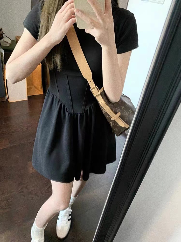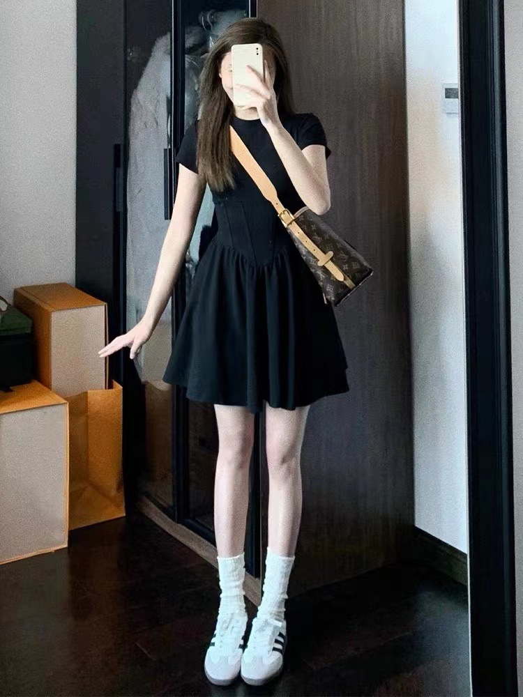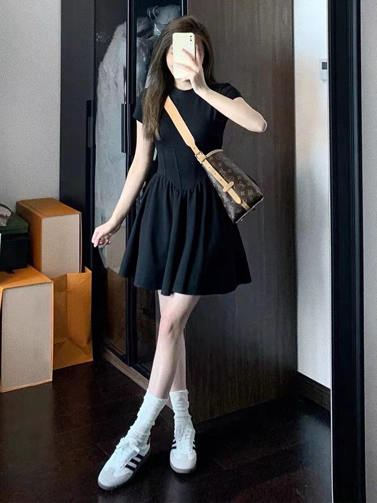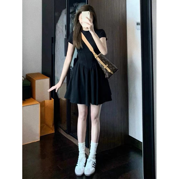 국경 간 여름 프랑스 헵번 스타일 작은 슬림 허리 검은 원피스 여성 짧은 치마