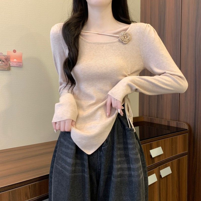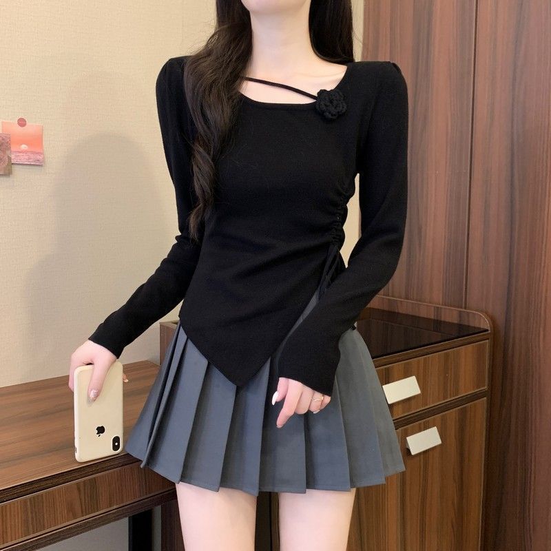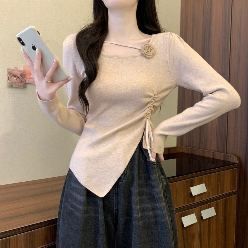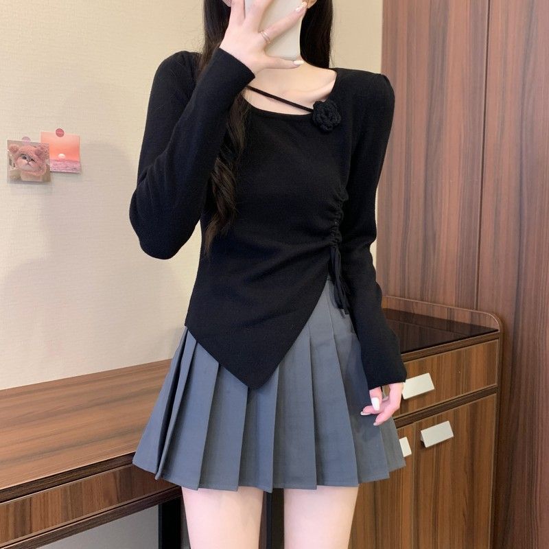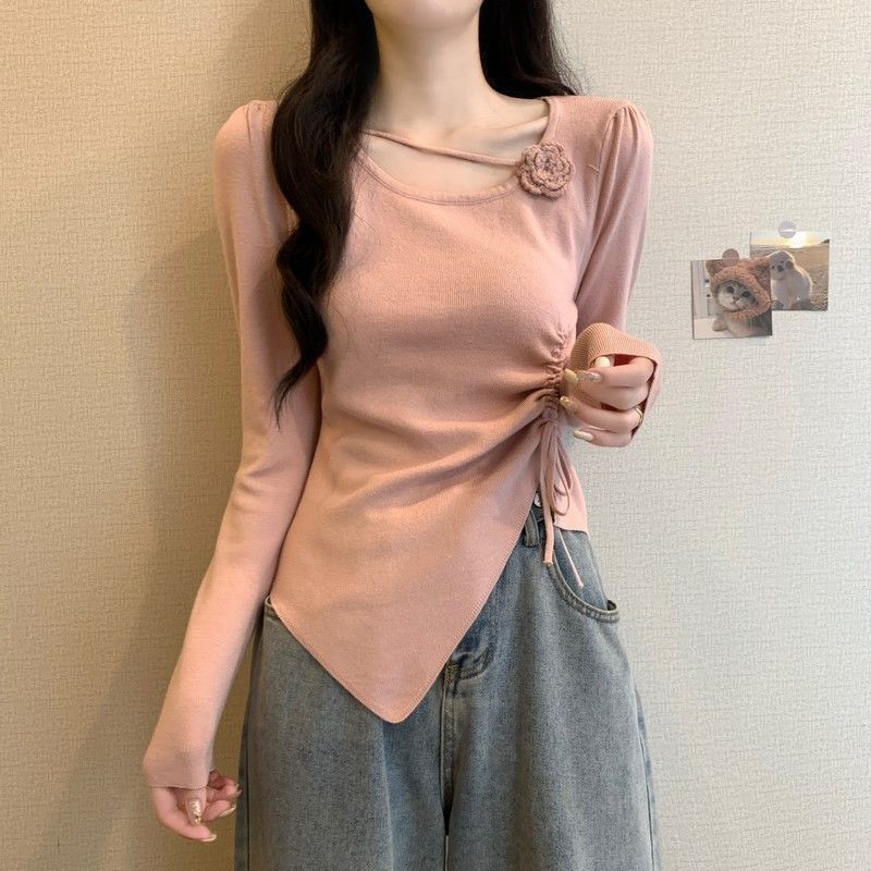 도파민 레드 3 차원 꽃 긴팔 니트 스웨터 여성의 이른 가을 사이드 드로우 스트링 허리 슬리밍 아우터 착용 작은 탑