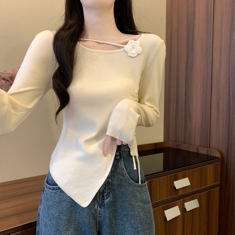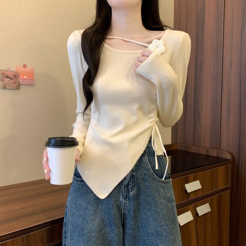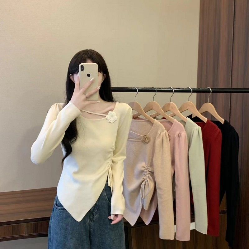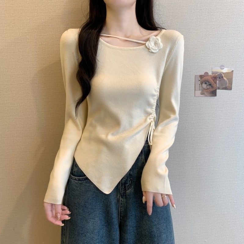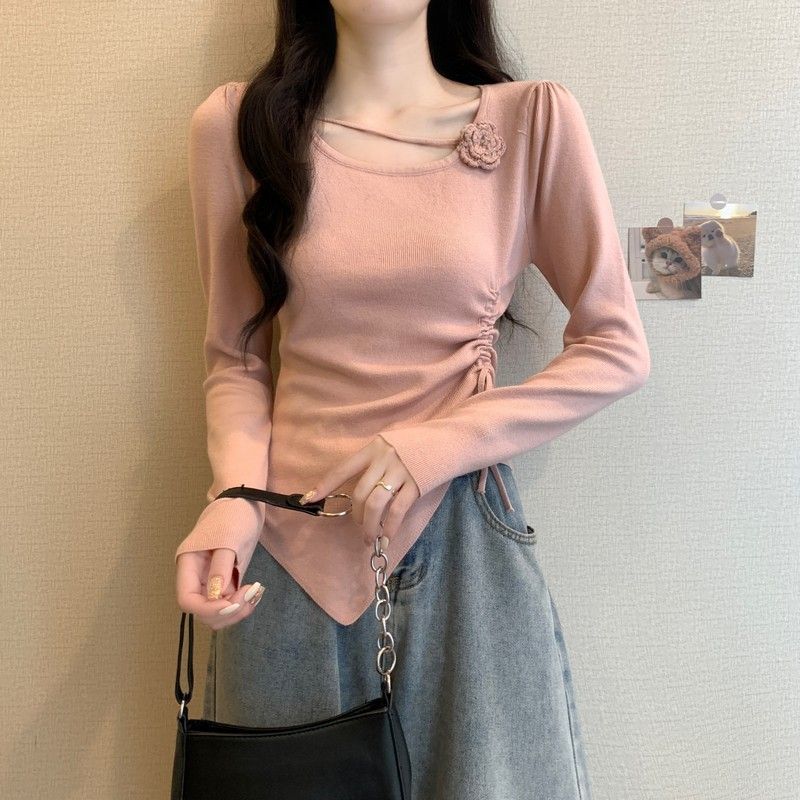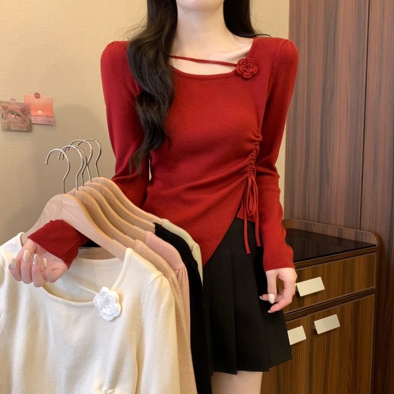 도파민 레드 3 차원 꽃 긴팔 니트 스웨터 여성의 이른 가을 사이드 드로우 스트링 허리 슬리밍 아우터 착용 작은 탑스토어 가기