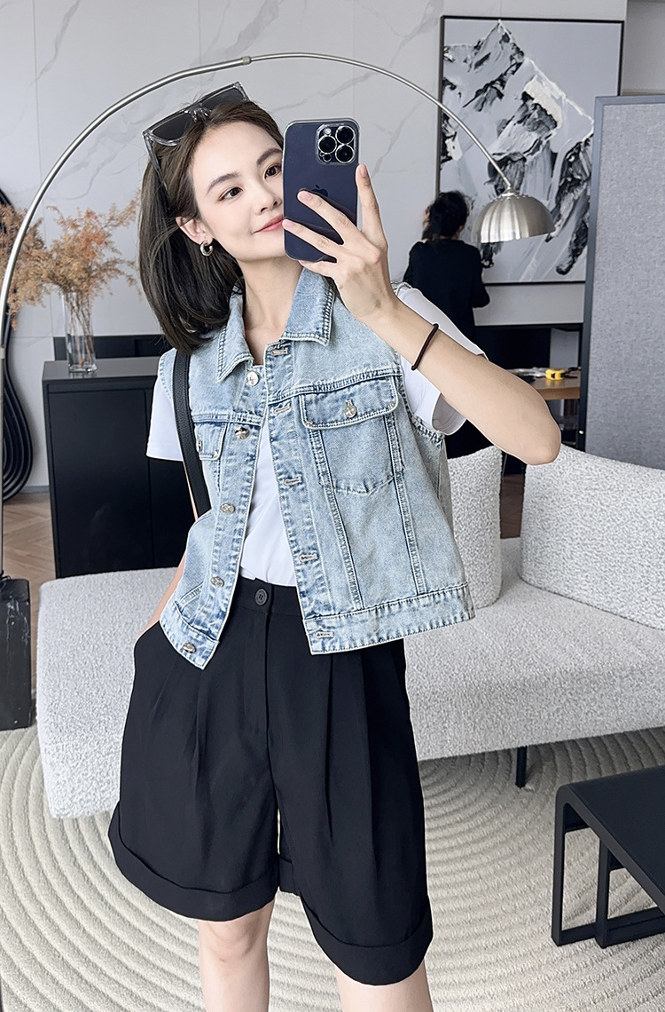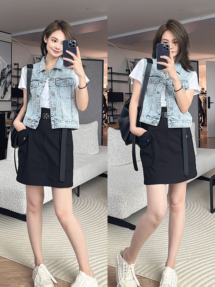 샤오 샹 스타일 데님 조끼 여성 2025 새로운 한국 스타일 디자인 센스 중공업 워시 워터 레트로 실버 버클 스트레이트 말 클립 트렌디스토어 가기