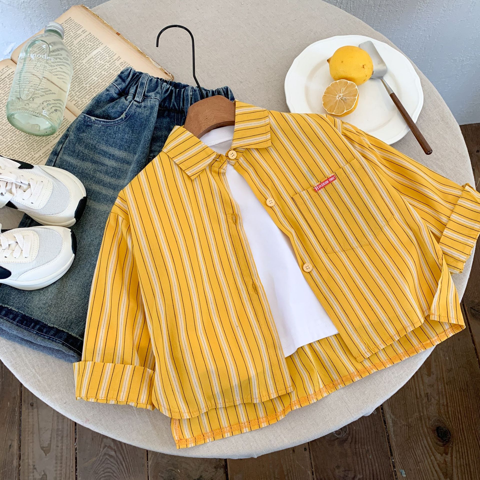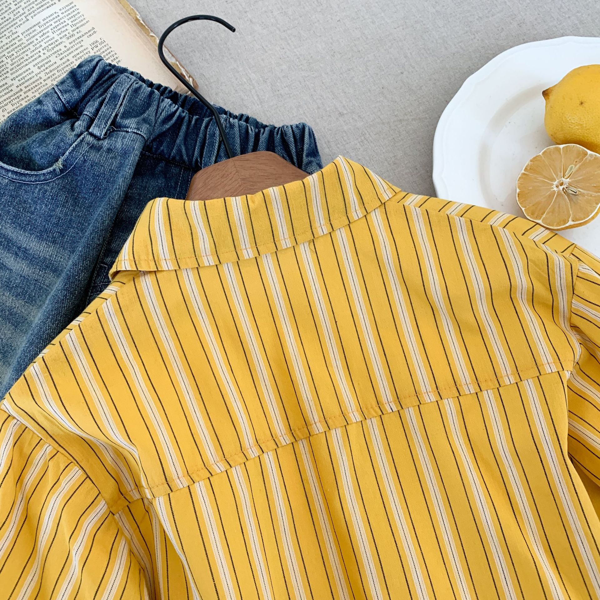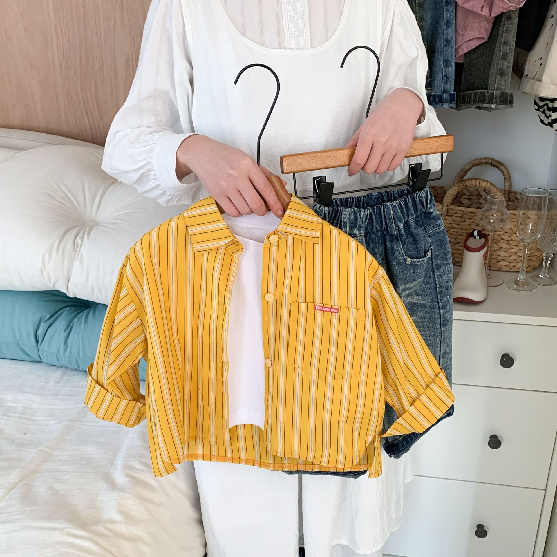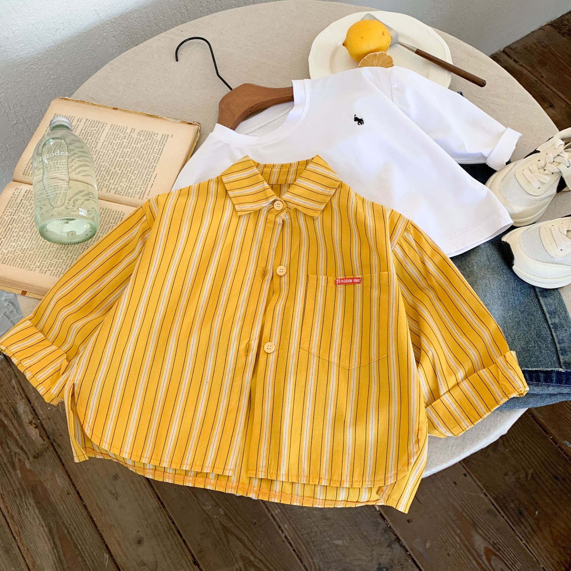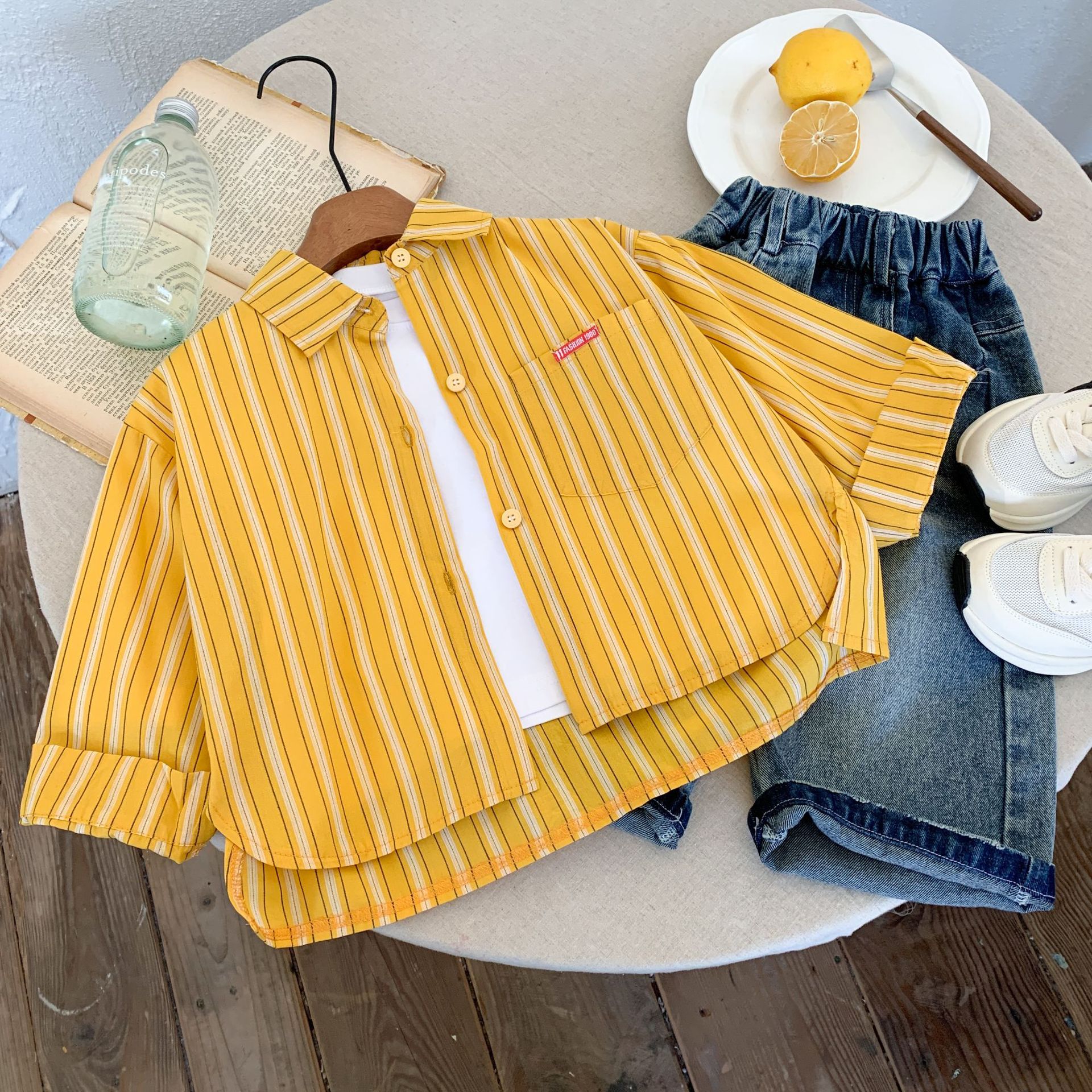 스팟 아동용 봄 줄무늬 셔츠 일본과 한국의 노란색 줄무늬 라벨 셔츠 소년 베이비 스타일 재킷 소녀 카디건