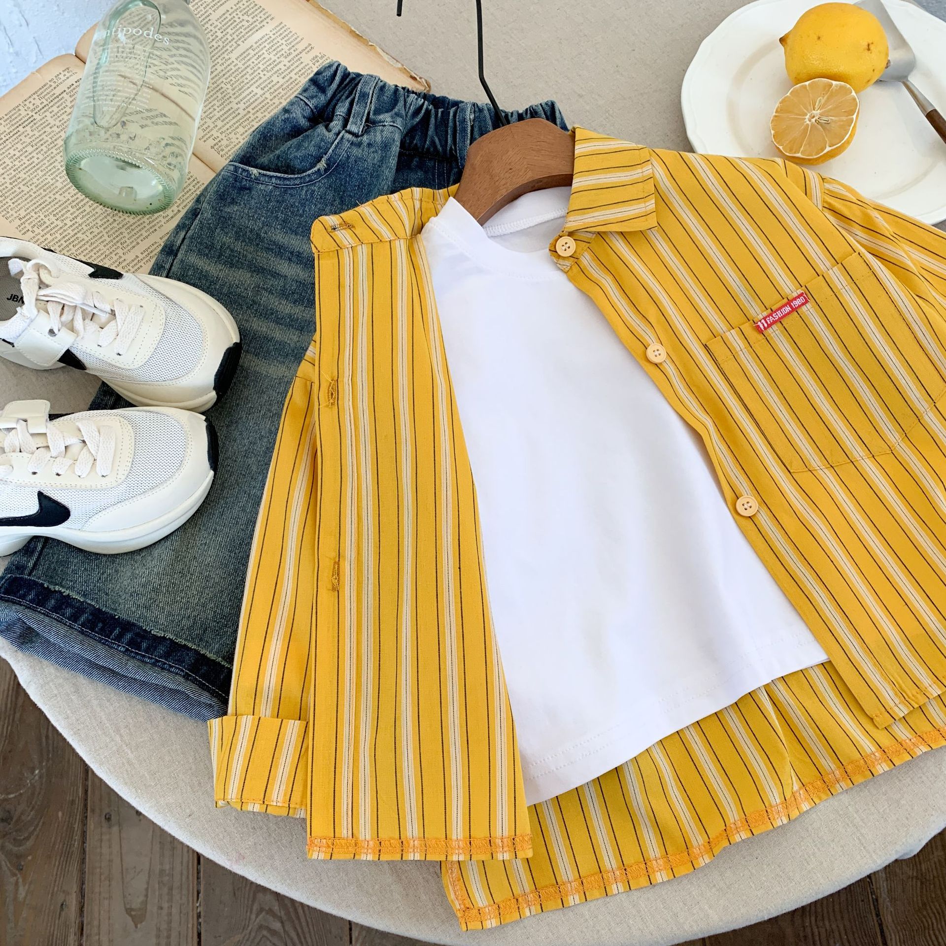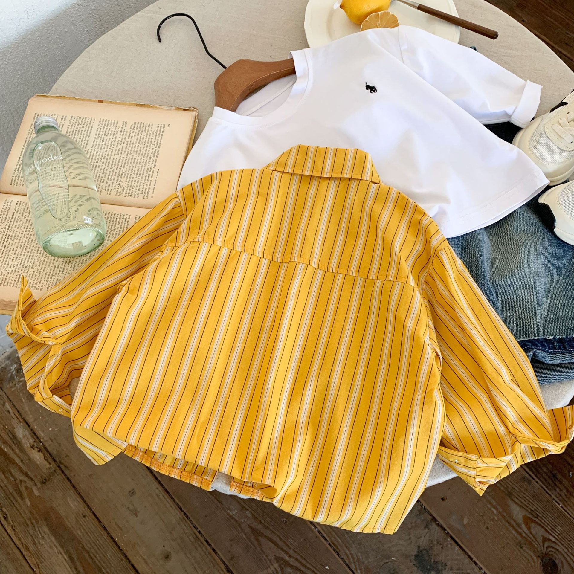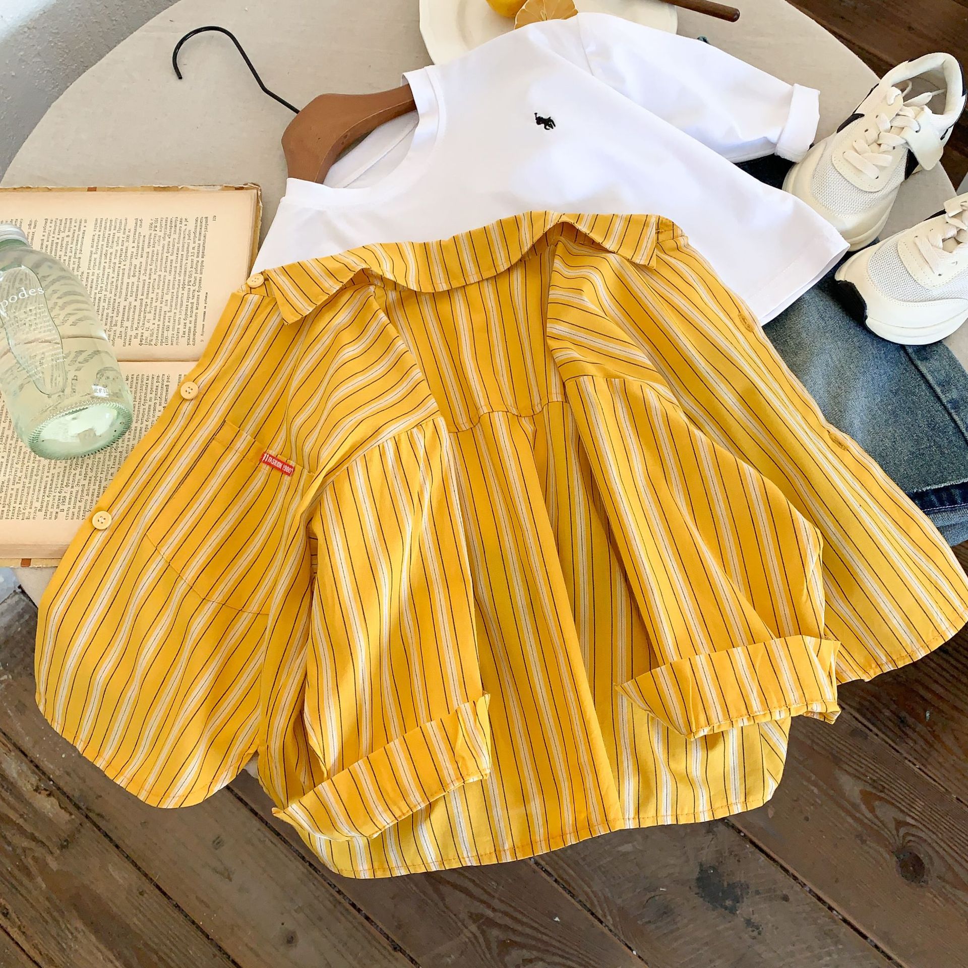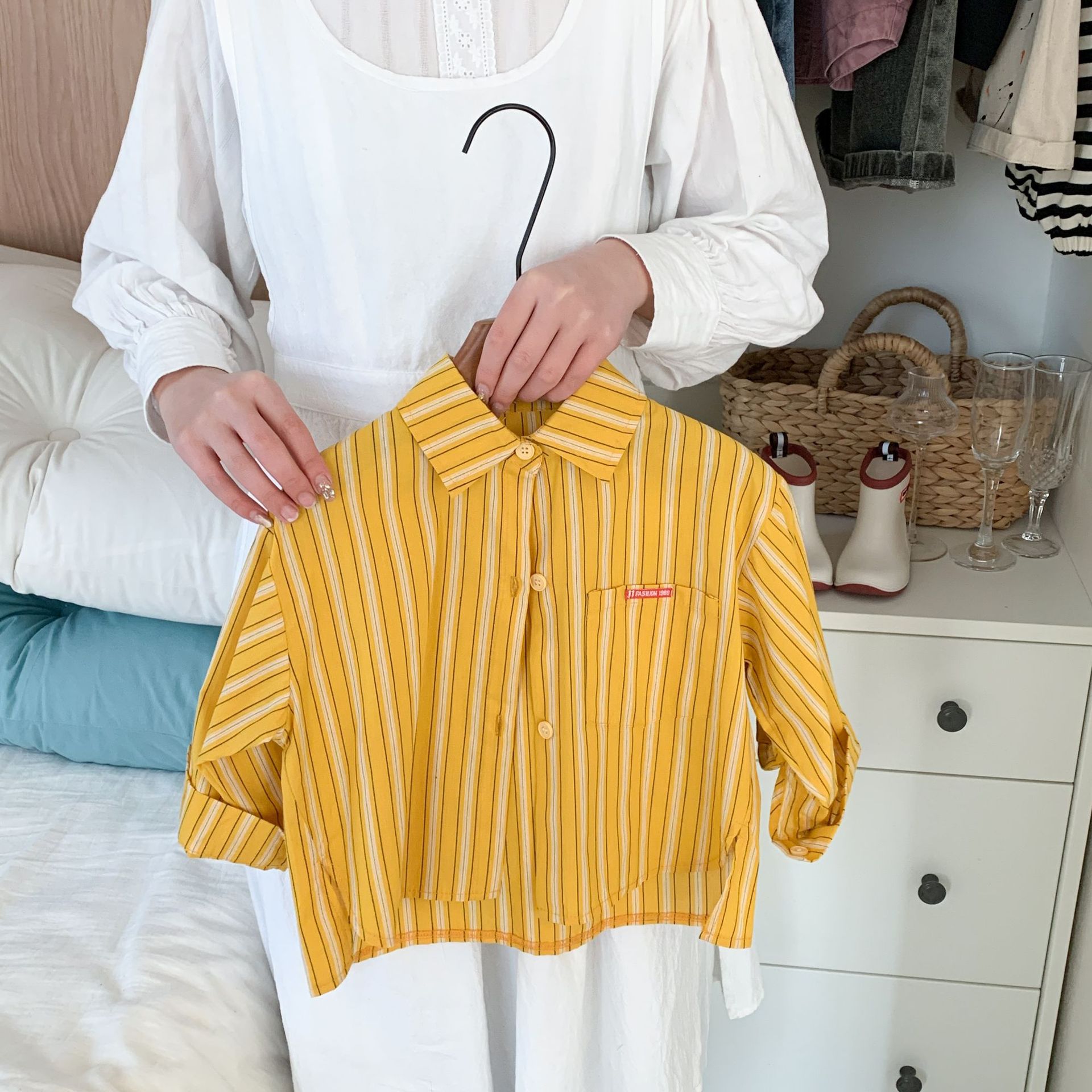 스팟 아동용 봄 줄무늬 셔츠 일본과 한국의 노란색 줄무늬 라벨 셔츠 소년 베이비 스타일 재킷 소녀 카디건