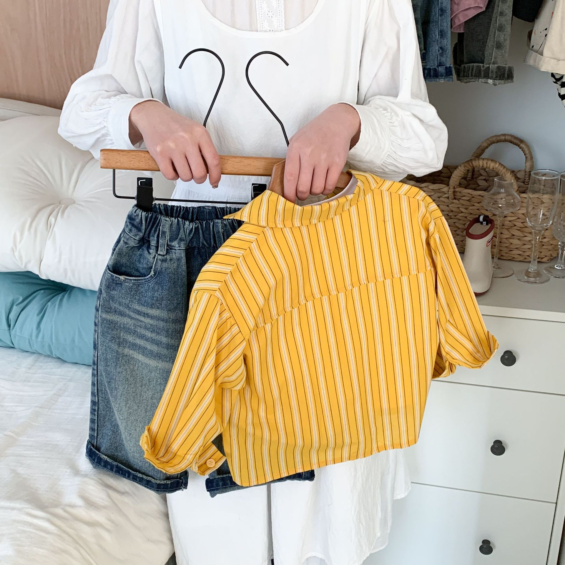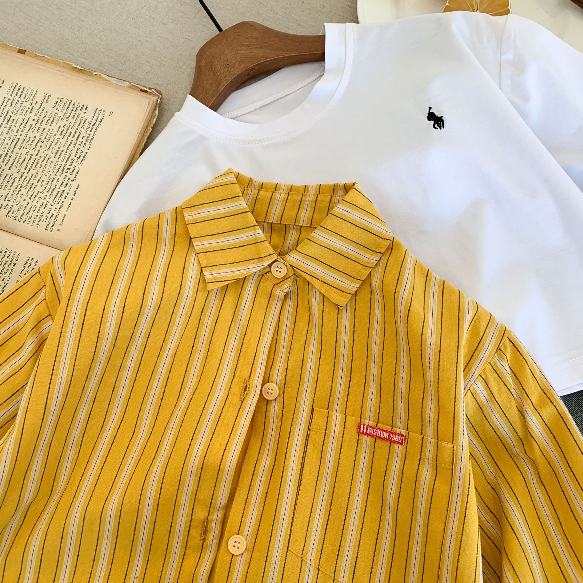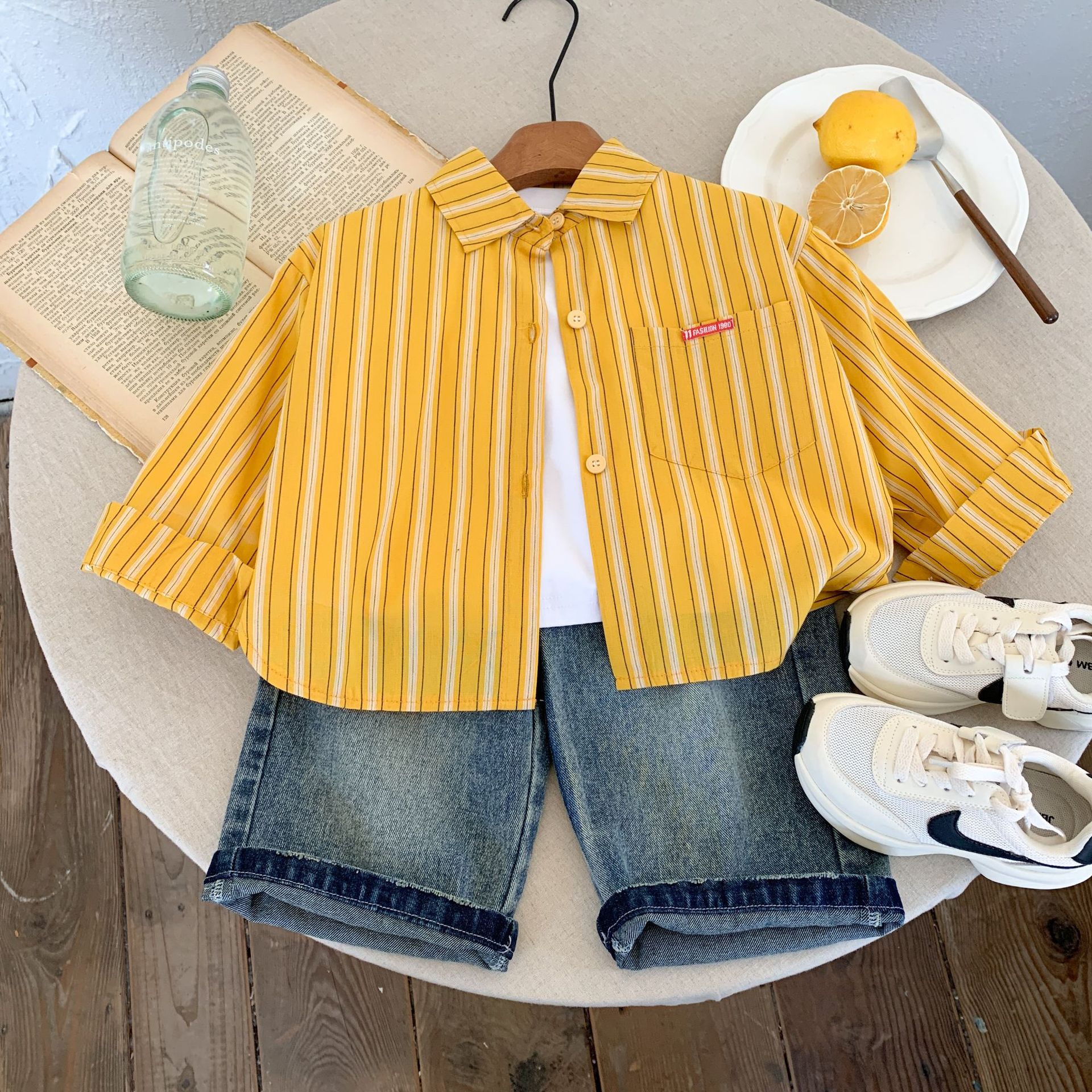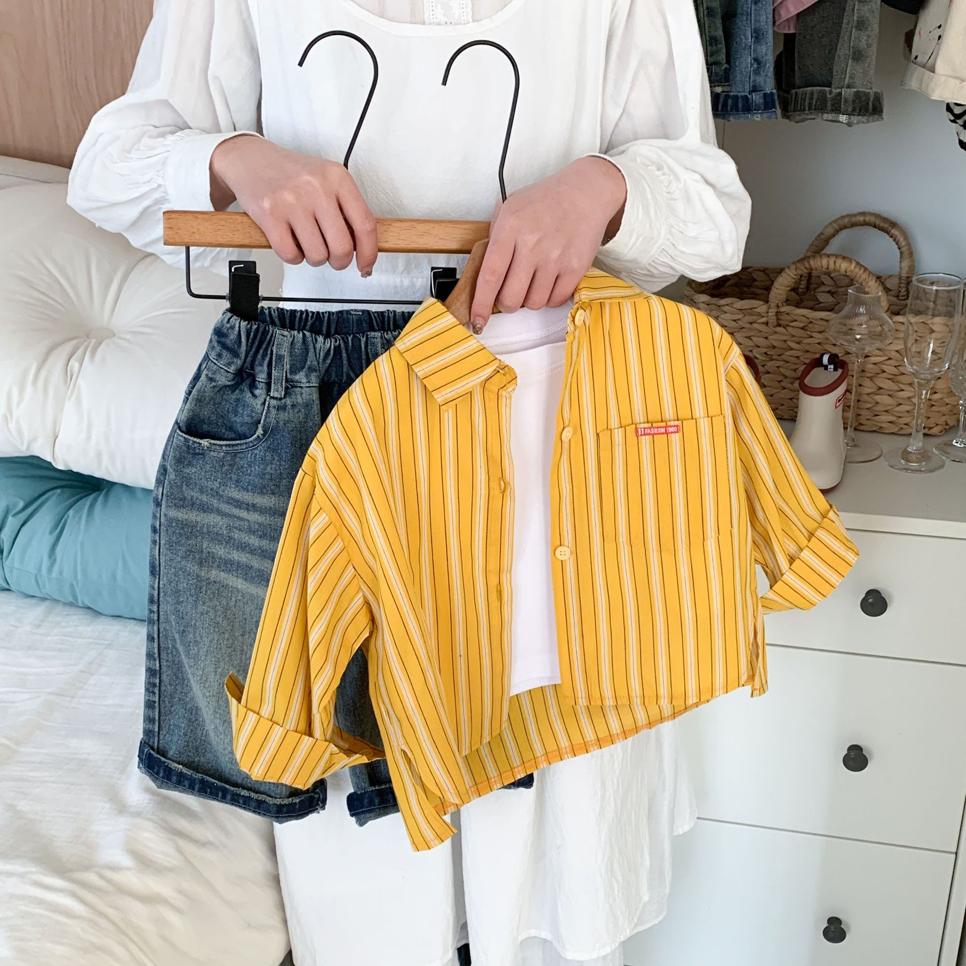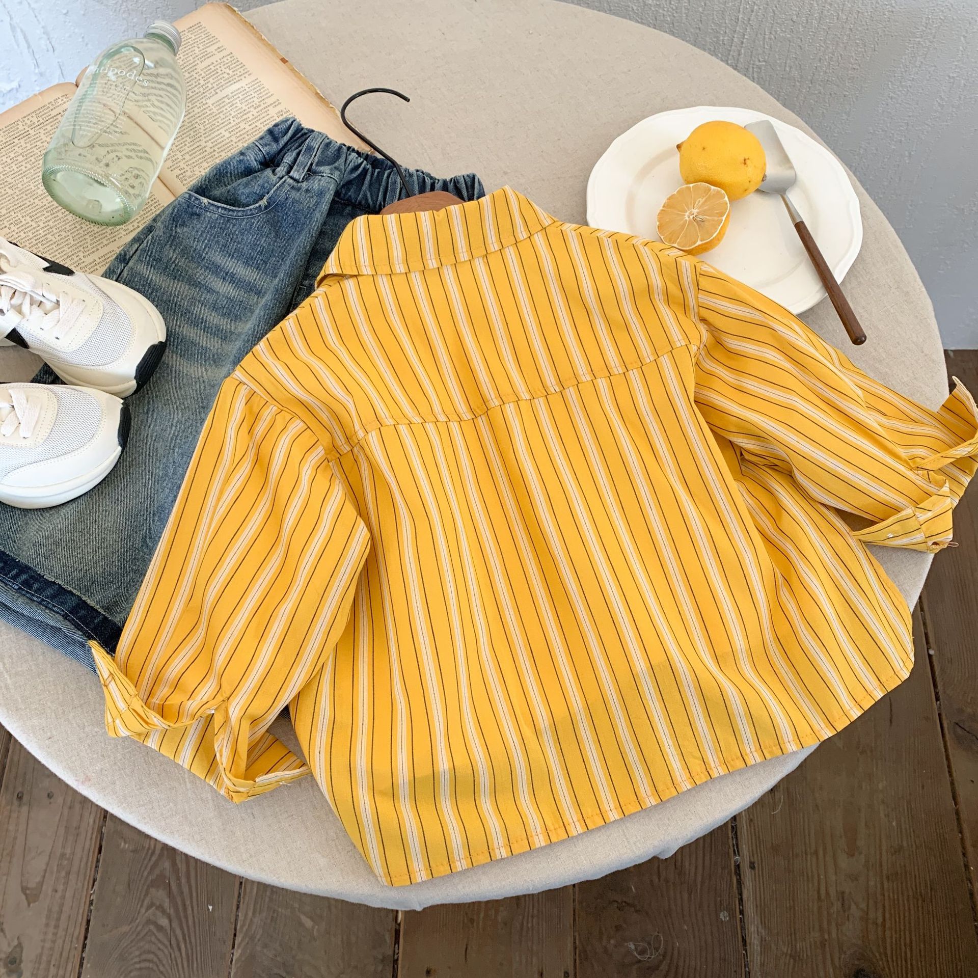 스팟 아동용 봄 줄무늬 셔츠 일본과 한국의 노란색 줄무늬 라벨 셔츠 소년 베이비 스타일 재킷 소녀 카디건