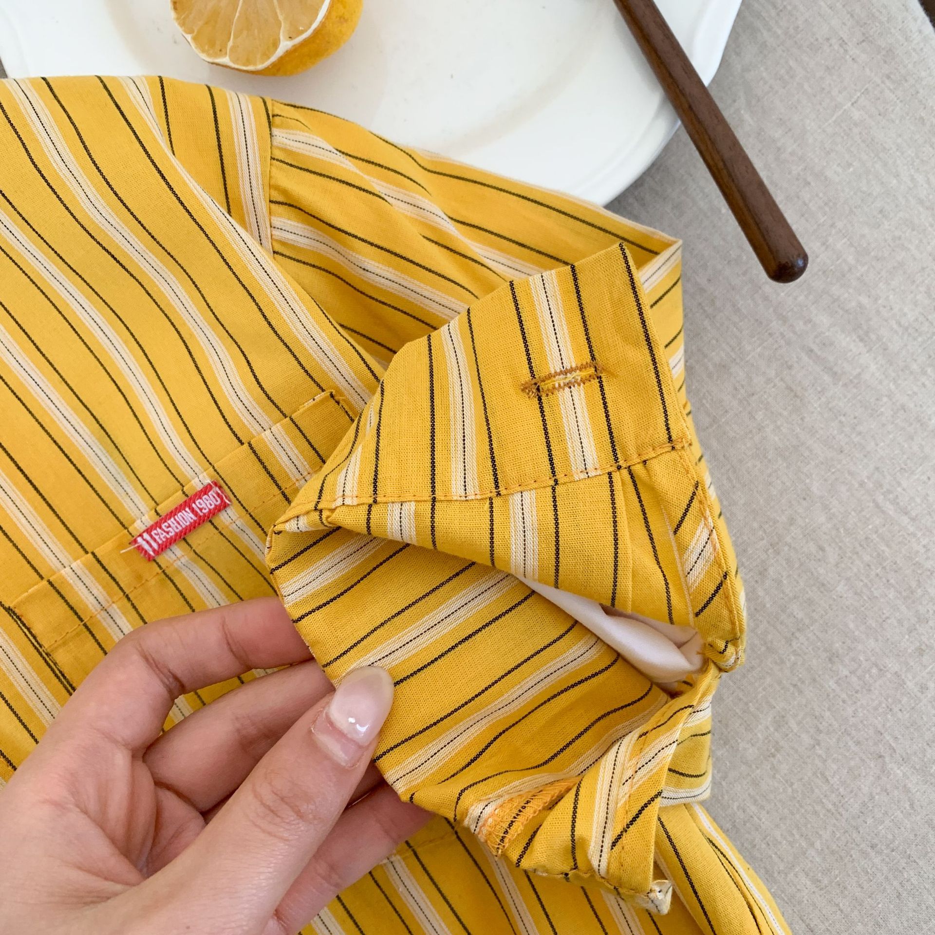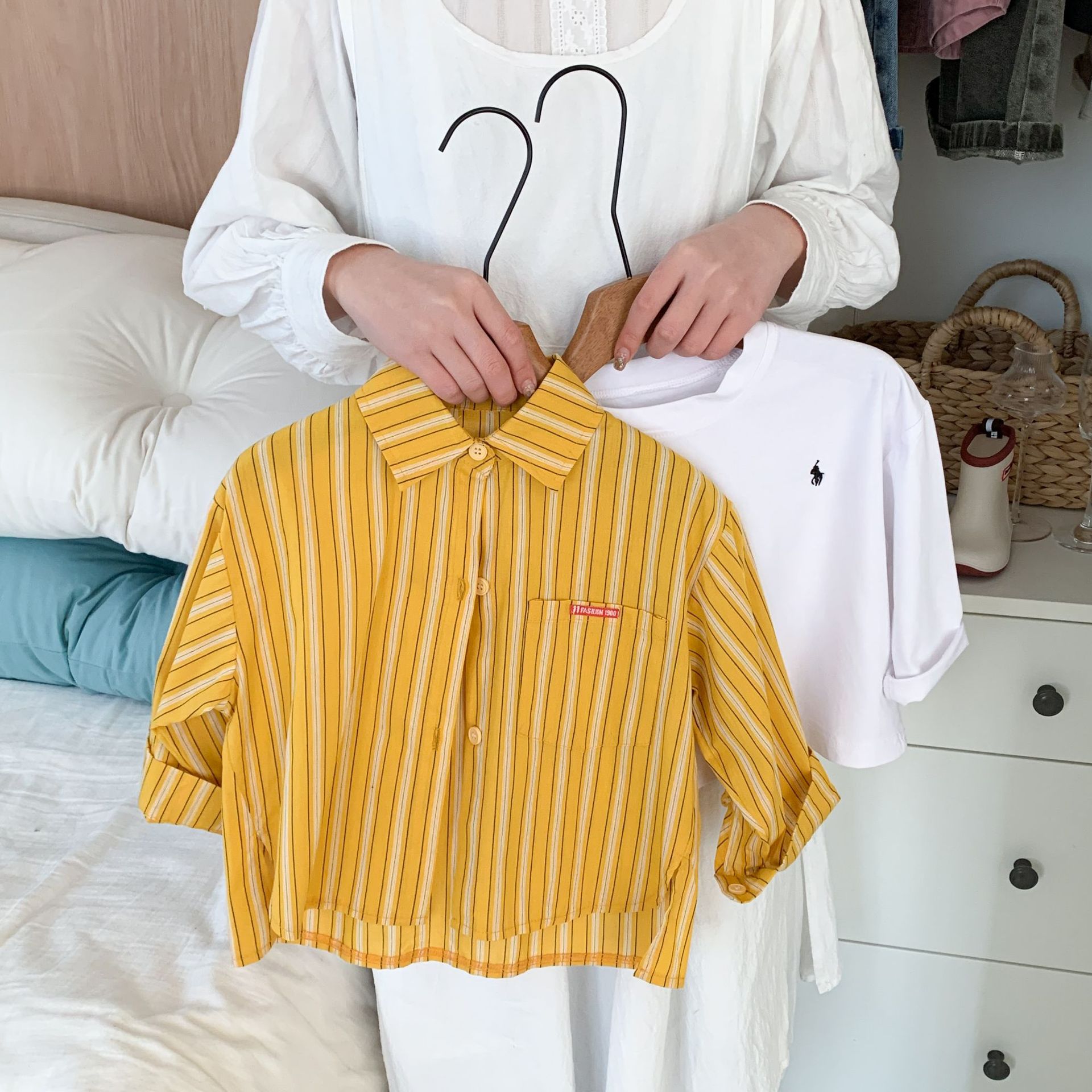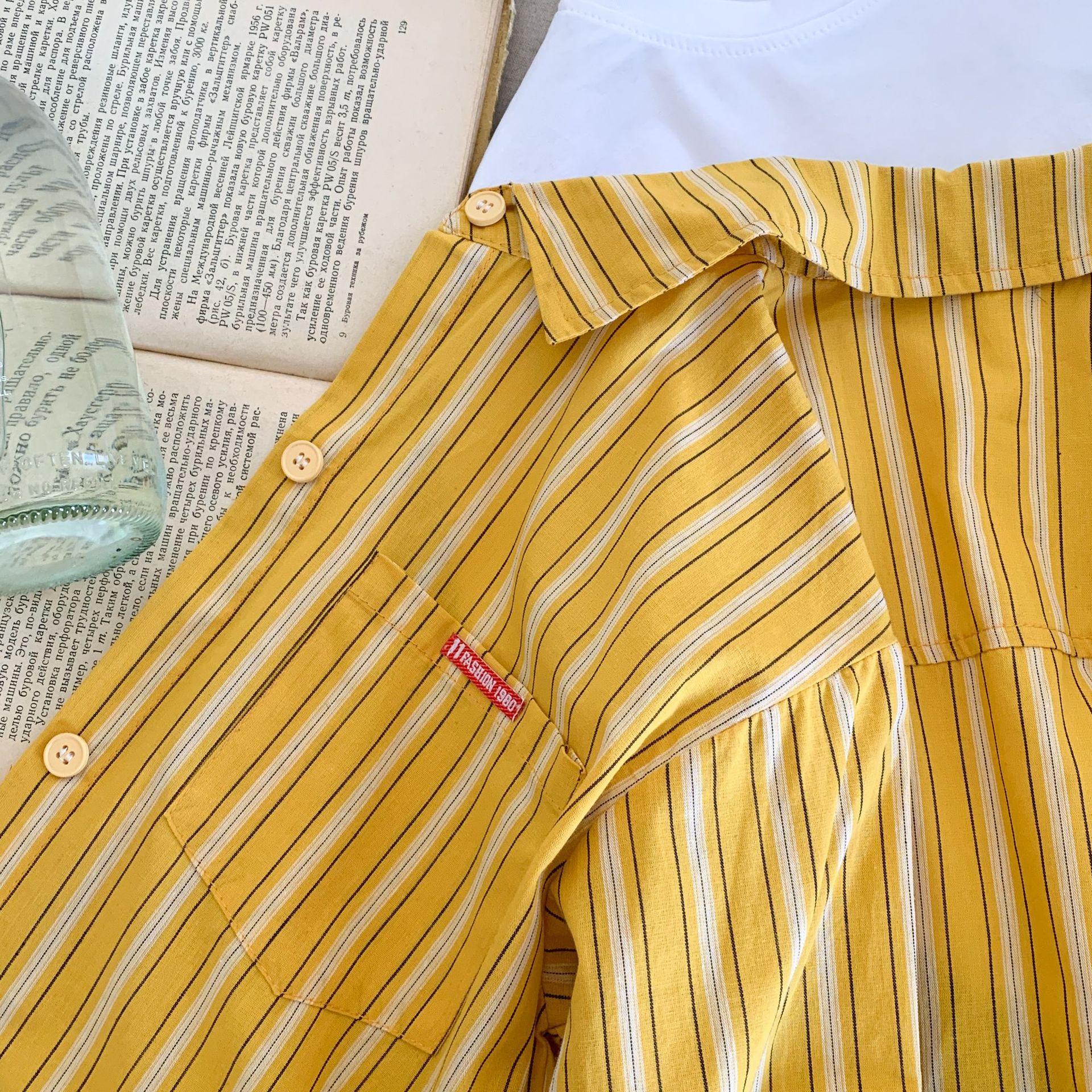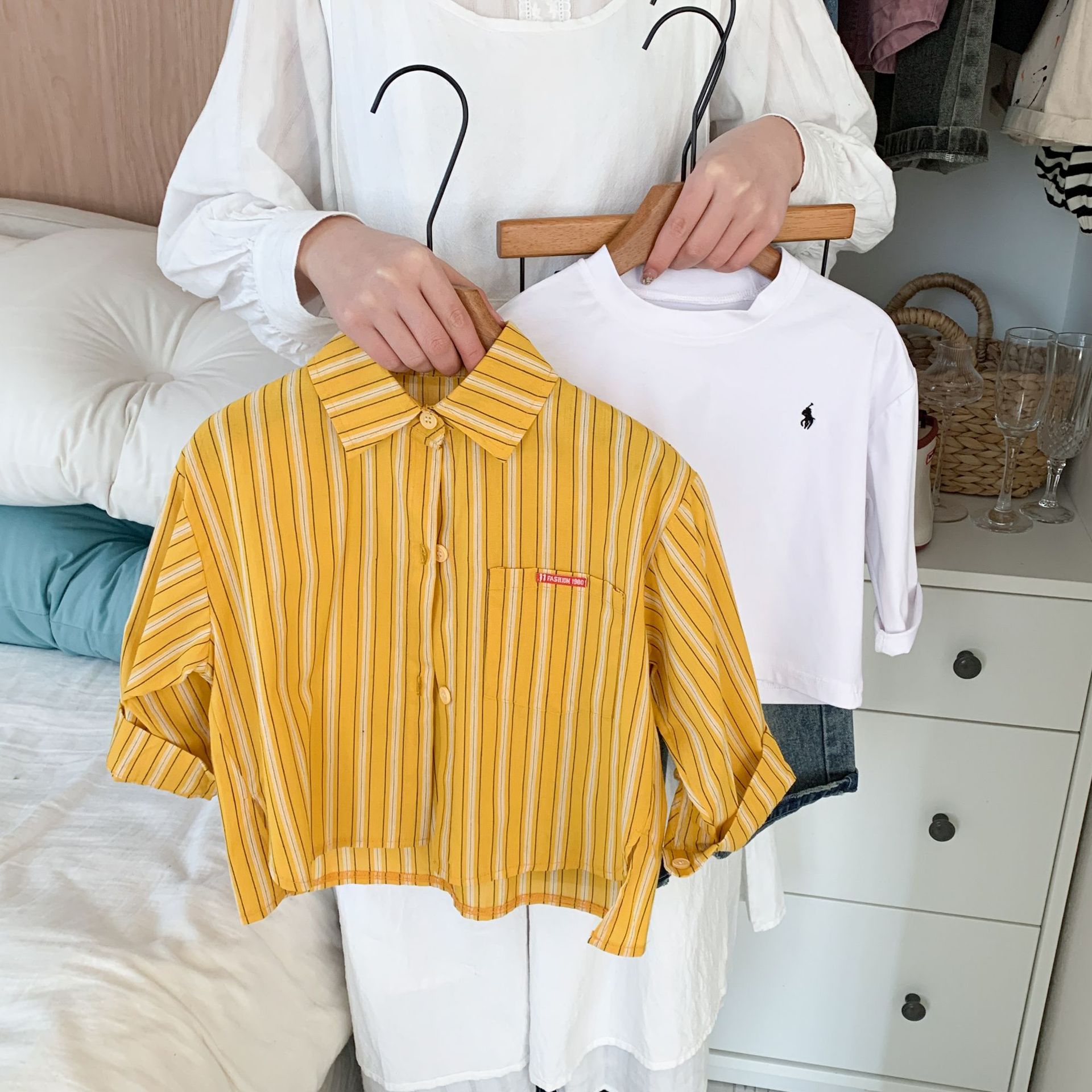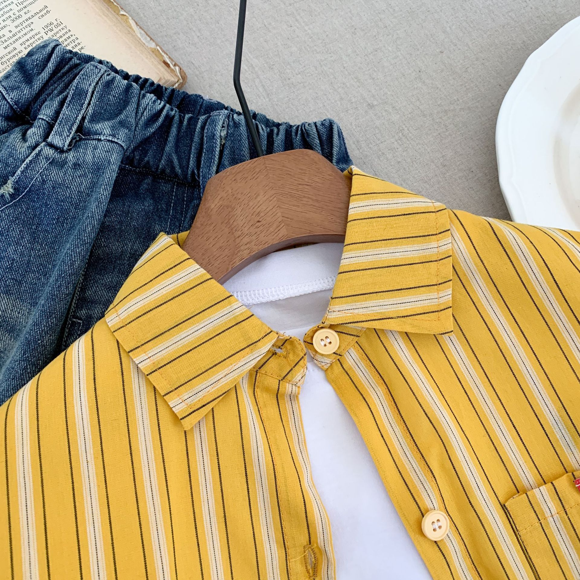스팟 아동용 봄 줄무늬 셔츠 일본과 한국의 노란색 줄무늬 라벨 셔츠 소년 베이비 스타일 재킷 소녀 카디건