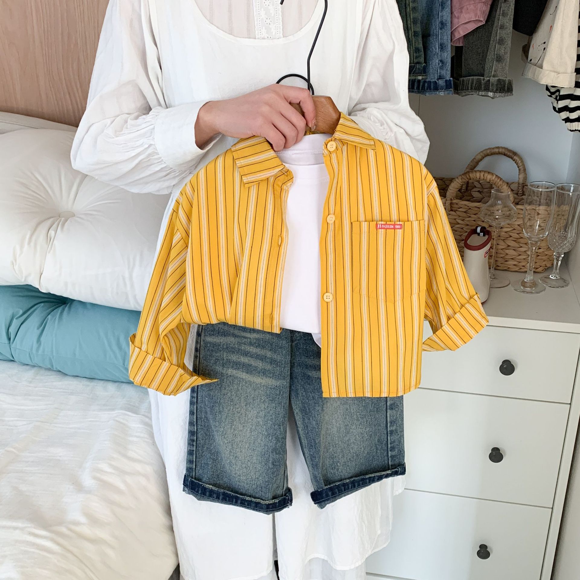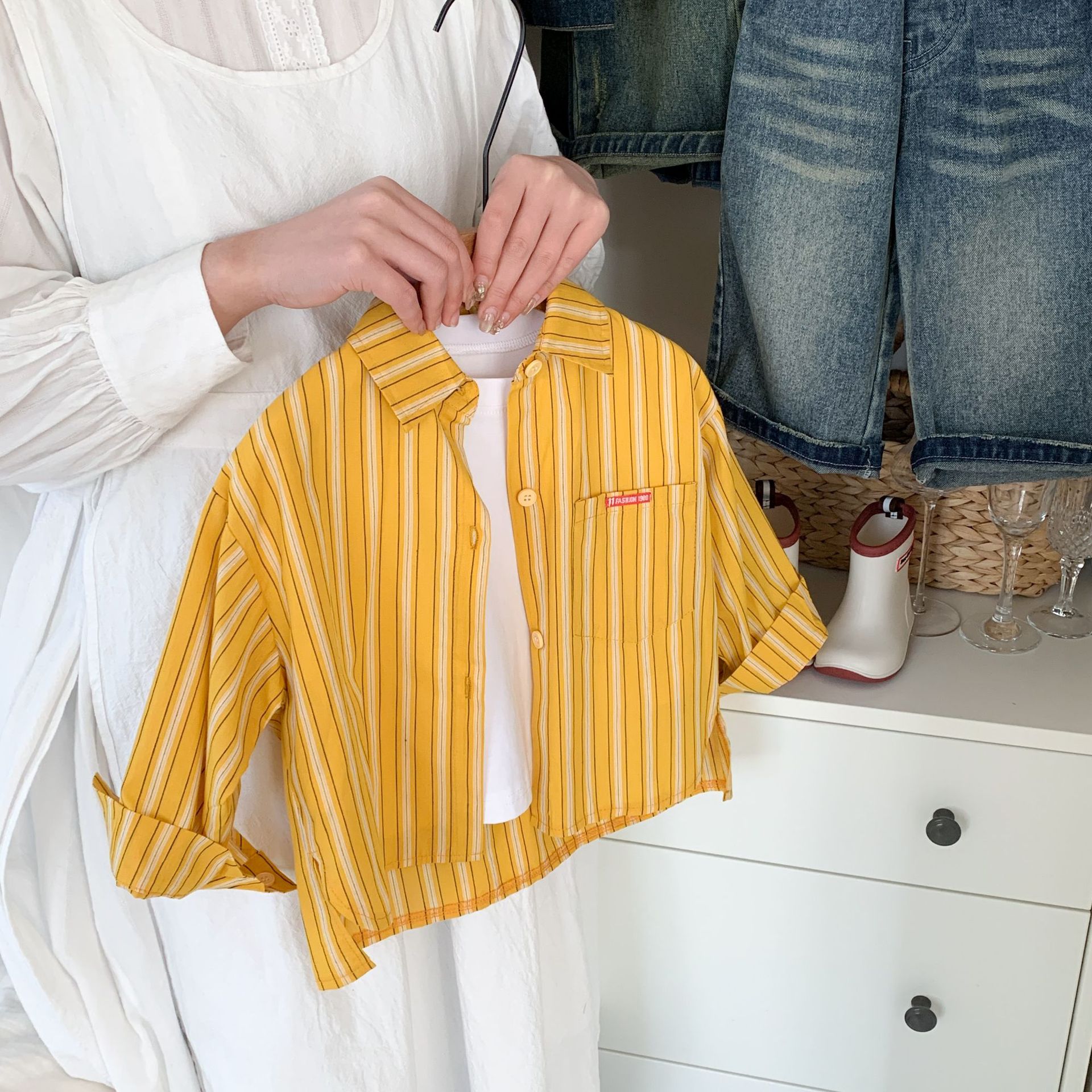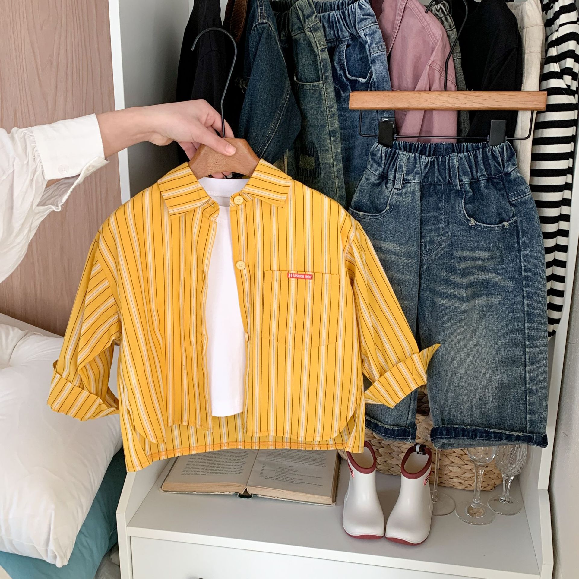 스팟 아동용 봄 줄무늬 셔츠 일본과 한국의 노란색 줄무늬 라벨 셔츠 소년 베이비 스타일 재킷 소녀 카디건스토어 가기