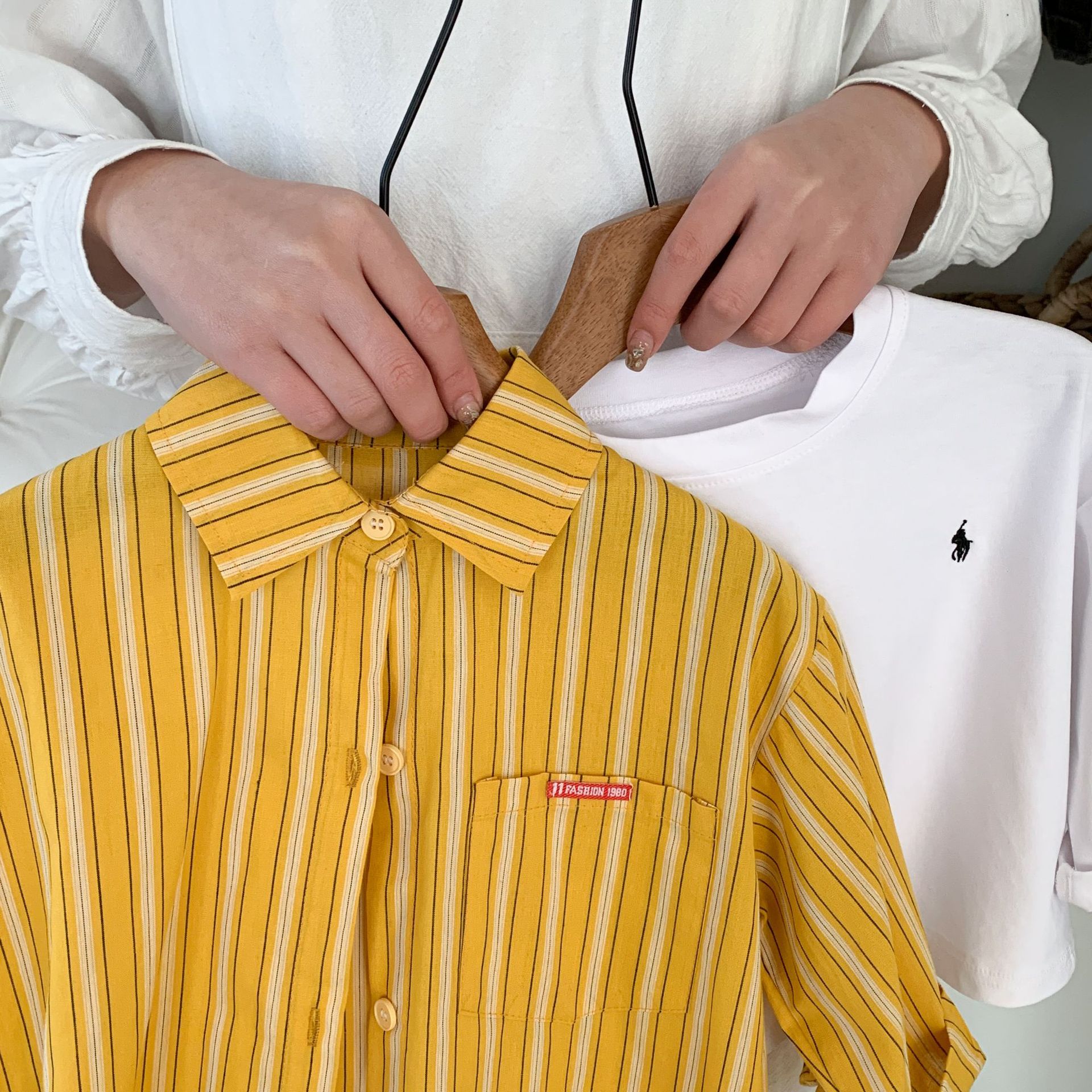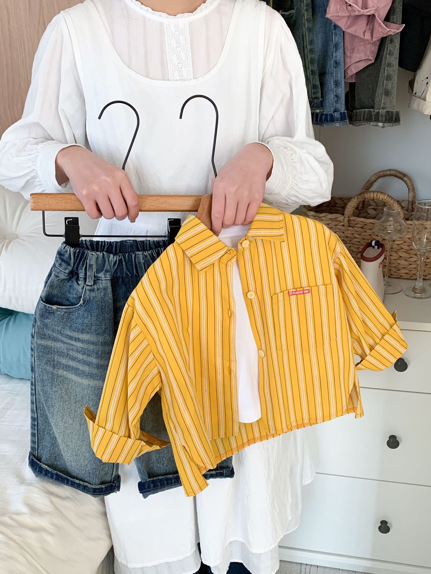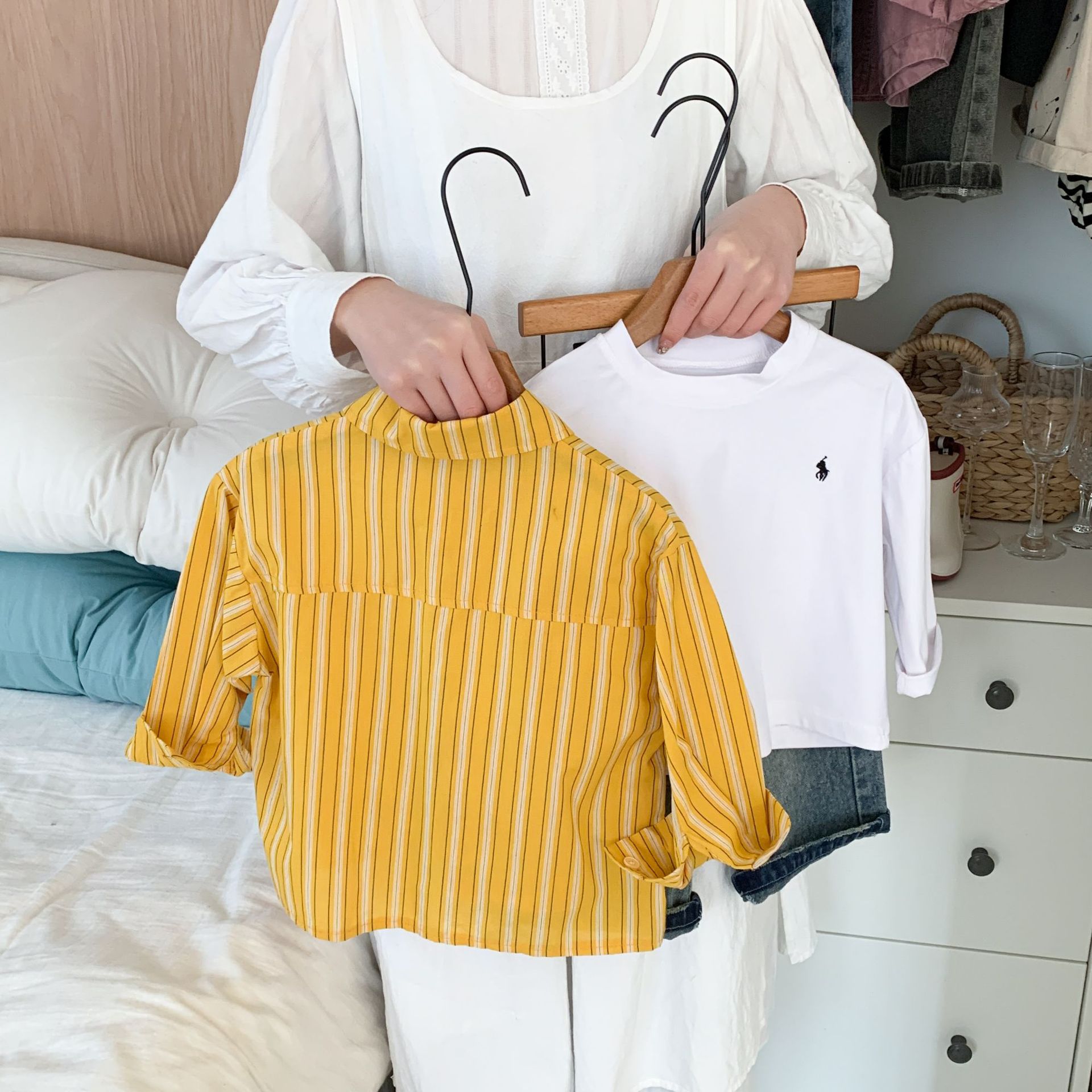 스팟 아동용 봄 줄무늬 셔츠 일본과 한국의 노란색 줄무늬 라벨 셔츠 소년 베이비 스타일 재킷 소녀 카디건스토어 가기