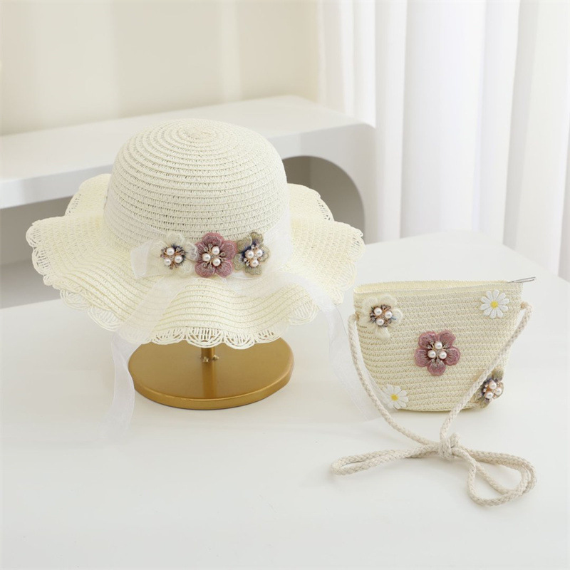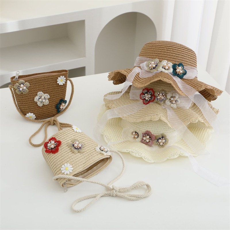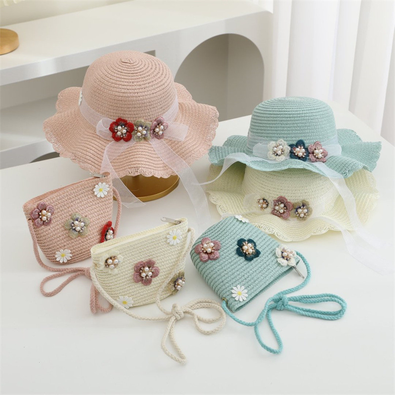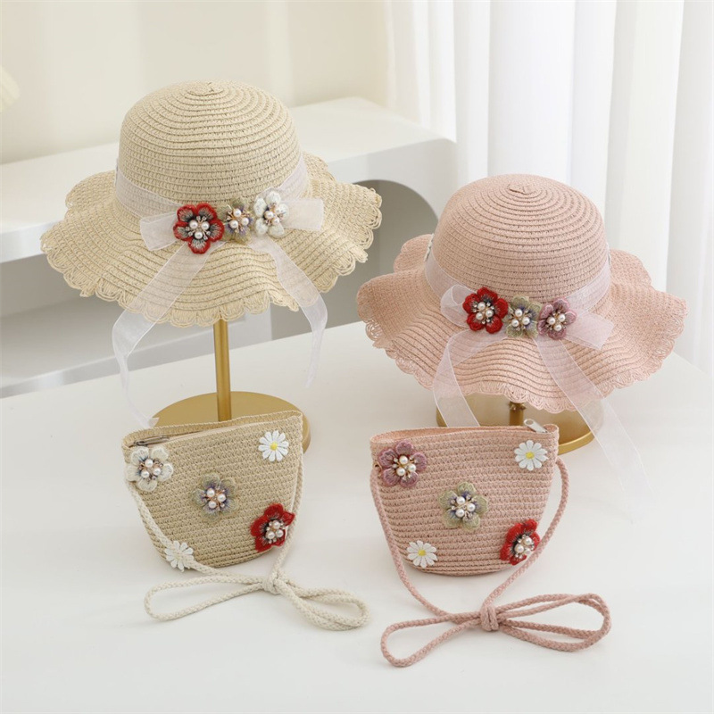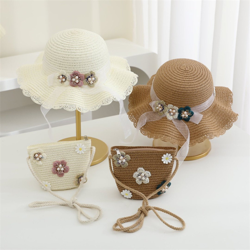 어린이 밀짚 모자 달콤한 레이스 진주 차양 모자 여름 부모-어린이 휴일 해변 모자 어깨 가방