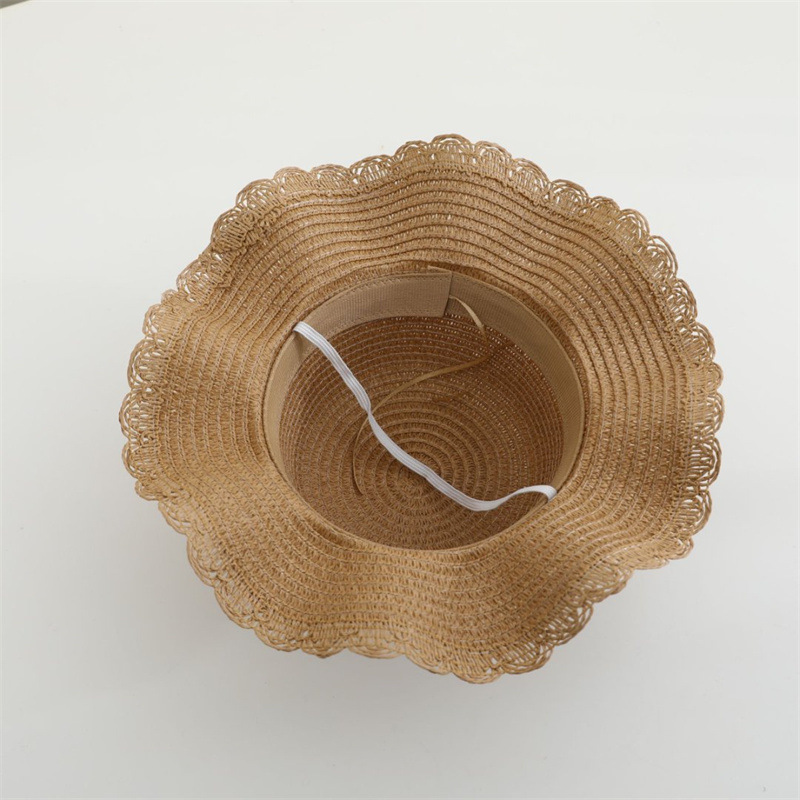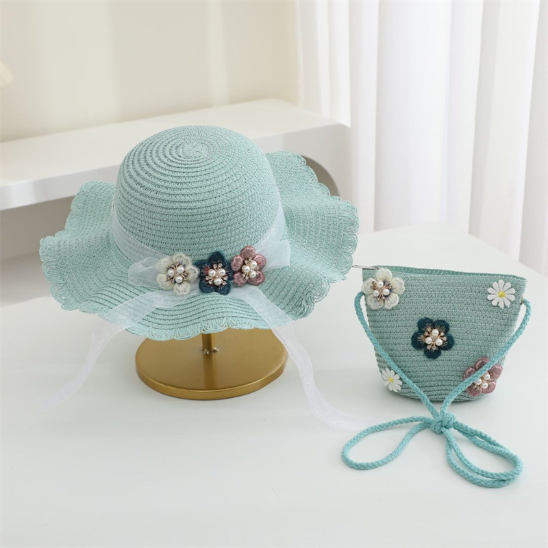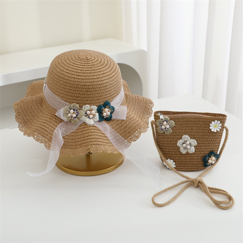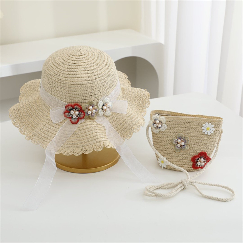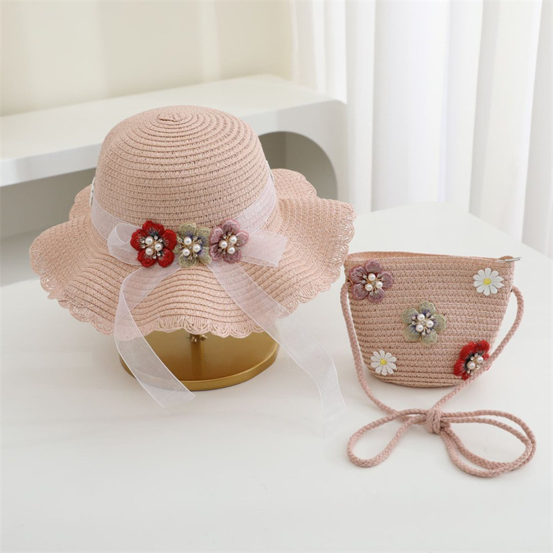 어린이 밀짚 모자 달콤한 레이스 진주 차양 모자 여름 부모-어린이 휴일 해변 모자 어깨 가방