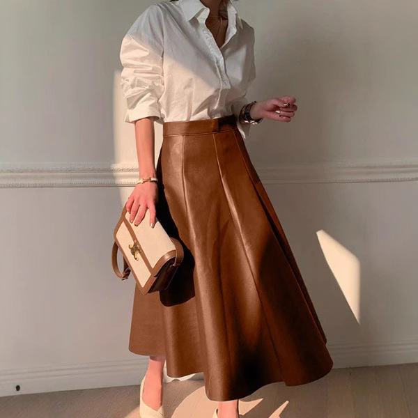 대외 무역 여성 의류 유럽과 미국의 거리 2024 가을 겨울 새로운 일본과 한국 스타일 인스 타 그램 스타일 간단한 슬리밍 트럼펫 PU 가죽 스커트스토어 가기