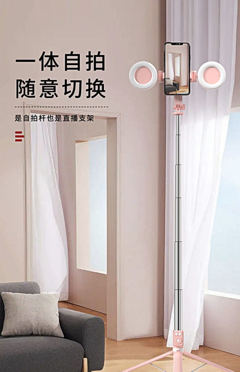• T12 핑크 듀얼 라이트 모델 [ 1.7m 알루미늄 합금 통합 셀카봉 + 충전 다기능 블루투스 리모콘 + 대형 원형 조명 2개, 3색 및 9레벨]