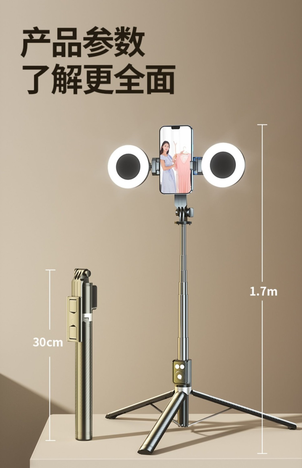 • T12 블랙 듀얼 라이트 모델 [ 1.7m 알루미늄 합금 통합 셀카봉 + 충전 다기능 블루투스 리모콘 + 대형 원형 조명 2개, 3색 및 9레벨]