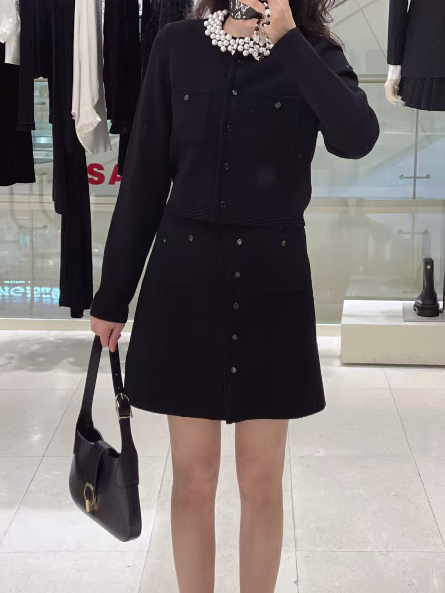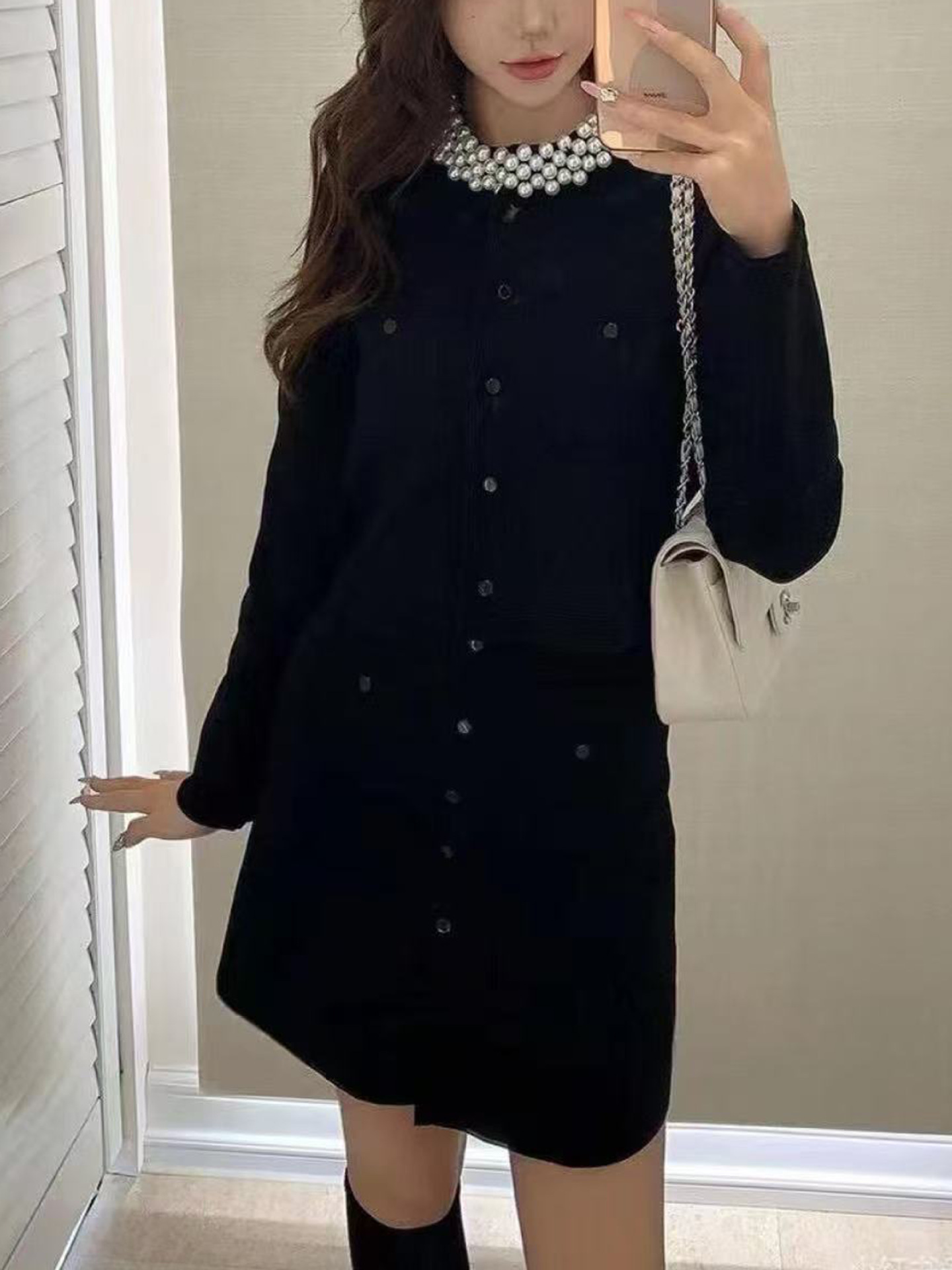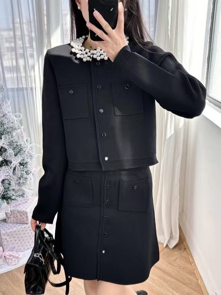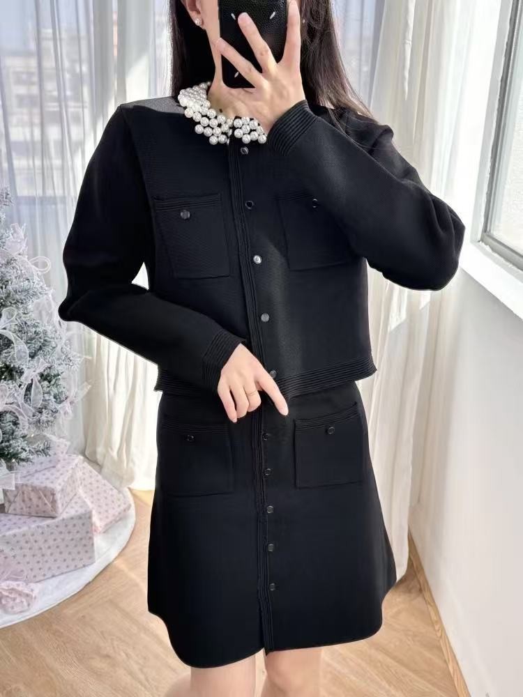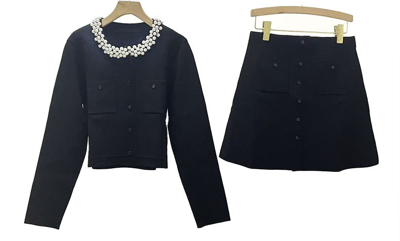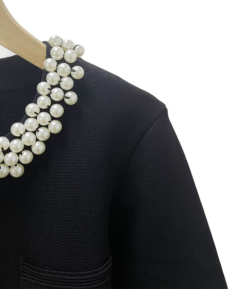 S 가족 봄과 여름 프랑스 스타일 새로운 스타일의 무거운 진주 칼라 긴 소매 짧은 스웨터 탑 카디건 오버 스커트 여성