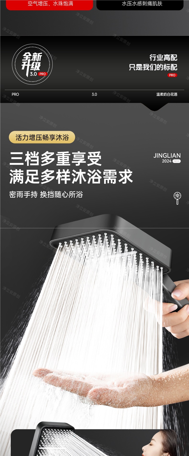 • 매트 블랙 3단 슈퍼차저 샤워 + 2m 호스 + 브래킷