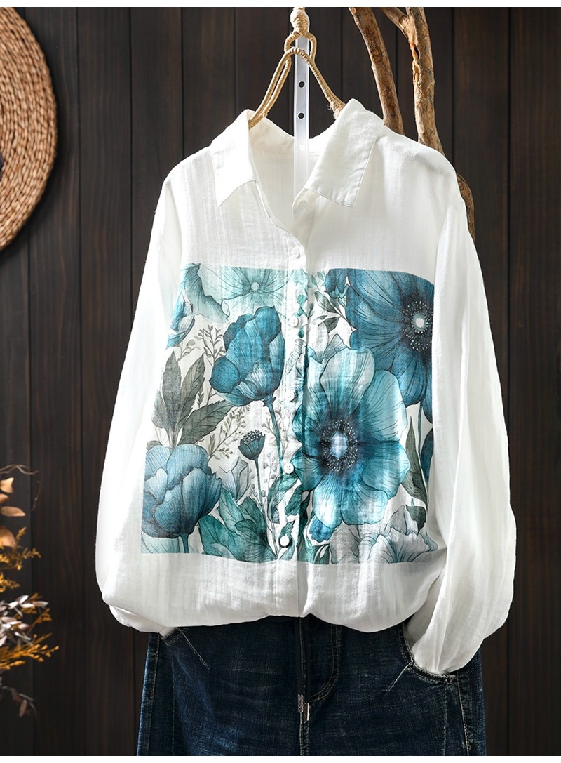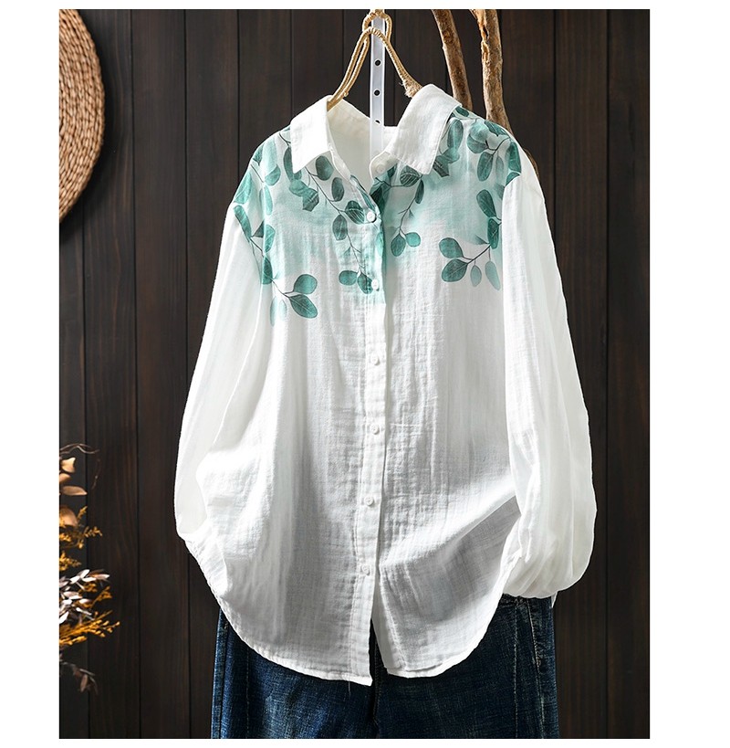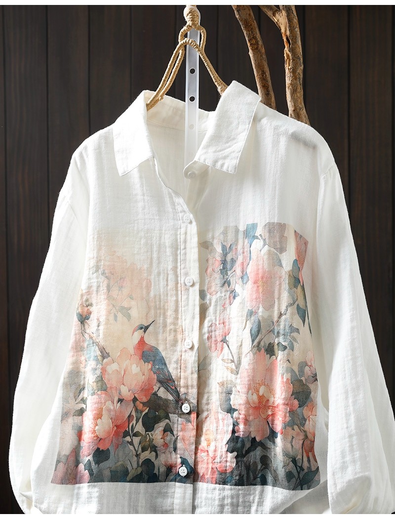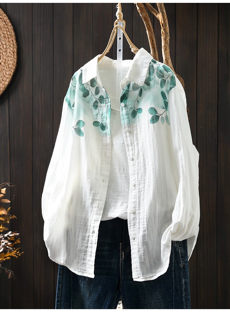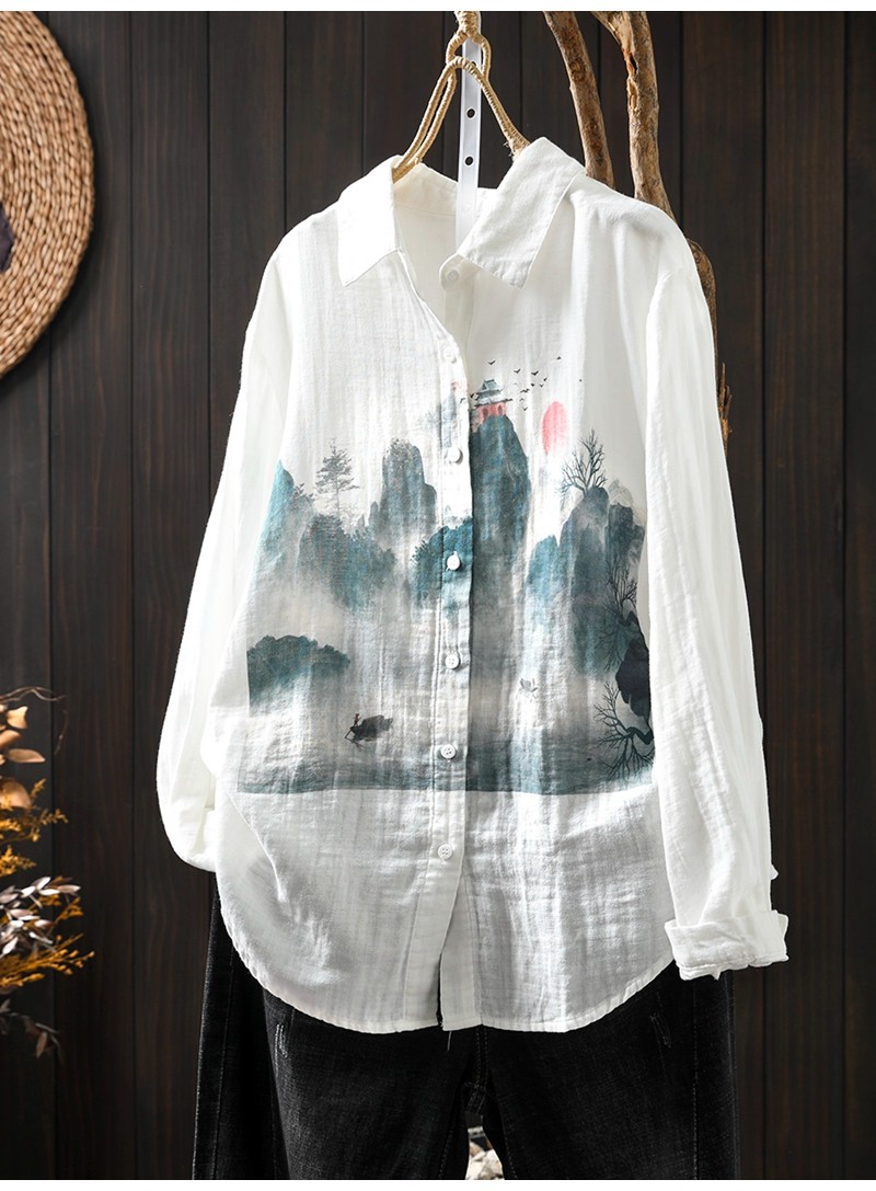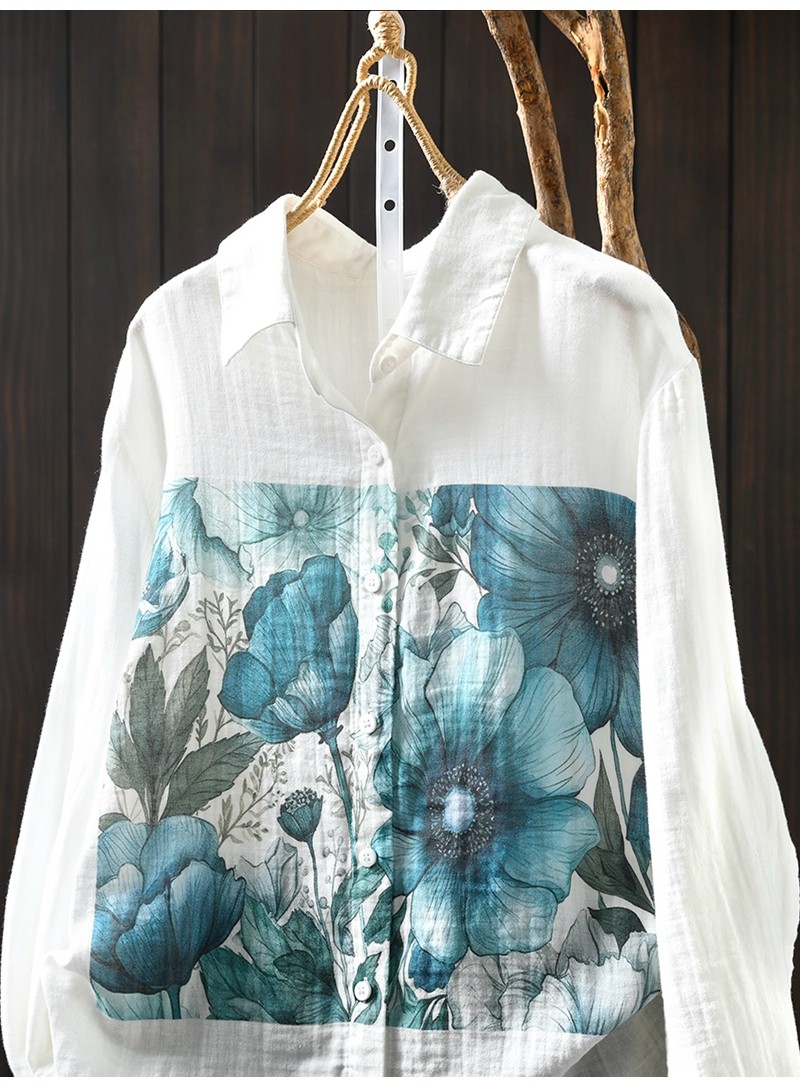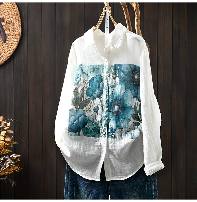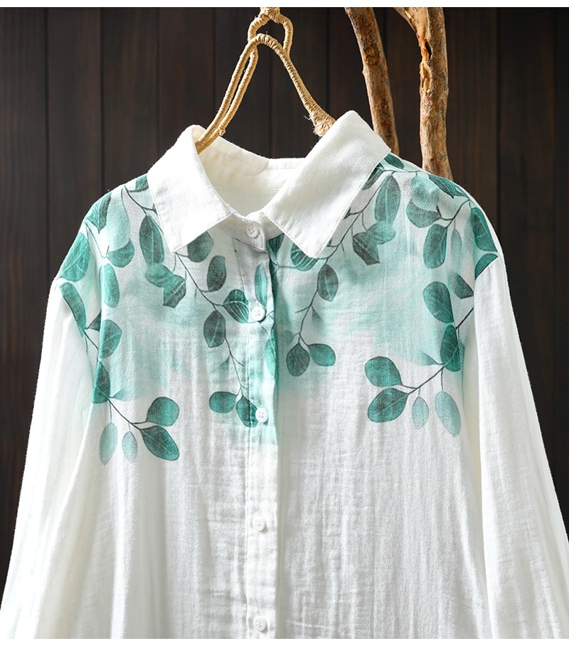 봄 새로운 도착 인쇄 더블 레이어 면 원사 긴 소매 셔츠 여성의 느슨한 슬리밍 예술적 캐주얼 베이스 탑 6666