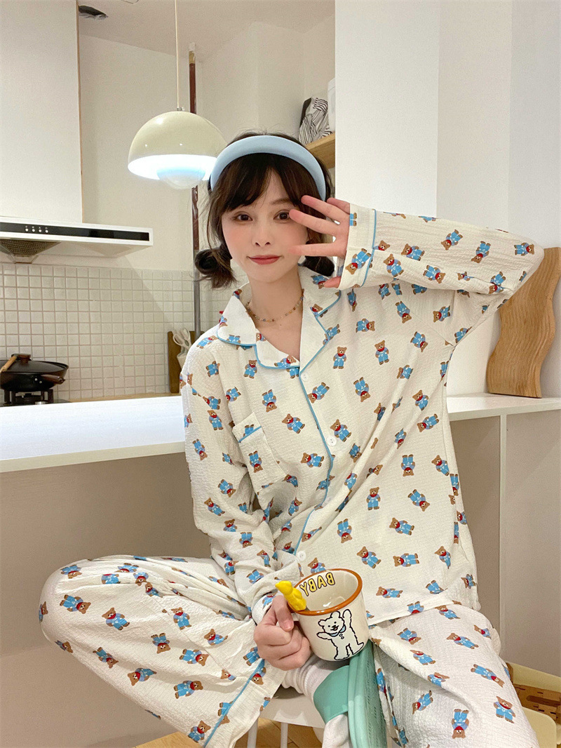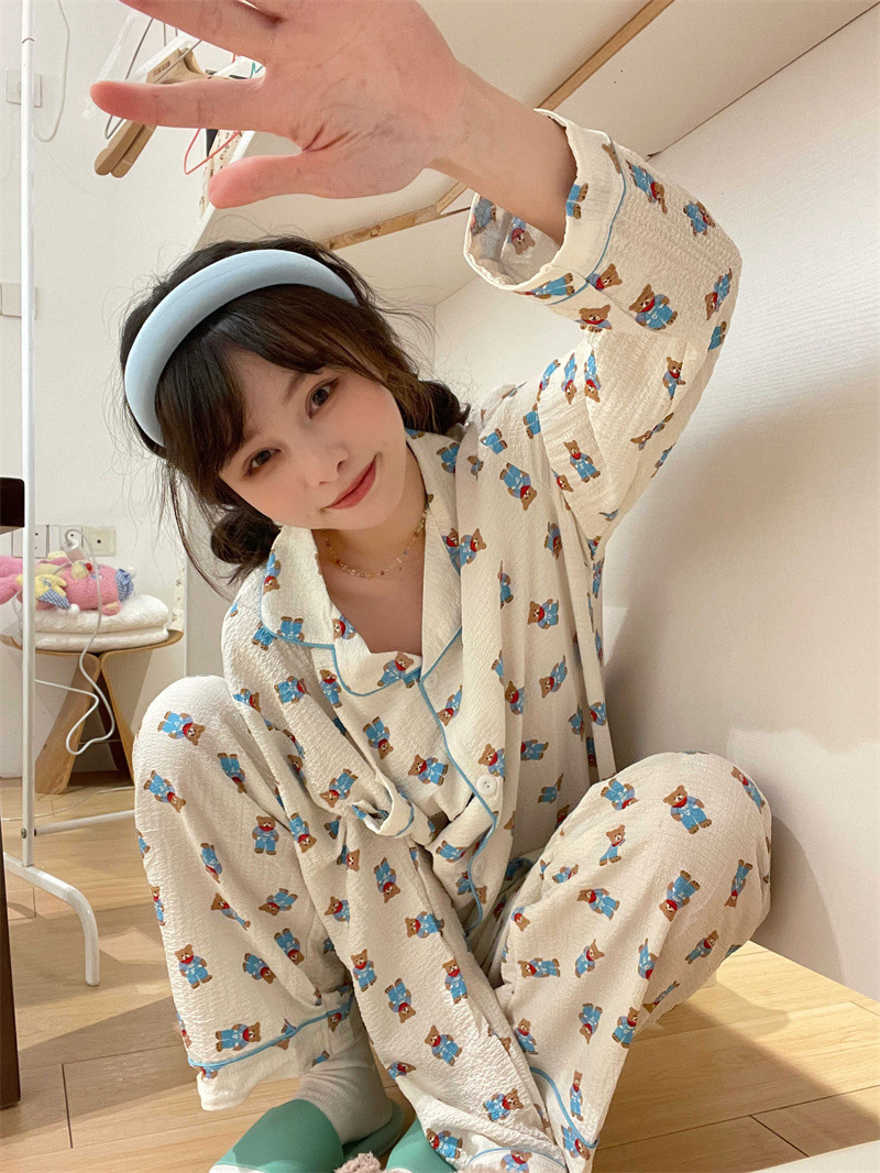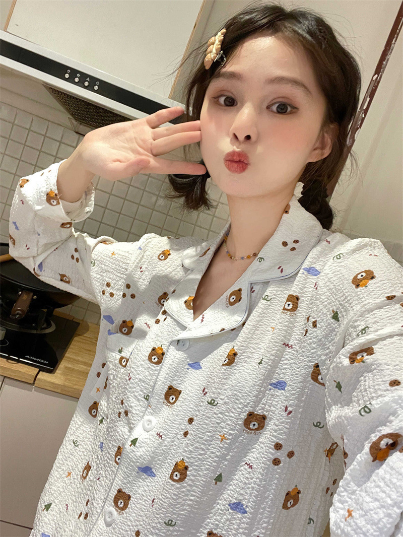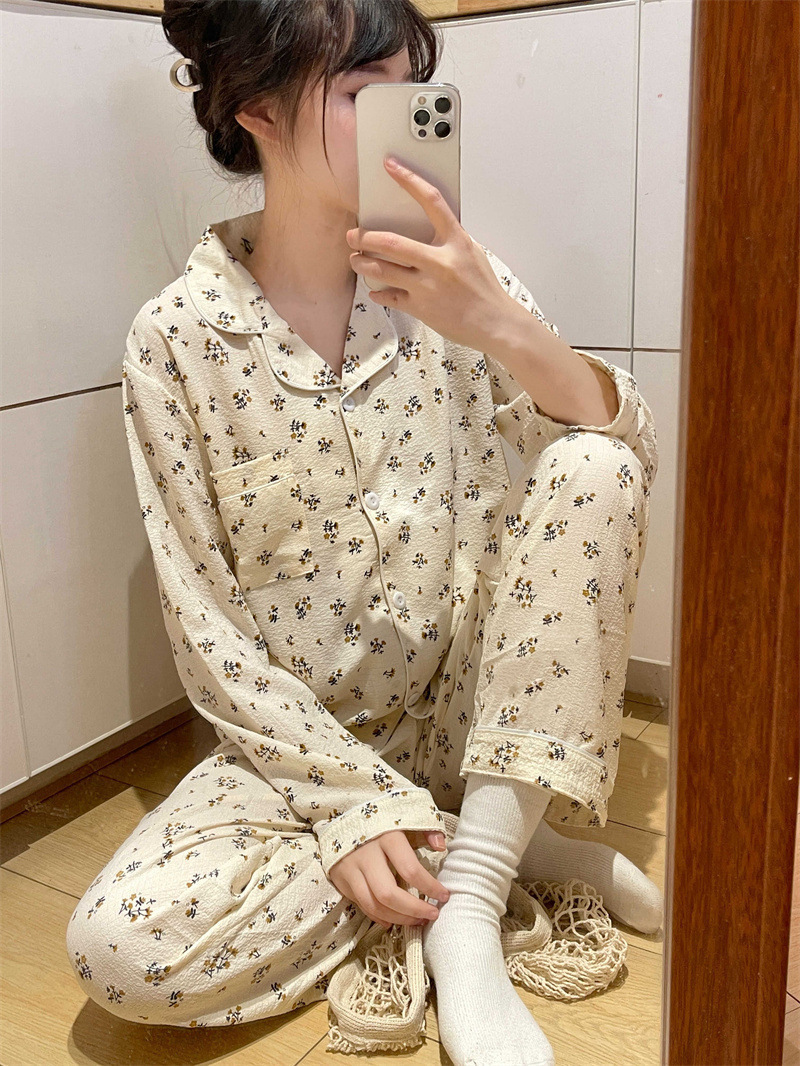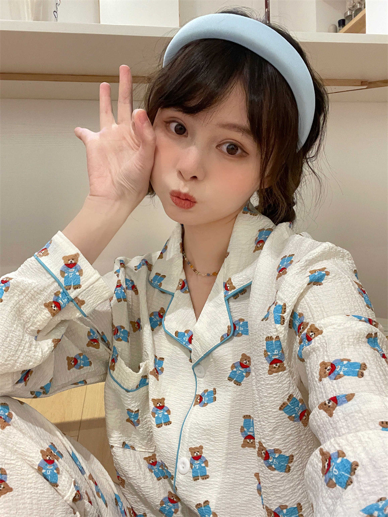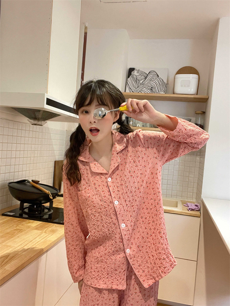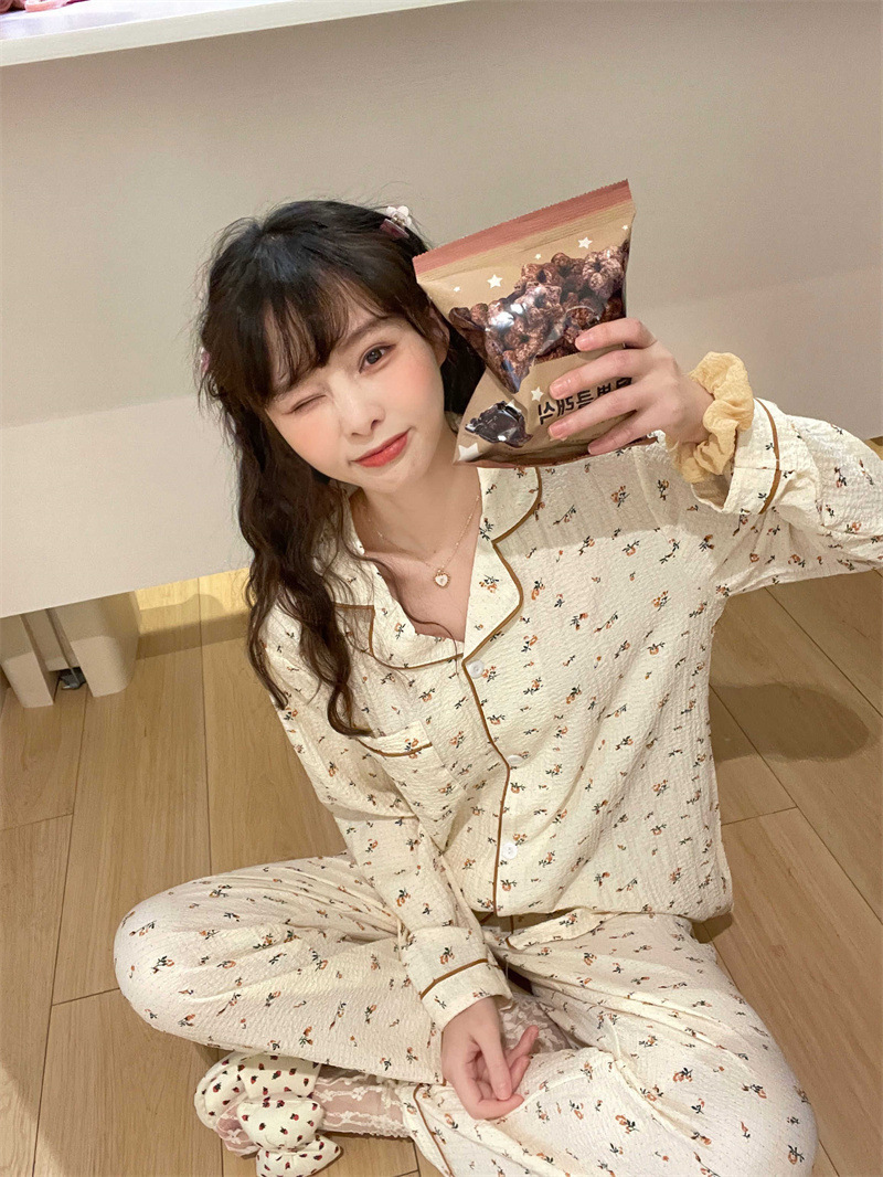 봄과 가을 새로운 Ins 스타일 파자마 여성의 새로운 버블 코튼 긴 소매 달콤한 스타일 간단한 홈 의류 세트 외부 착용스토어 가기