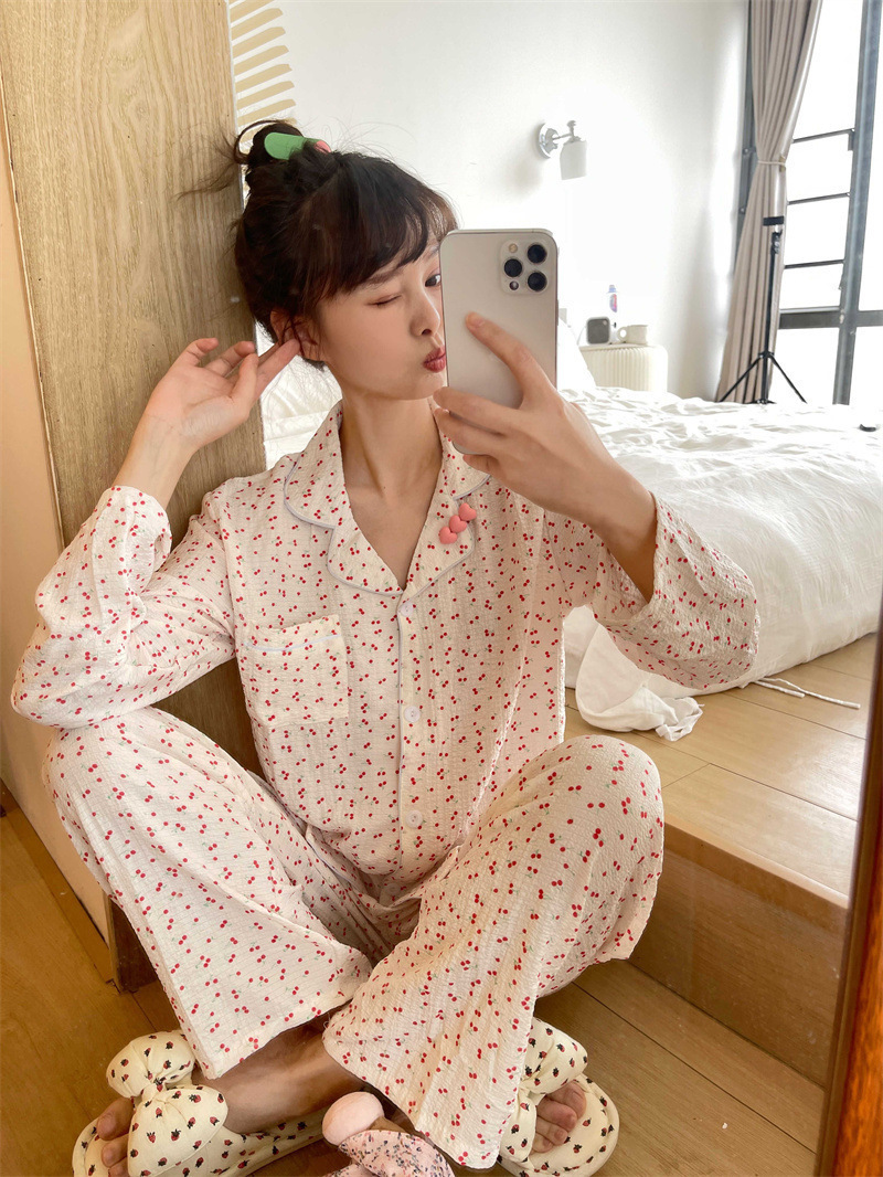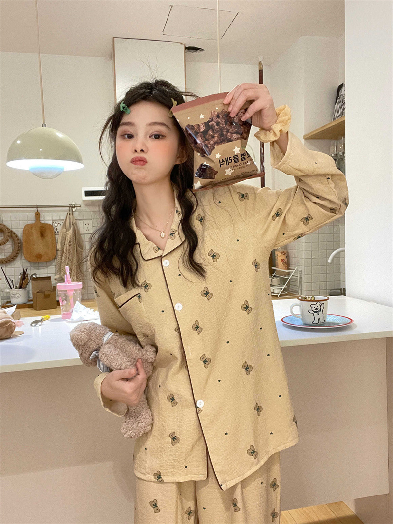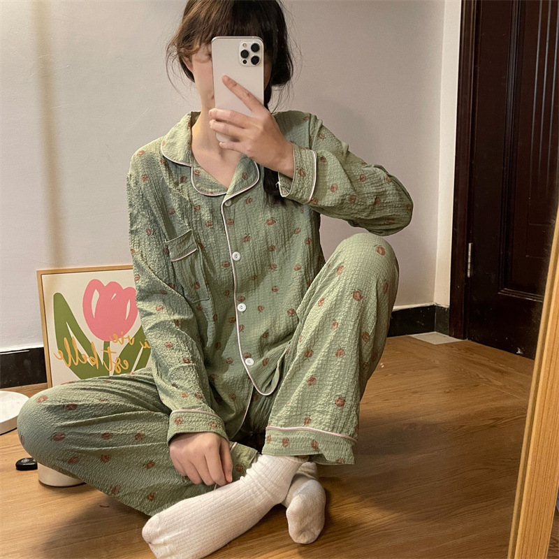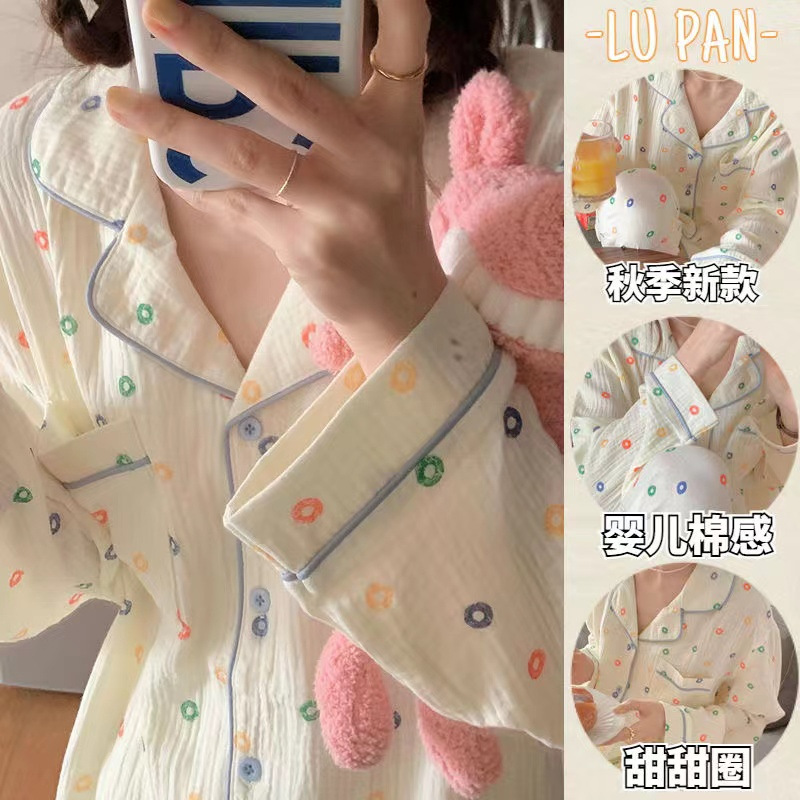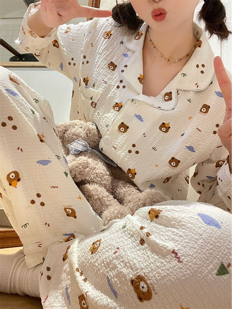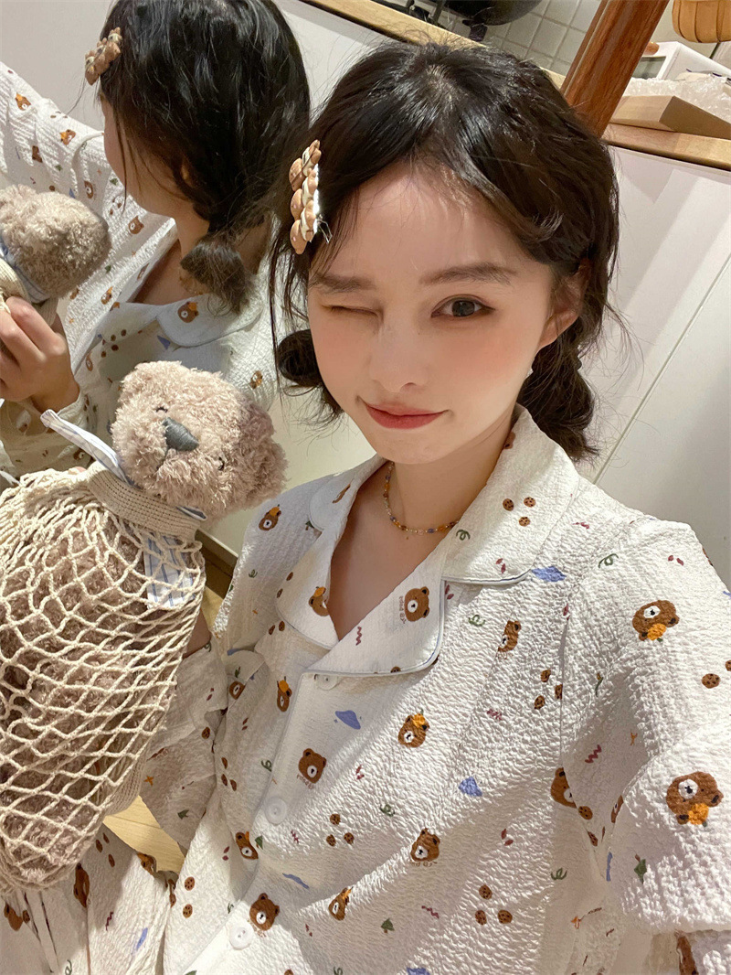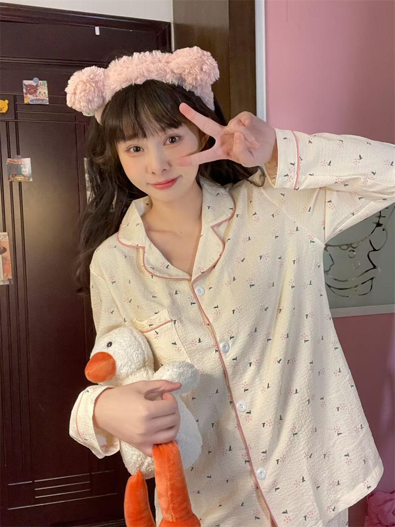 봄과 가을 새로운 Ins 스타일 파자마 여성의 새로운 버블 코튼 긴 소매 달콤한 스타일 간단한 홈 의류 세트 외부 착용스토어 가기