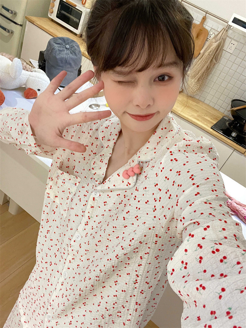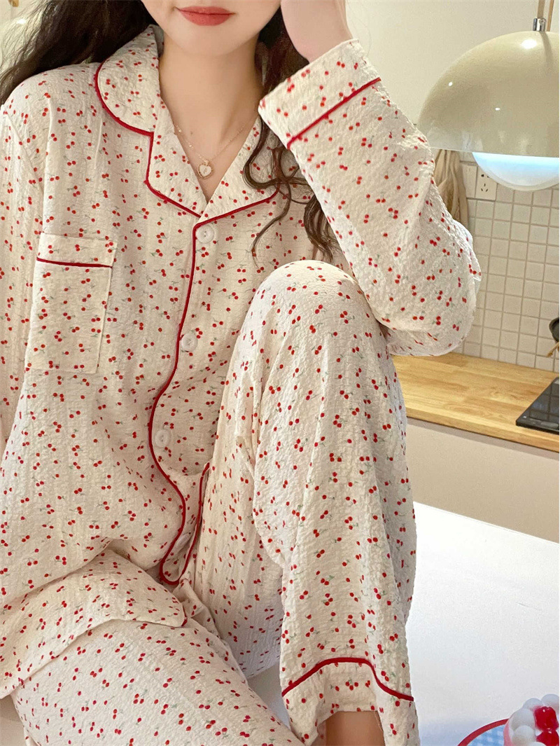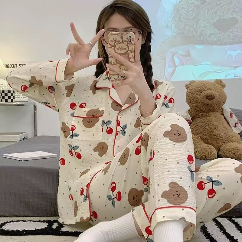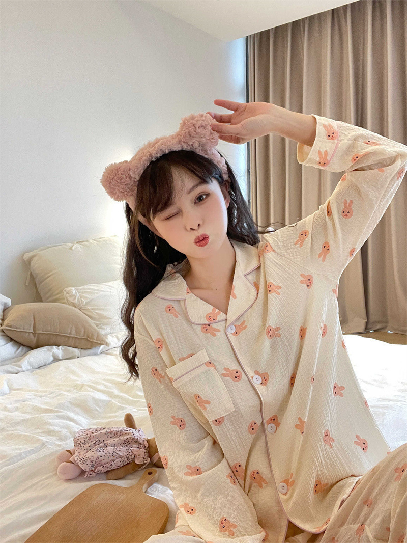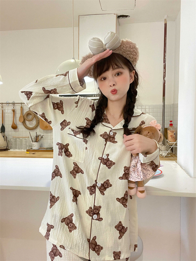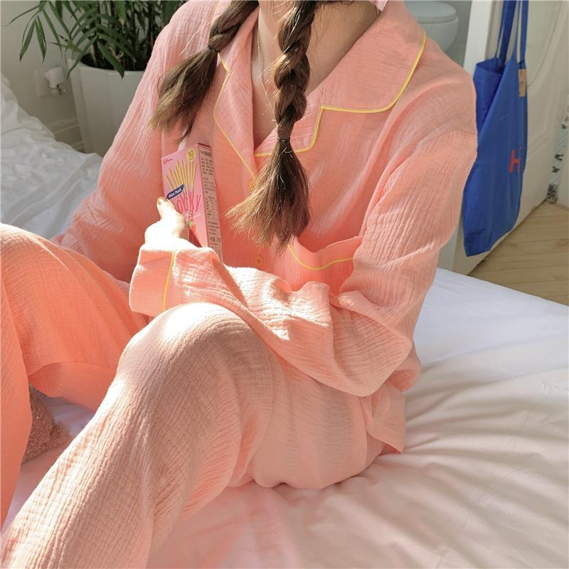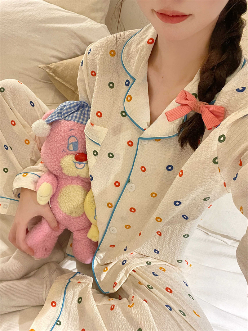 봄과 가을 새로운 Ins 스타일 파자마 여성의 새로운 버블 코튼 긴 소매 달콤한 스타일 간단한 홈 의류 세트 외부 착용스토어 가기
