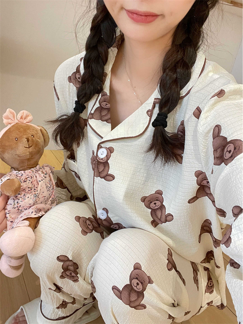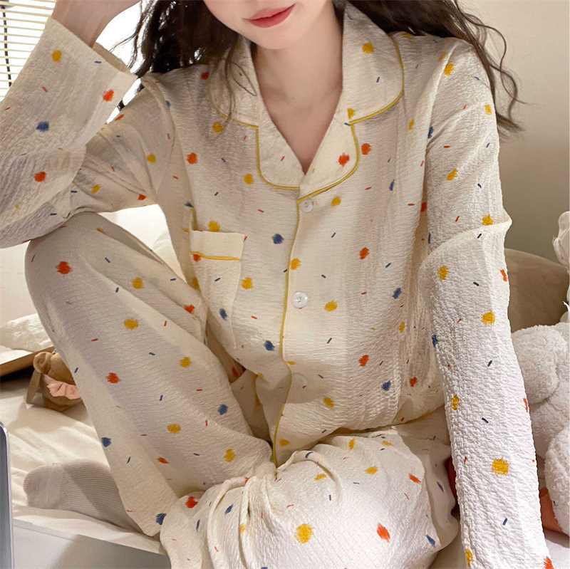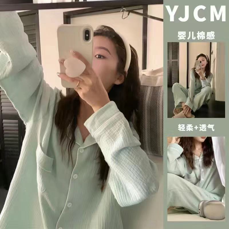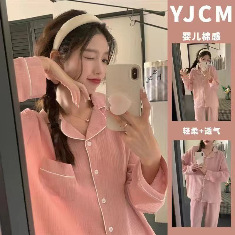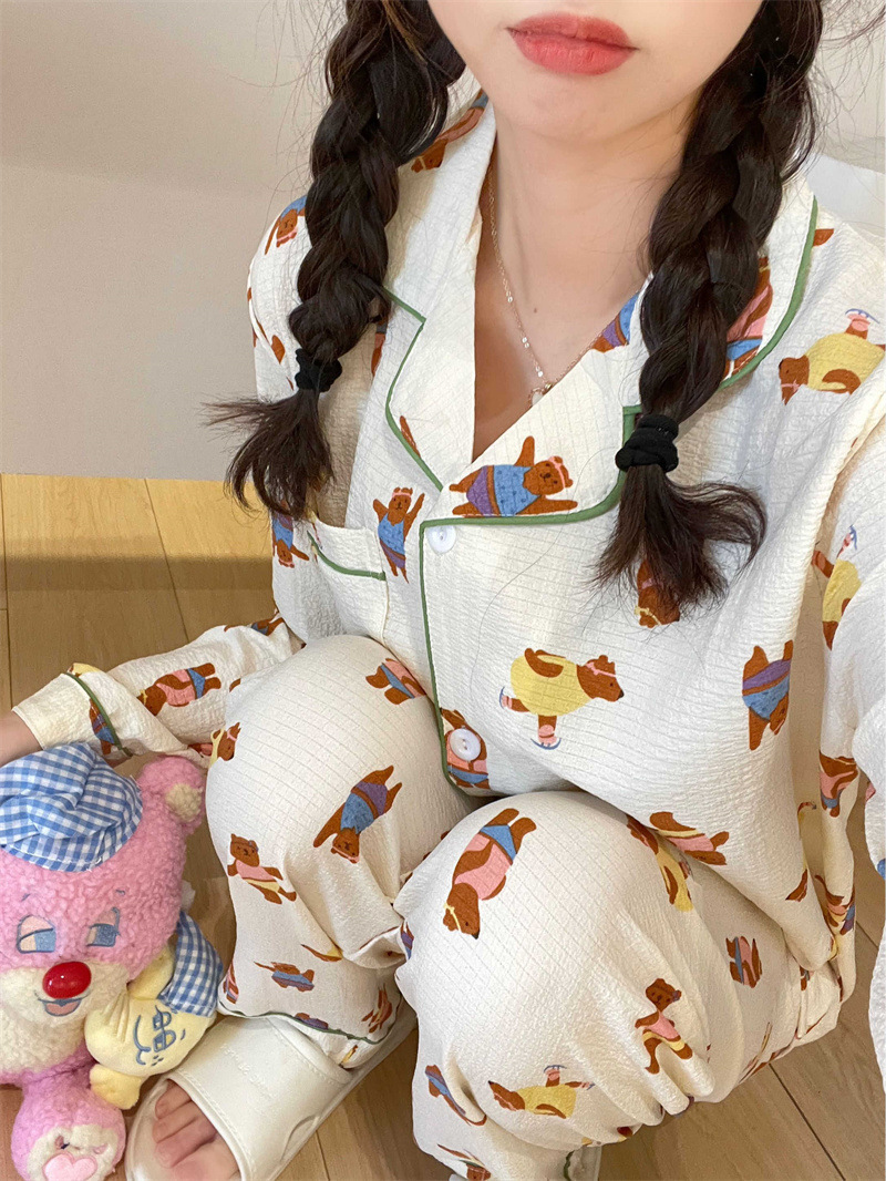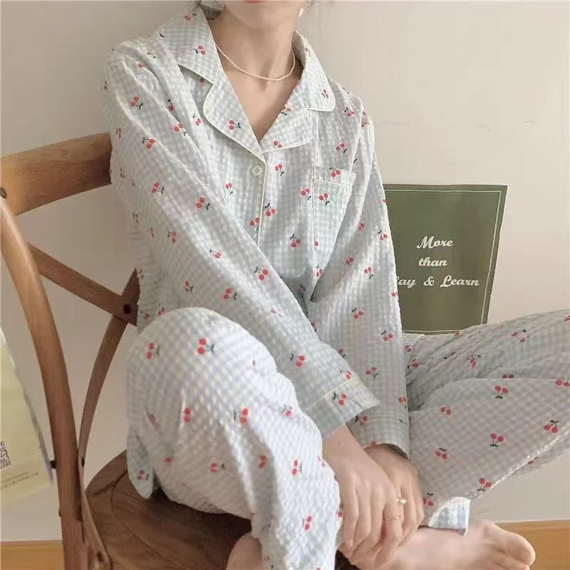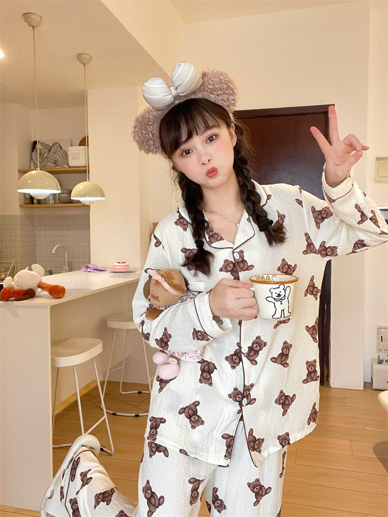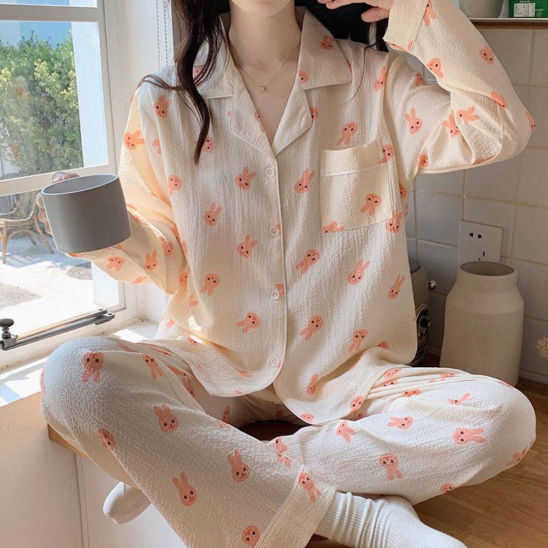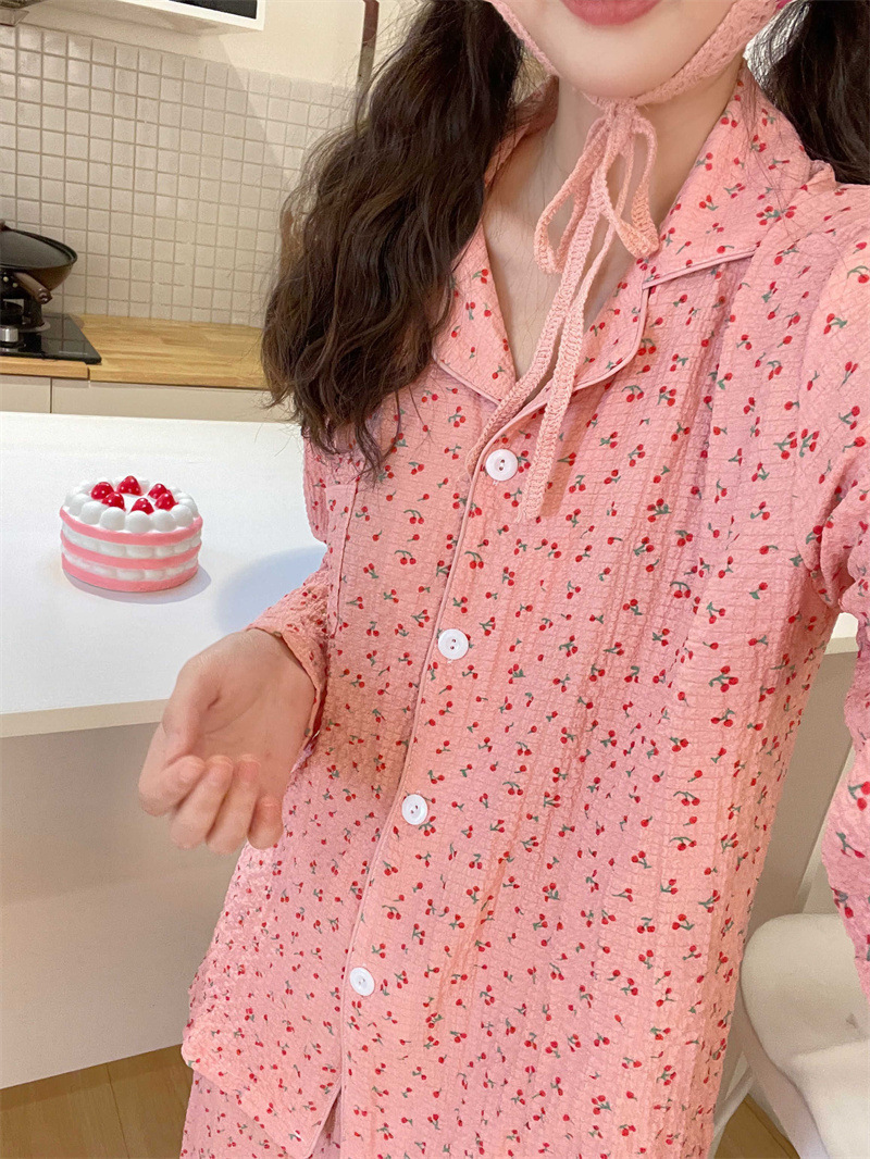 봄과 가을 새로운 Ins 스타일 파자마 여성의 새로운 버블 코튼 긴 소매 달콤한 스타일 간단한 홈 의류 세트 외부 착용스토어 가기