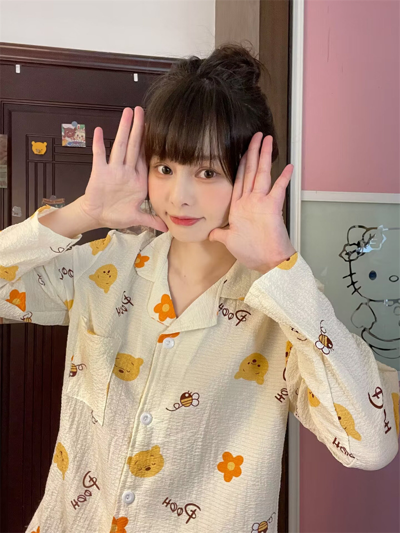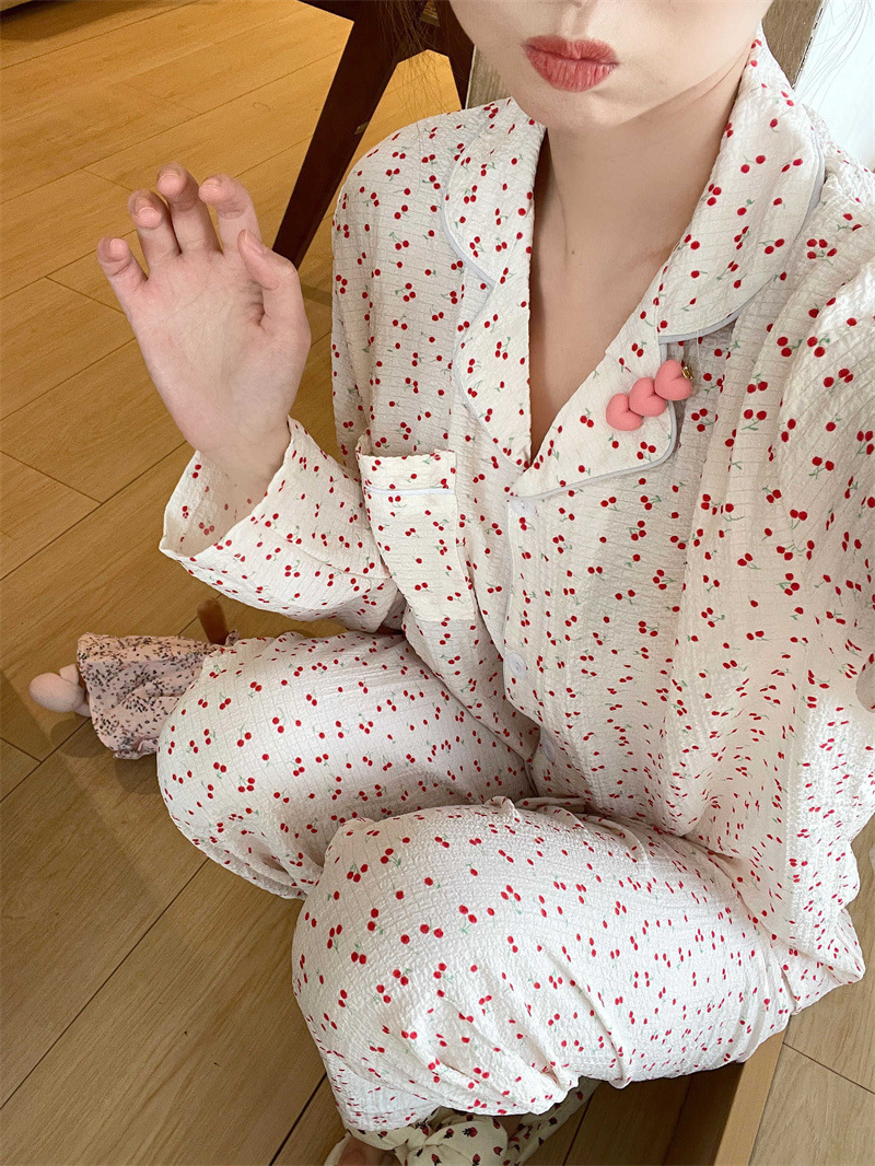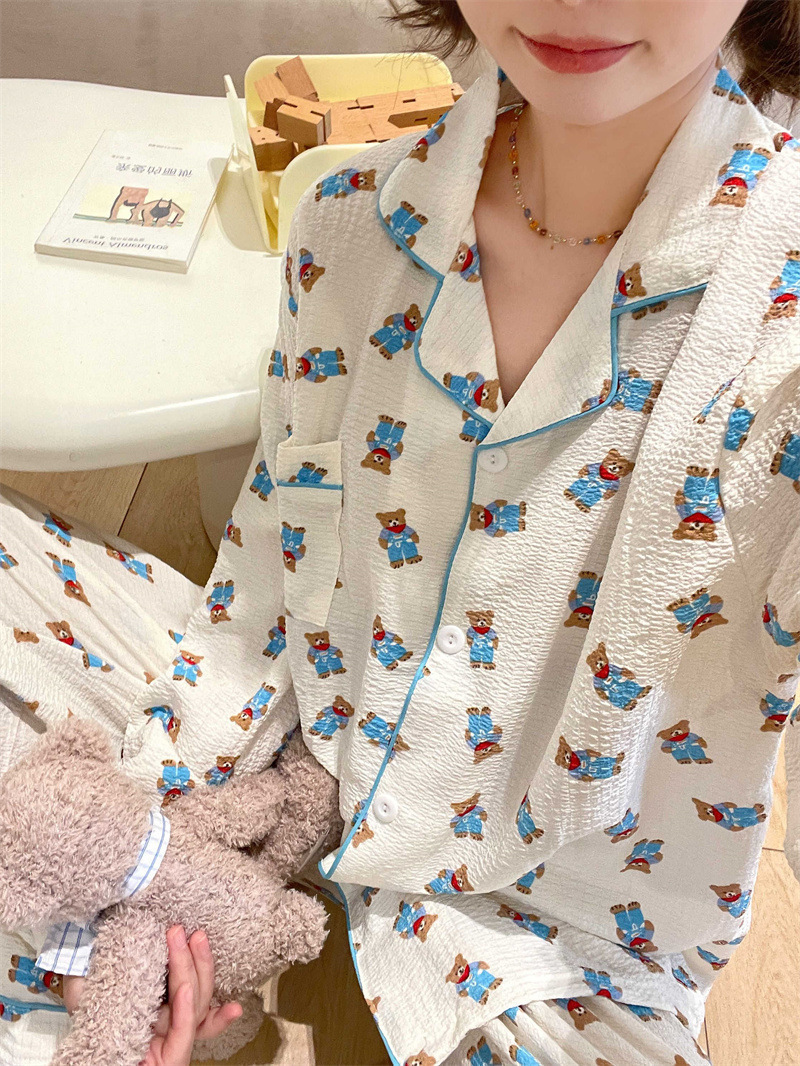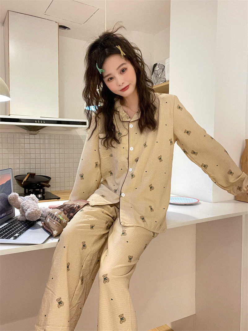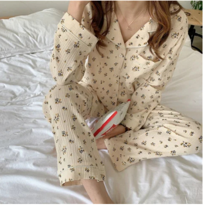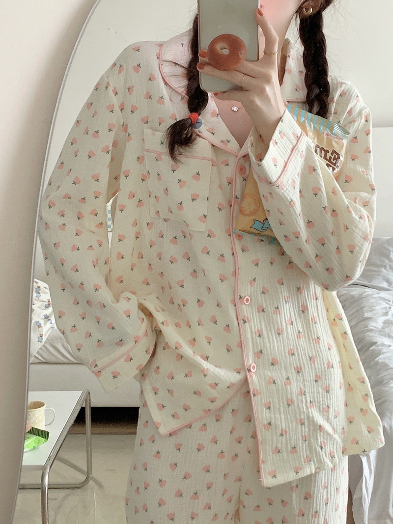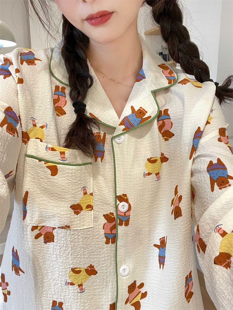 봄과 가을 새로운 Ins 스타일 파자마 여성의 새로운 버블 코튼 긴 소매 달콤한 스타일 간단한 홈 의류 세트 외부 착용스토어 가기