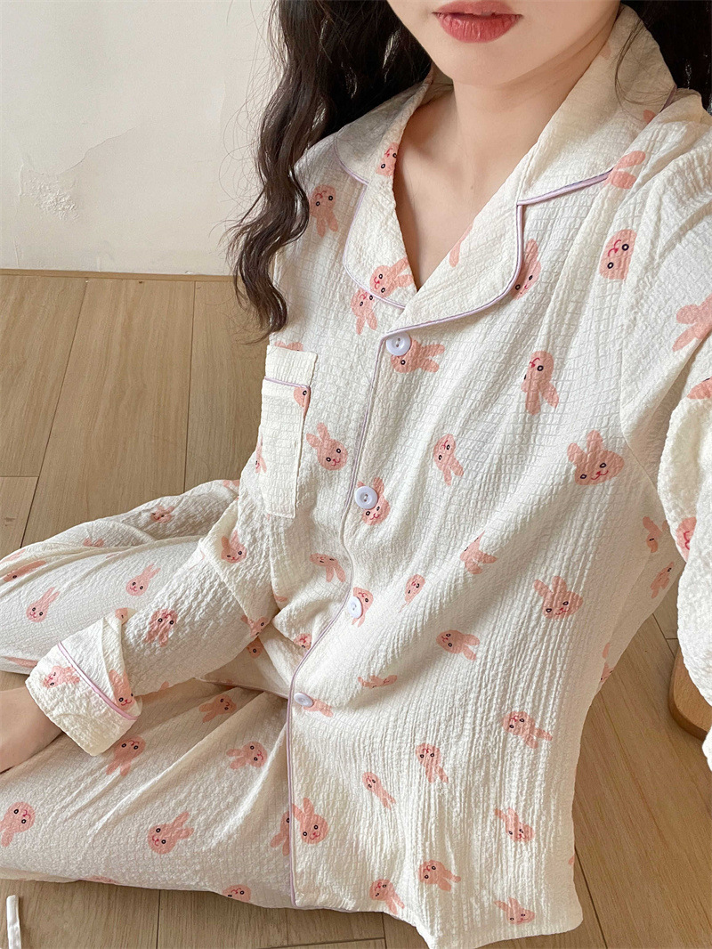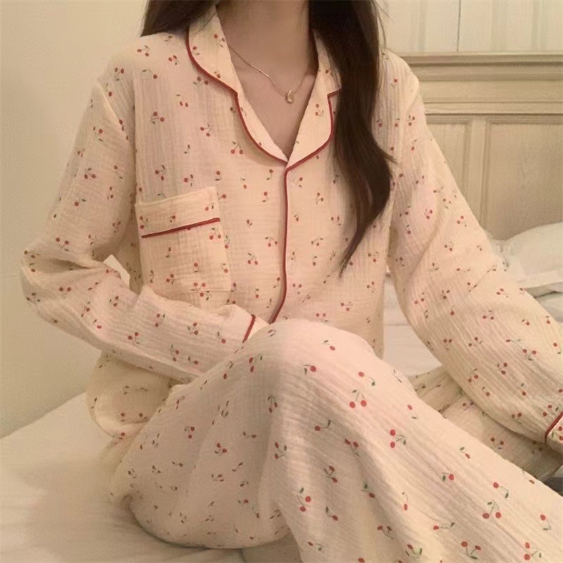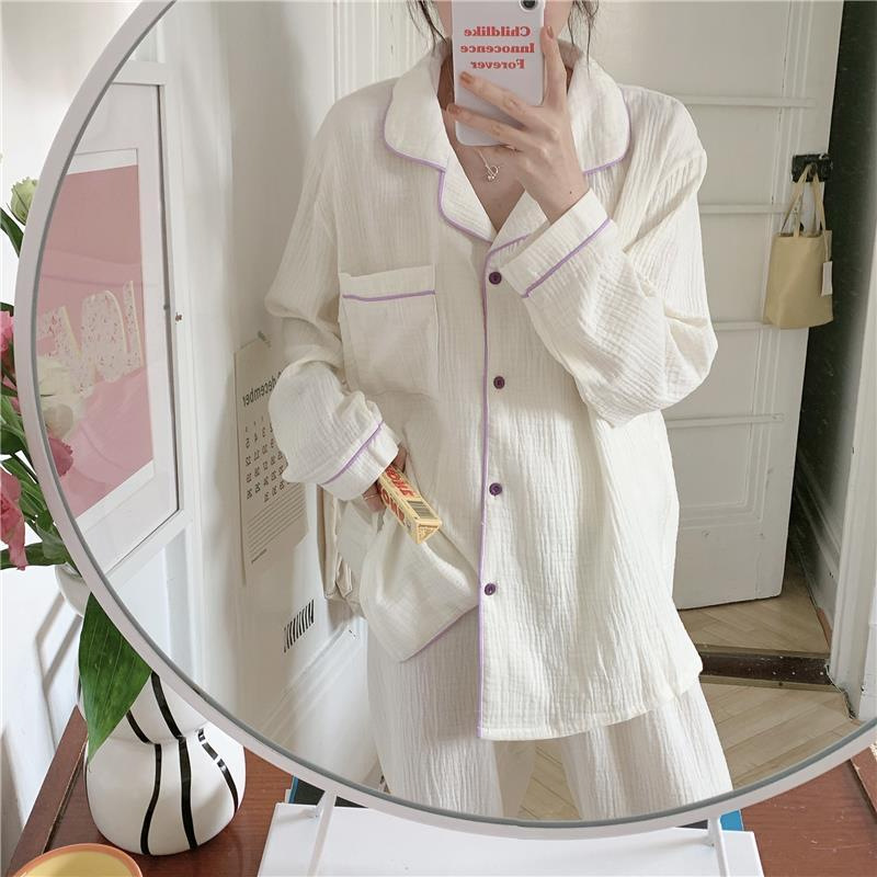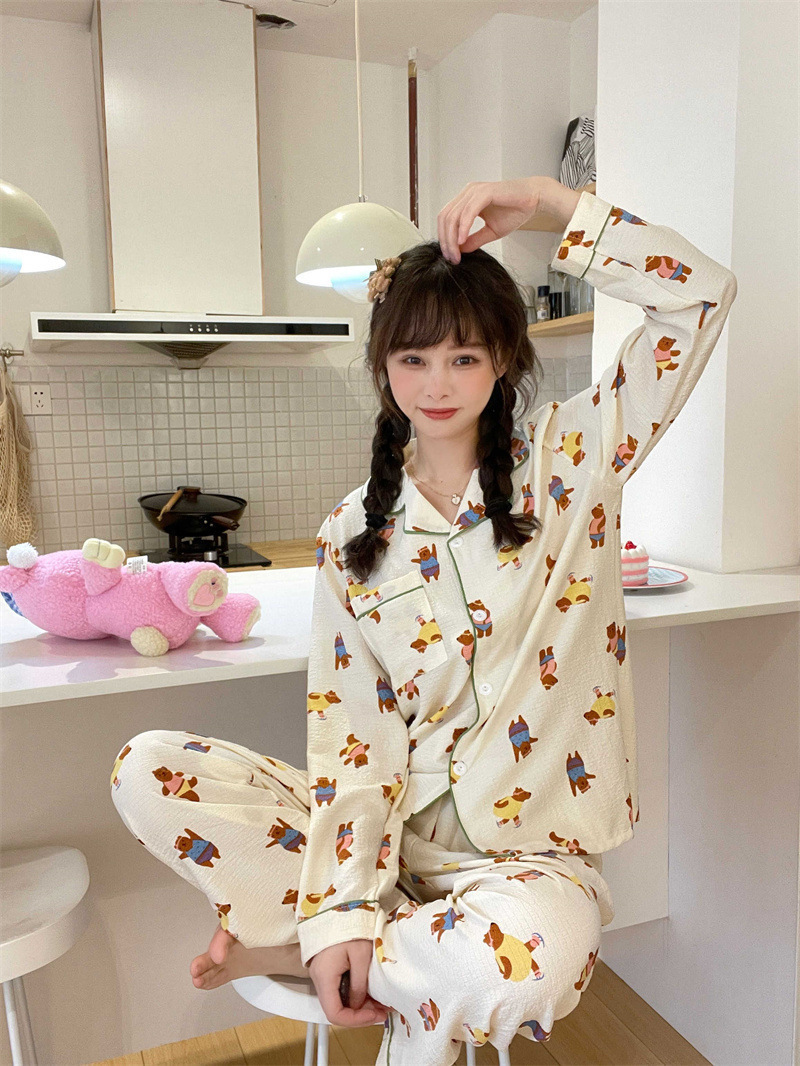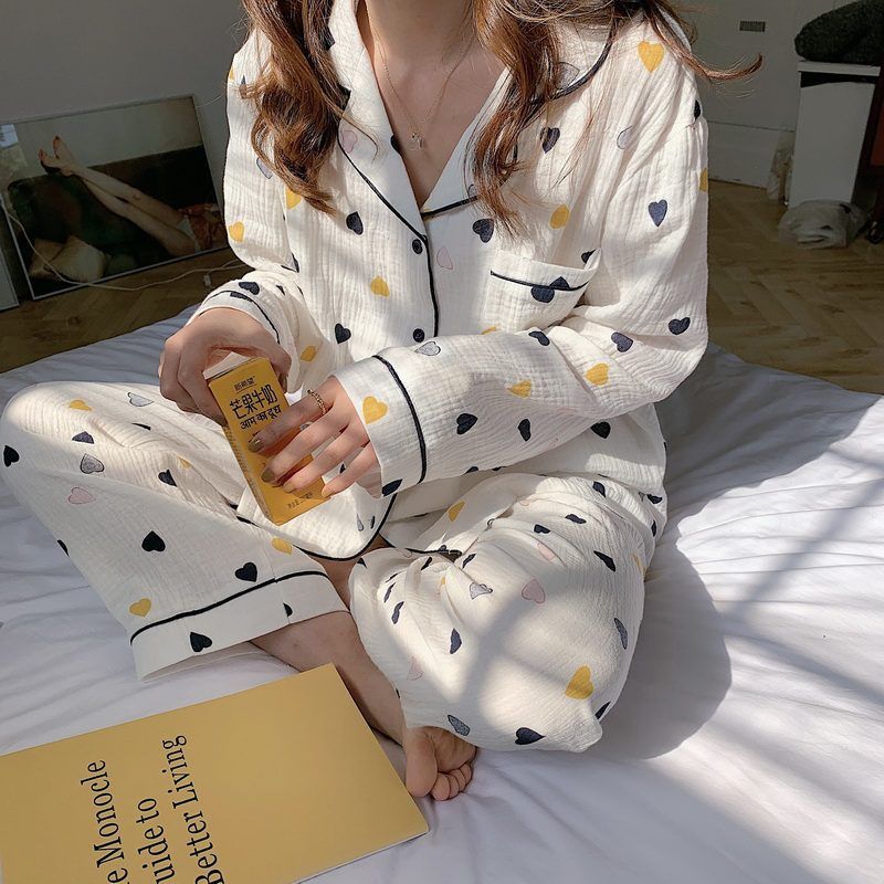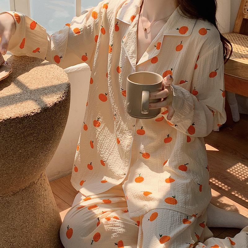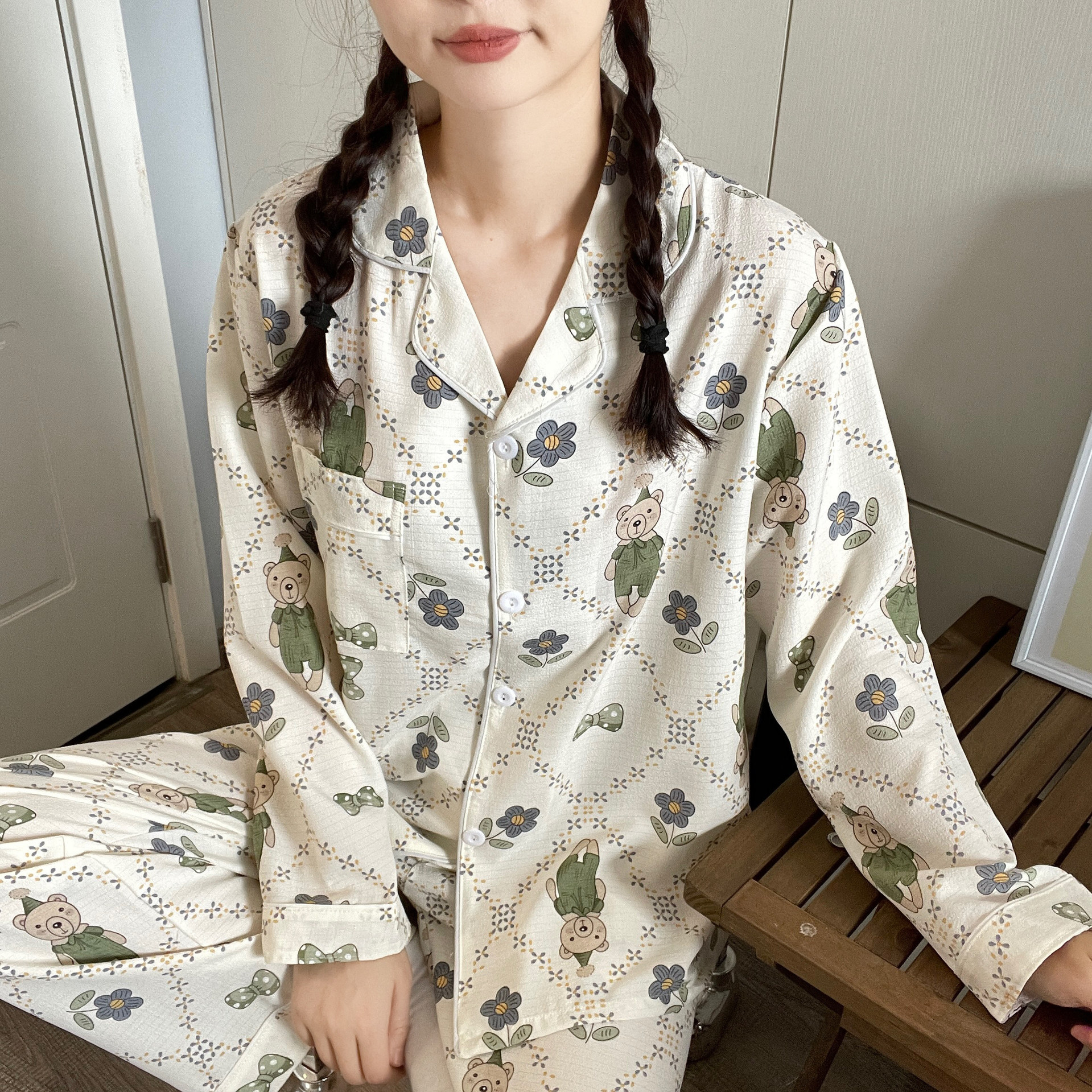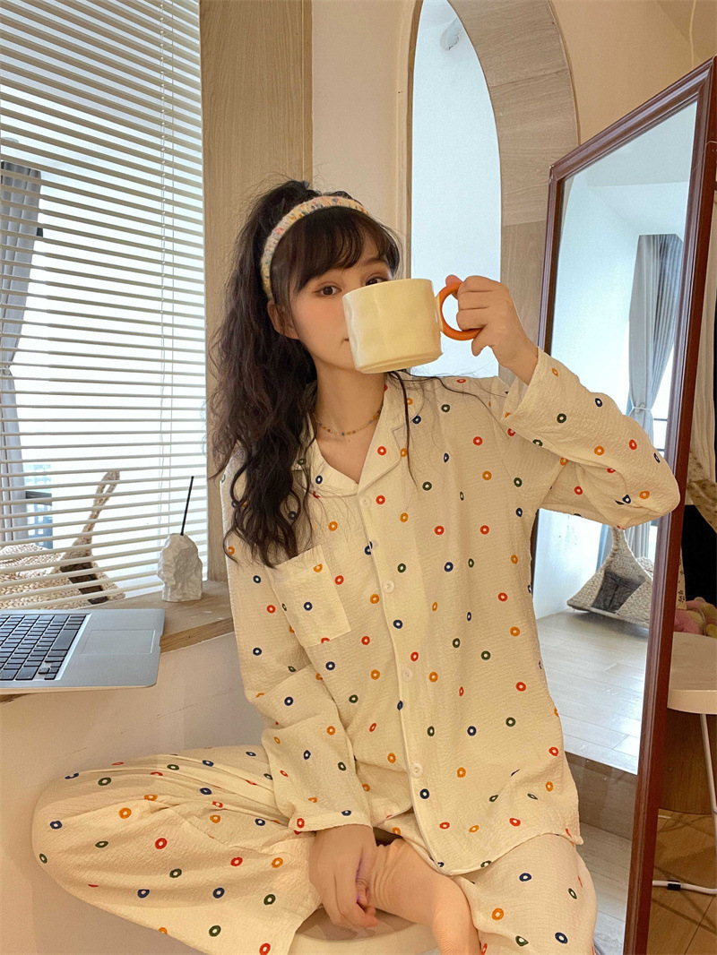 봄과 가을 새로운 Ins 스타일 파자마 여성의 새로운 버블 코튼 긴 소매 달콤한 스타일 간단한 홈 의류 세트 외부 착용스토어 가기
