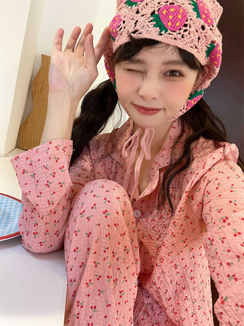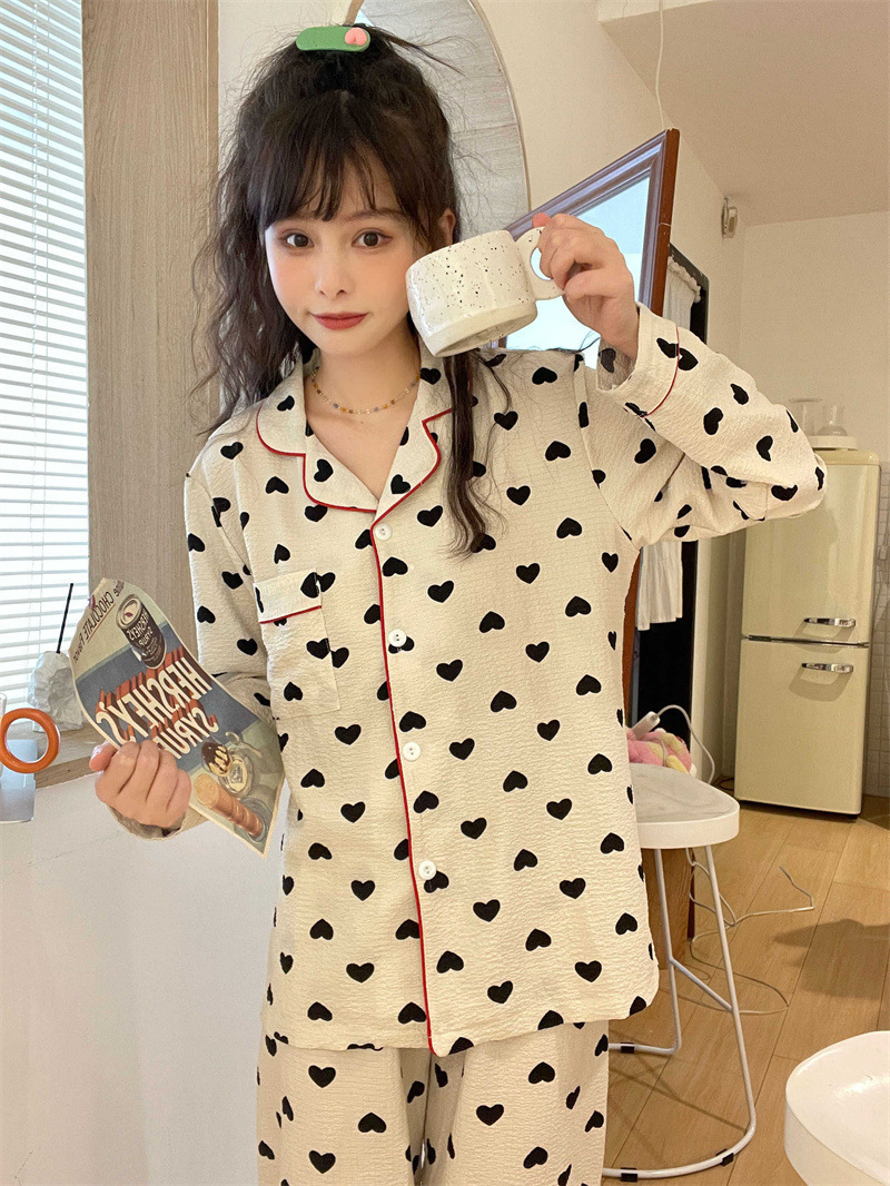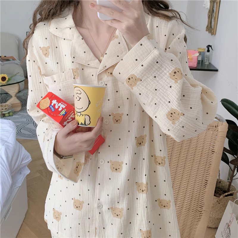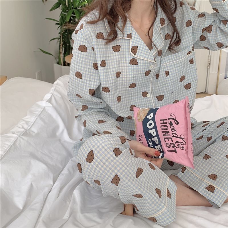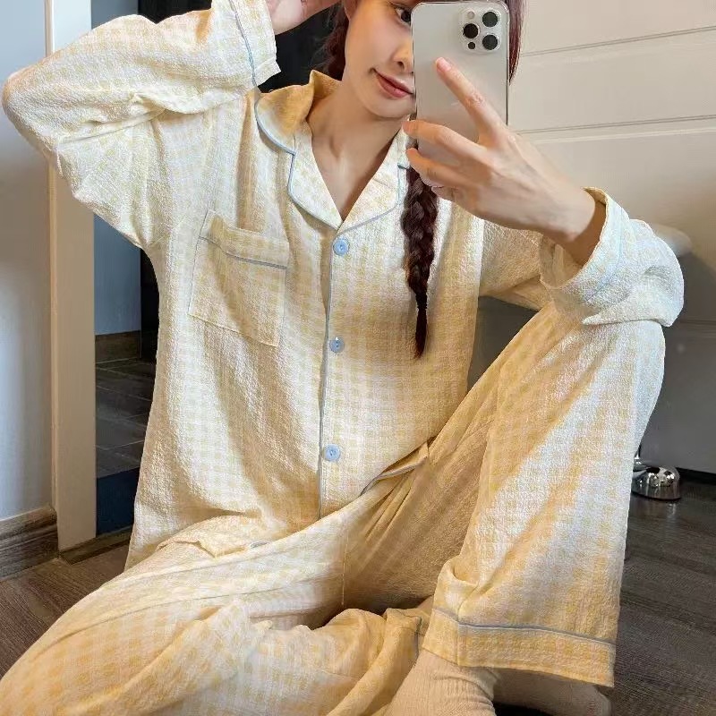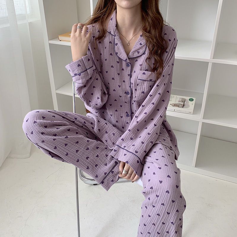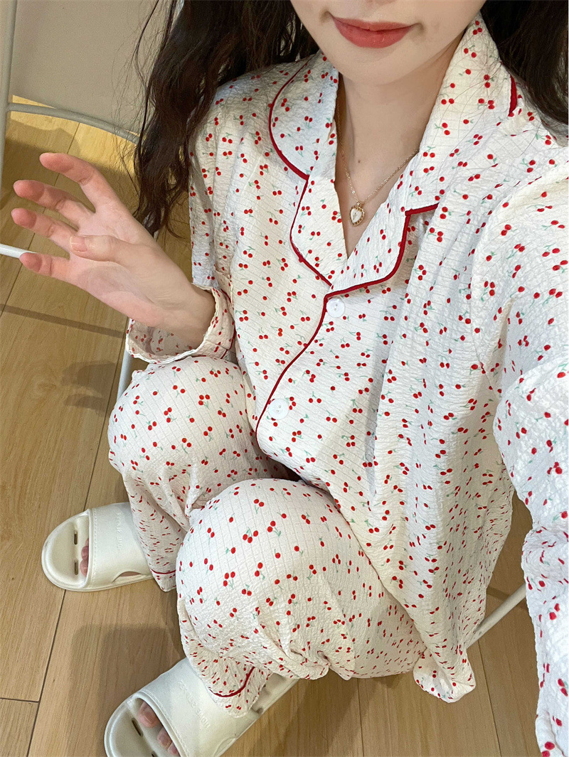 봄과 가을 새로운 Ins 스타일 파자마 여성의 새로운 버블 코튼 긴 소매 달콤한 스타일 간단한 홈 의류 세트 외부 착용스토어 가기