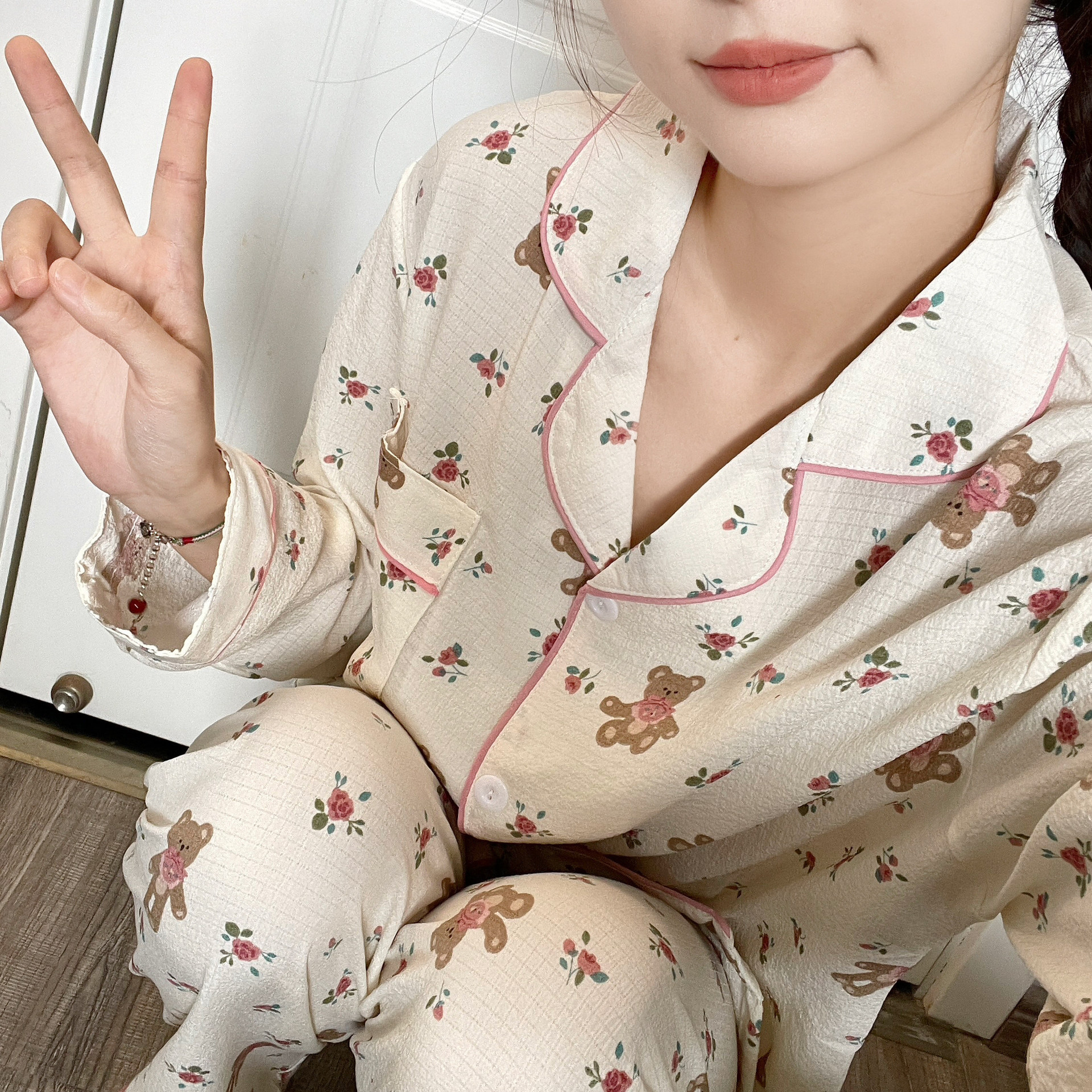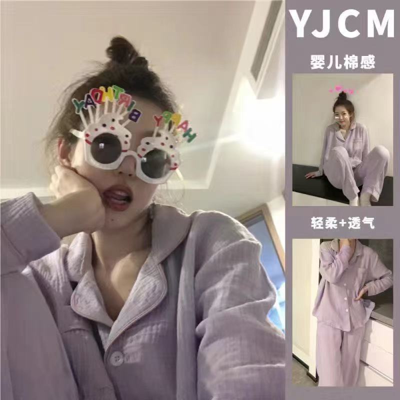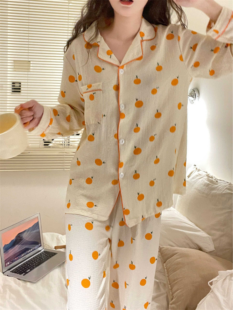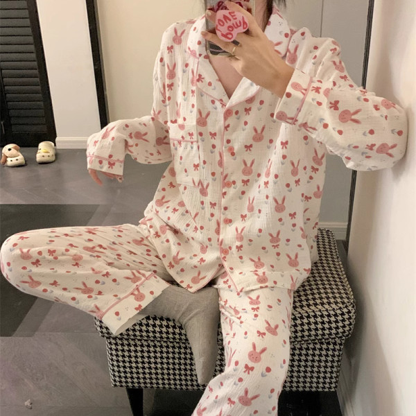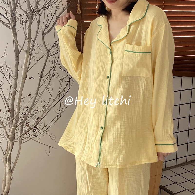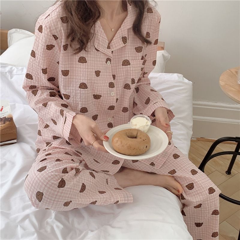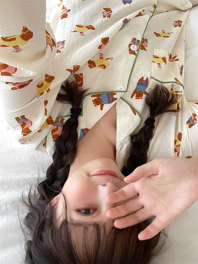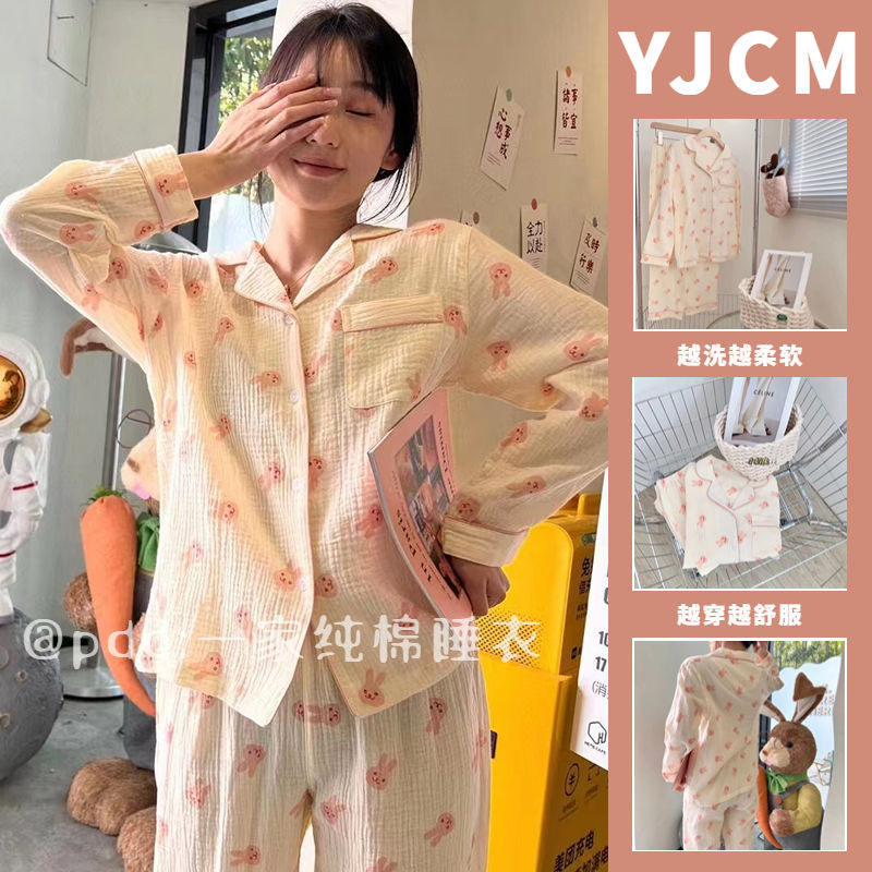 봄과 가을 새로운 Ins 스타일 파자마 여성의 새로운 버블 코튼 긴 소매 달콤한 스타일 간단한 홈 의류 세트 외부 착용스토어 가기