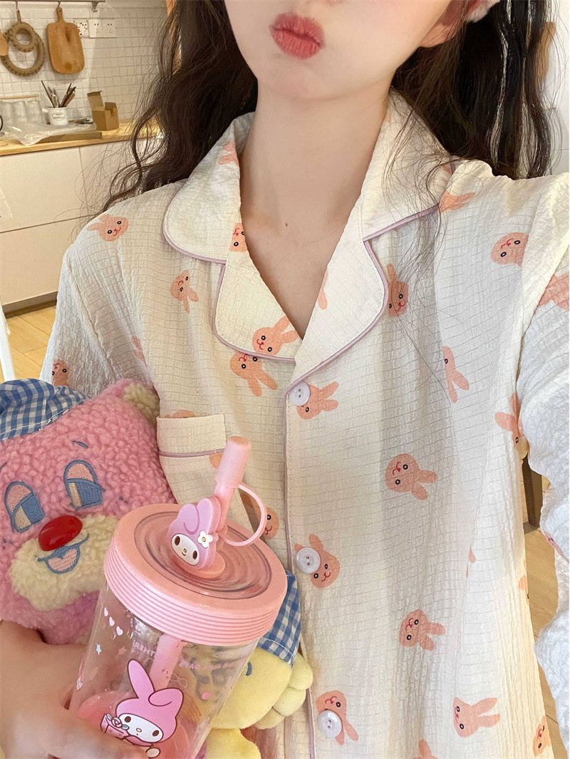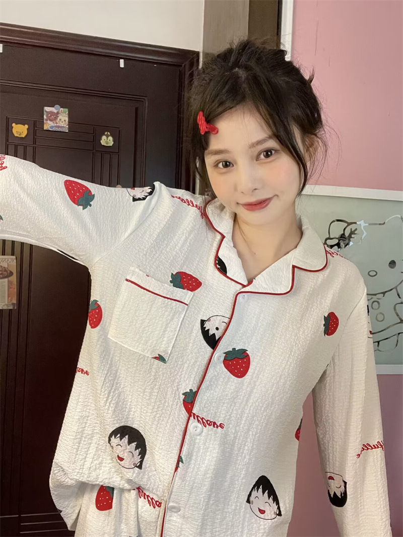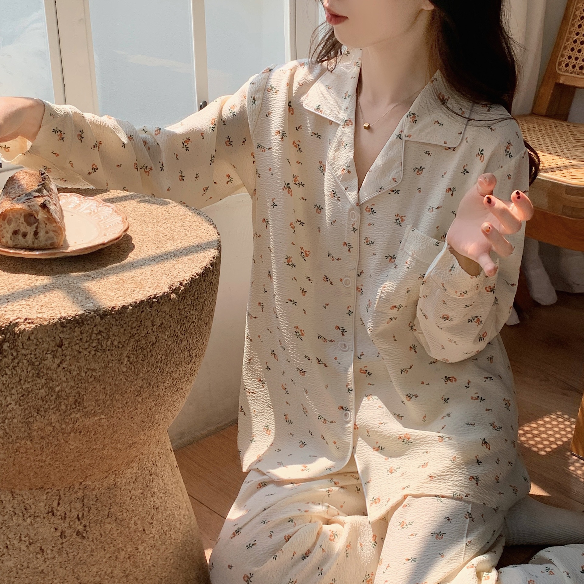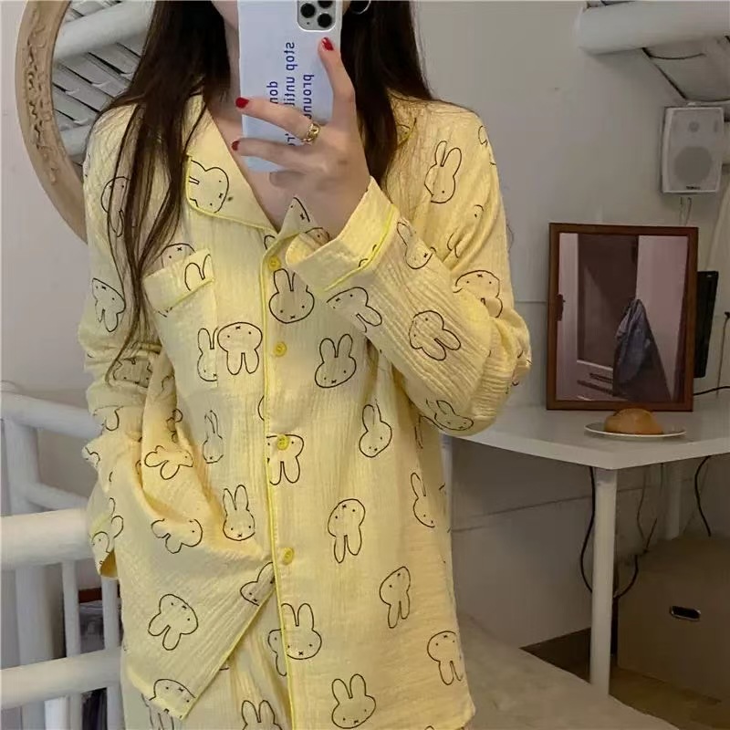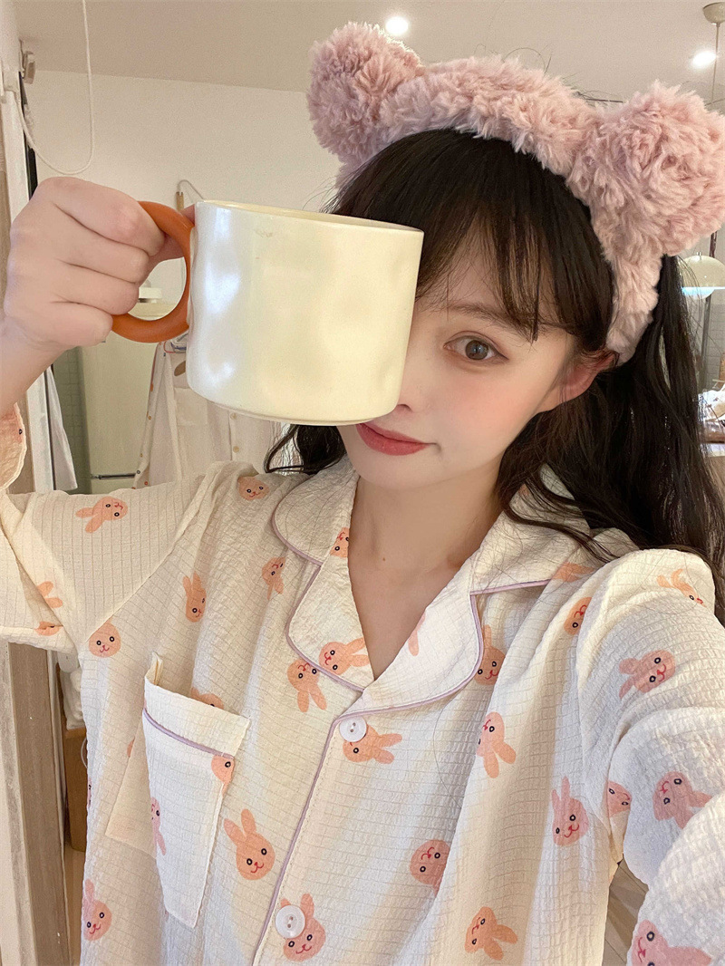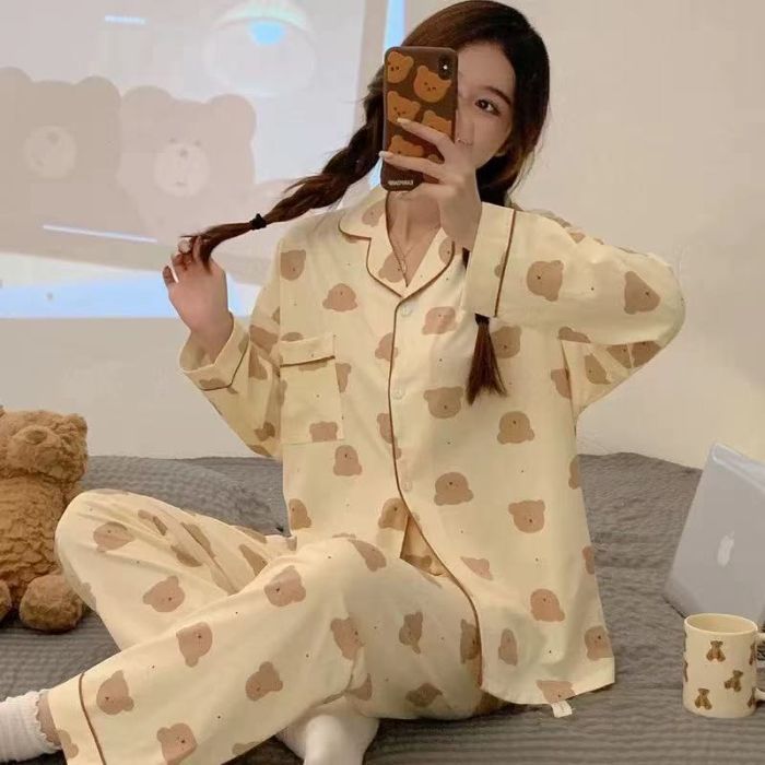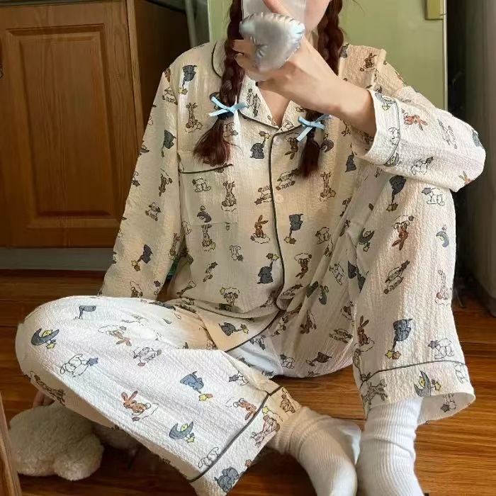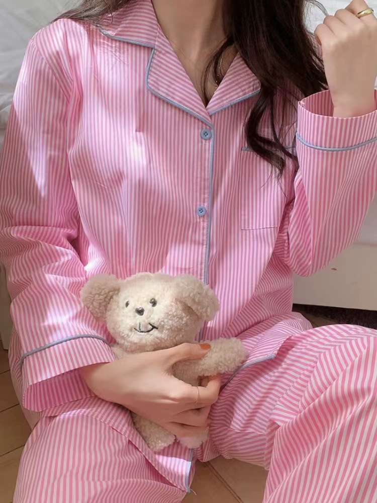 봄과 가을 새로운 Ins 스타일 파자마 여성의 새로운 버블 코튼 긴 소매 달콤한 스타일 간단한 홈 의류 세트 외부 착용스토어 가기