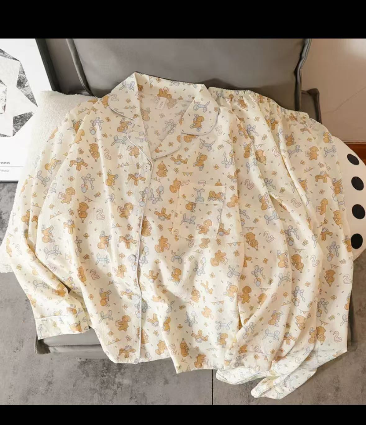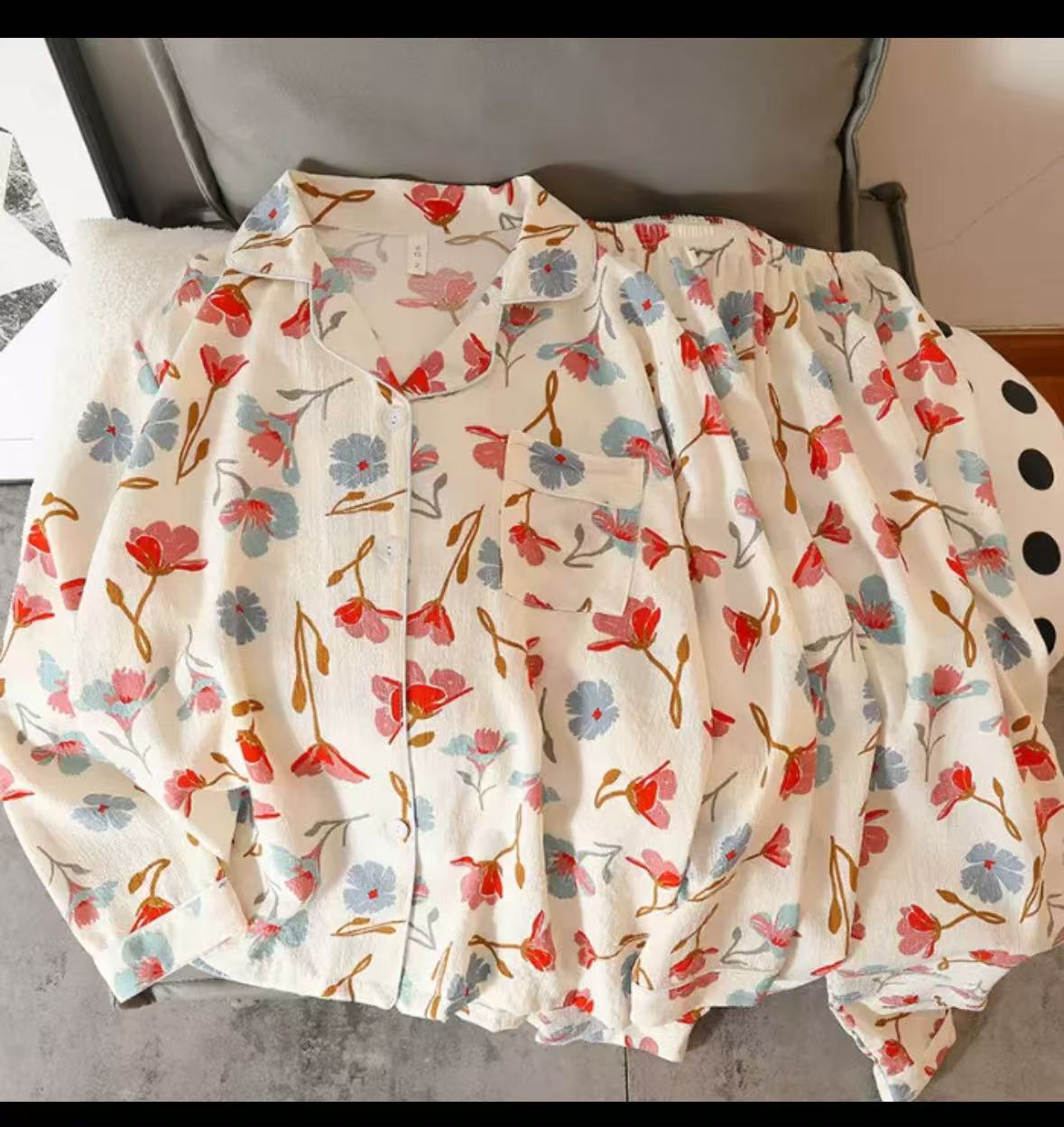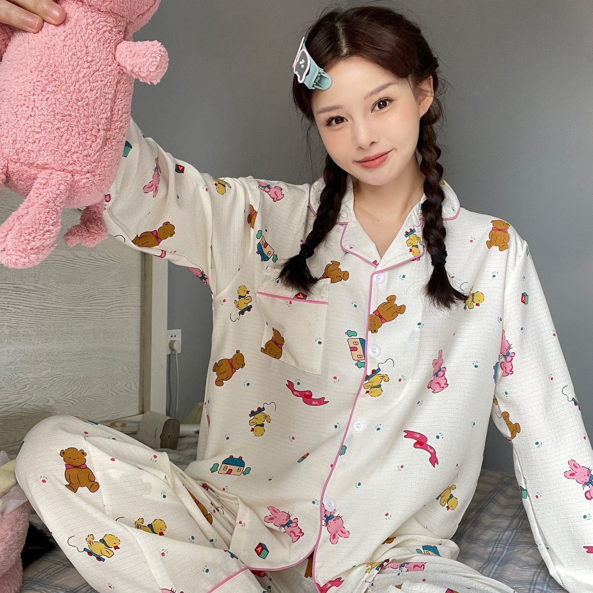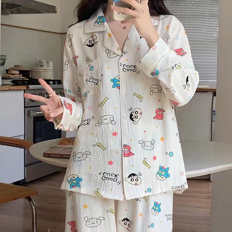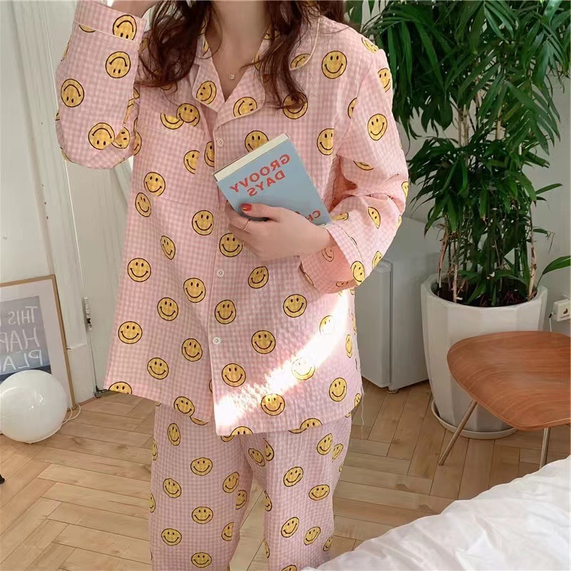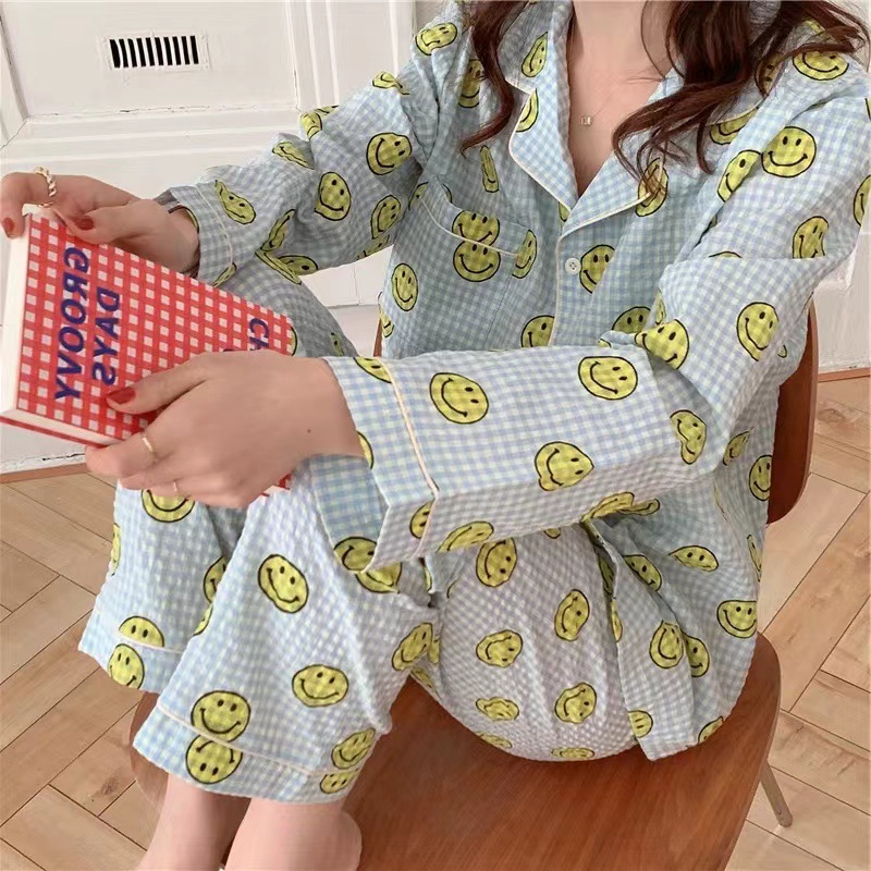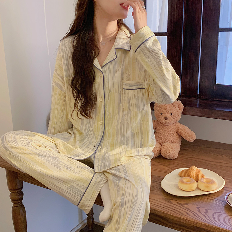 봄과 가을 새로운 Ins 스타일 파자마 여성의 새로운 버블 코튼 긴 소매 달콤한 스타일 간단한 홈 의류 세트 외부 착용스토어 가기