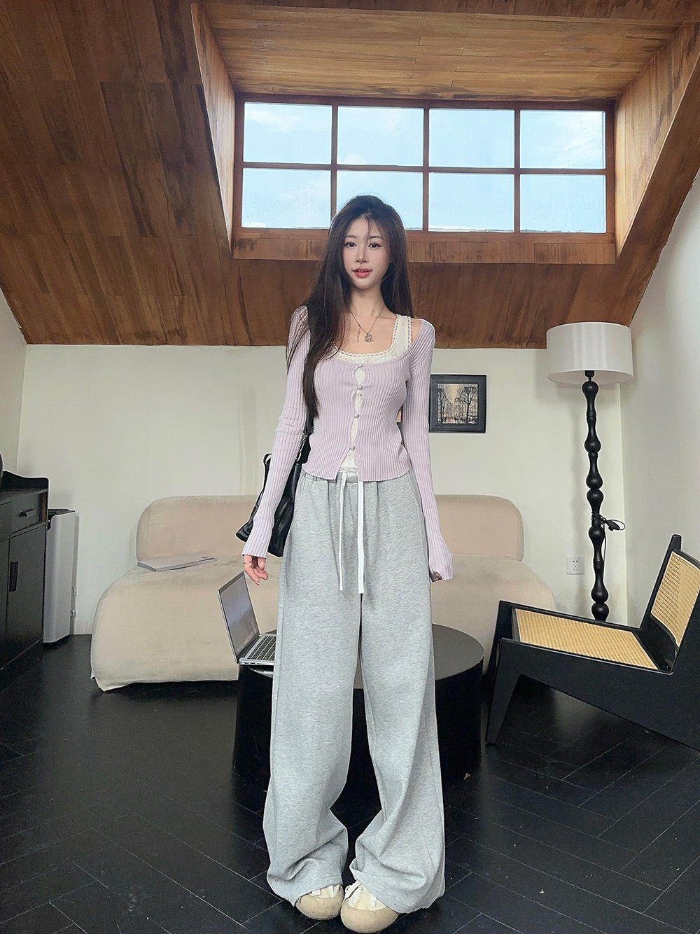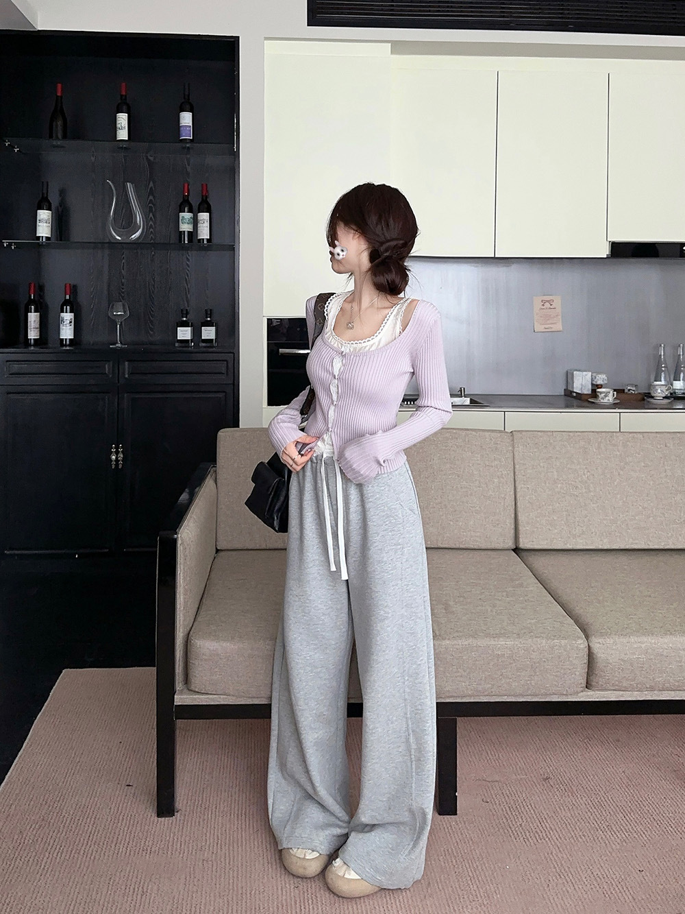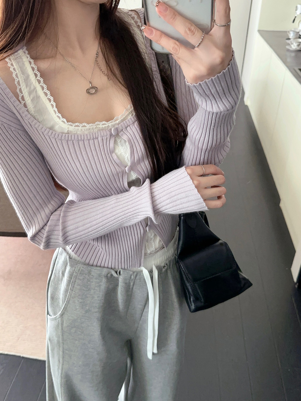 한국 스타일 가짜 두 조각 보라색 니트베이스 셔츠 여성의 봄 세련된 달콤한 스파이스 소녀 레이스 내부 쇼트 탑