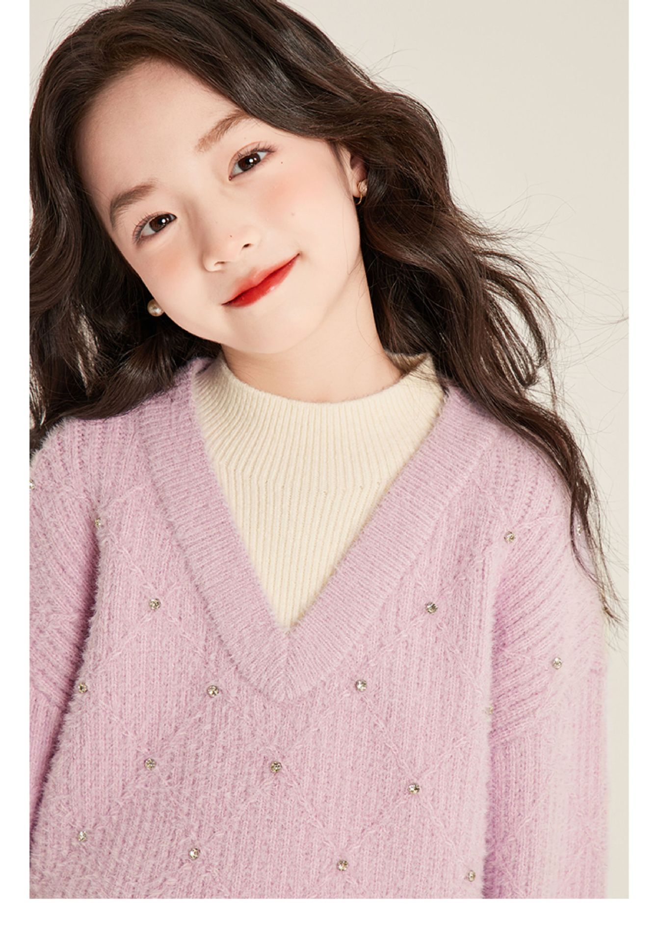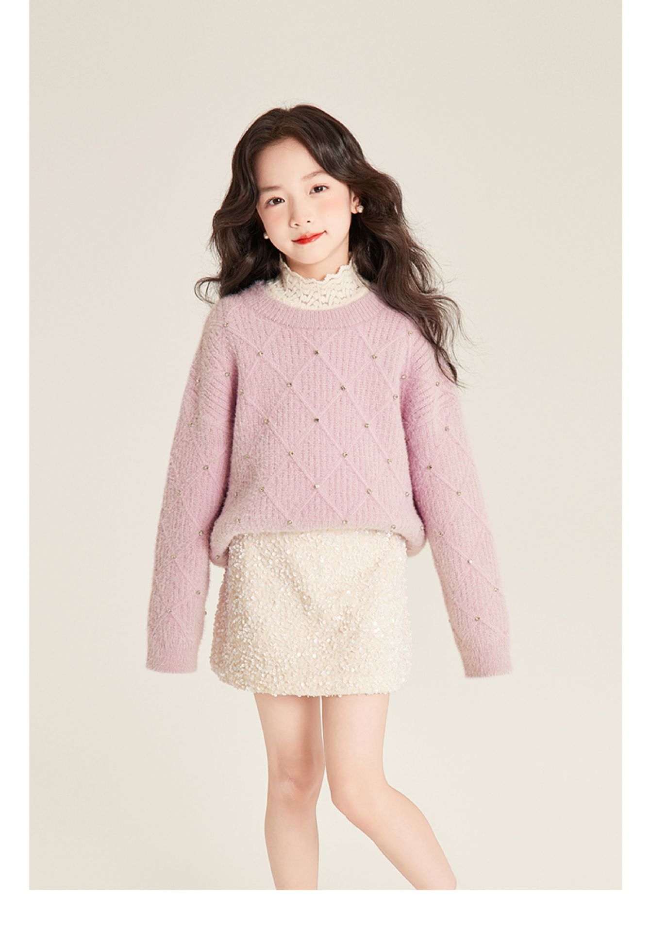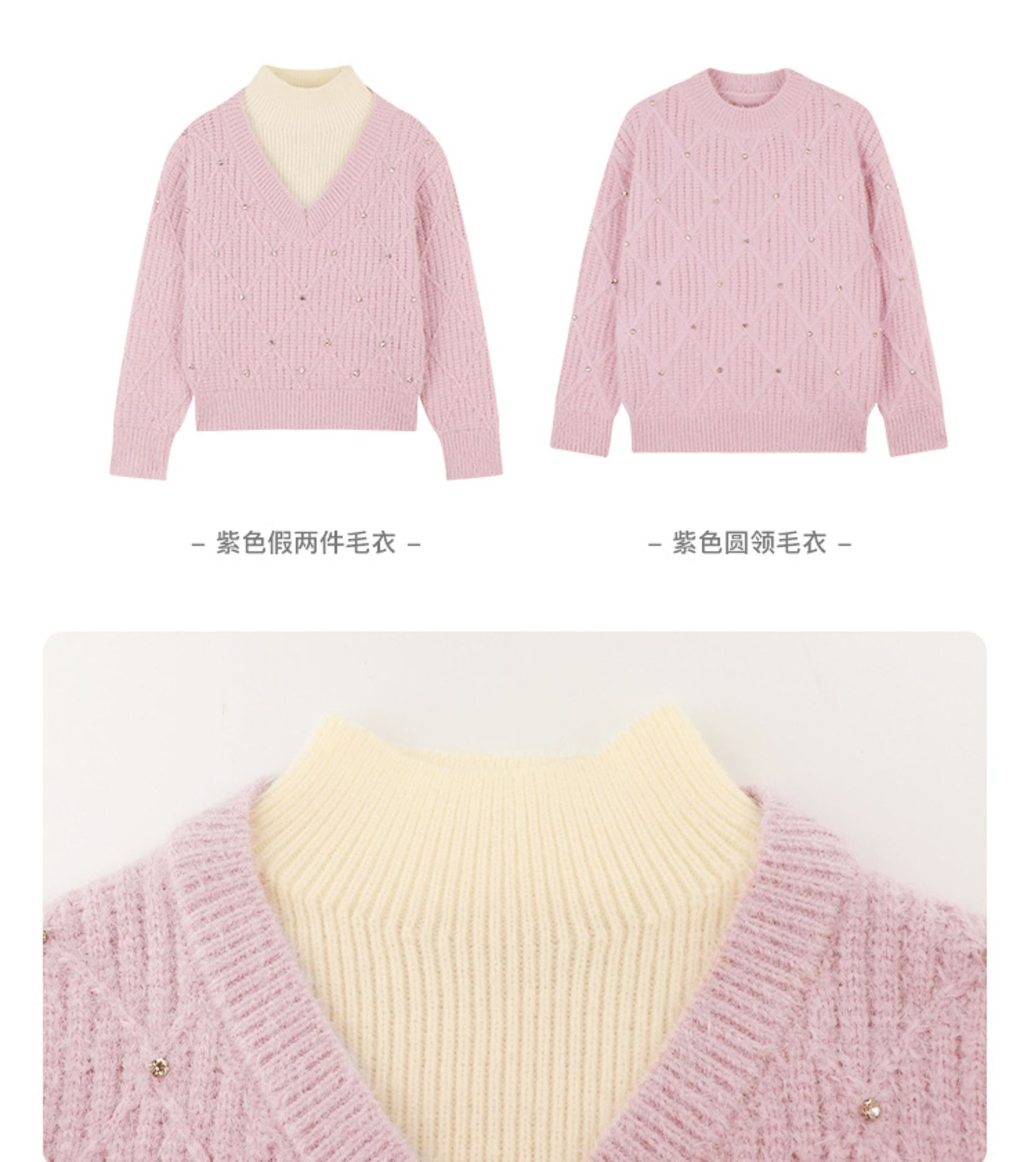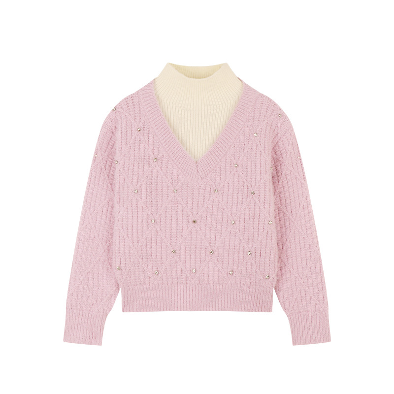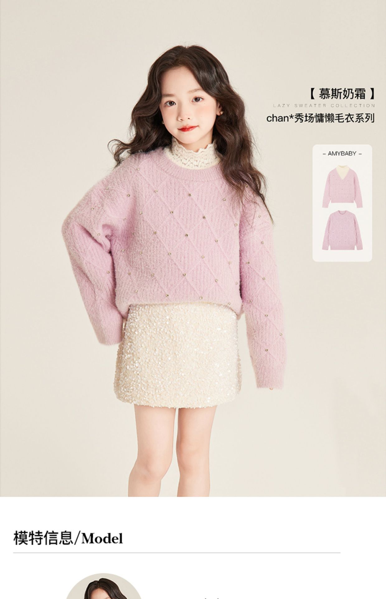 Amybaby Girls 'Top Winter 2024 새로운 캐주얼 소프트 왁스 젠틀 스타일 크루 넥 터틀넥 페이크 투피스 스웨터스토어 가기