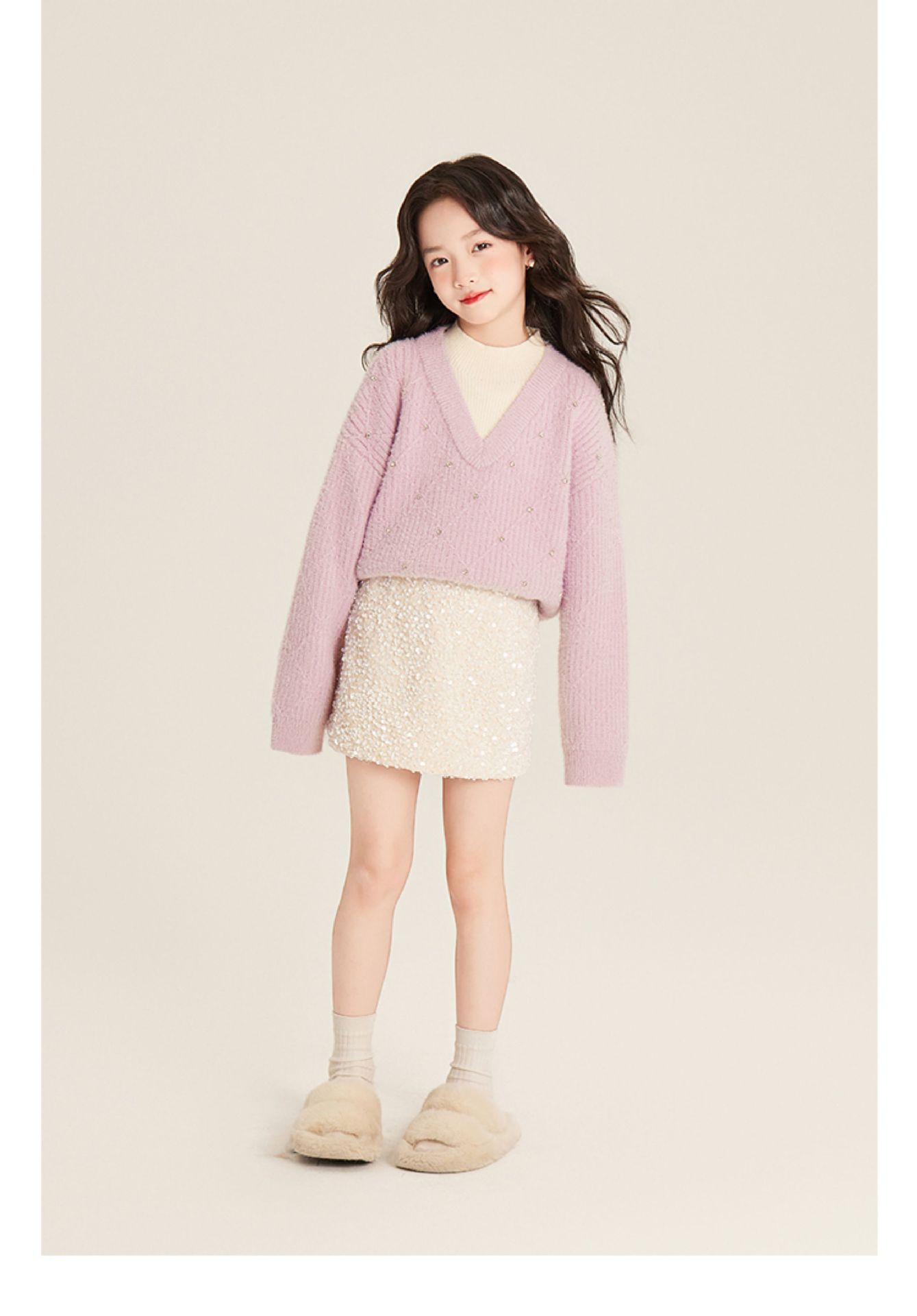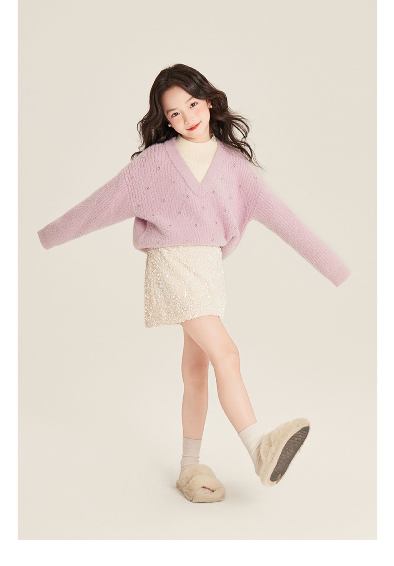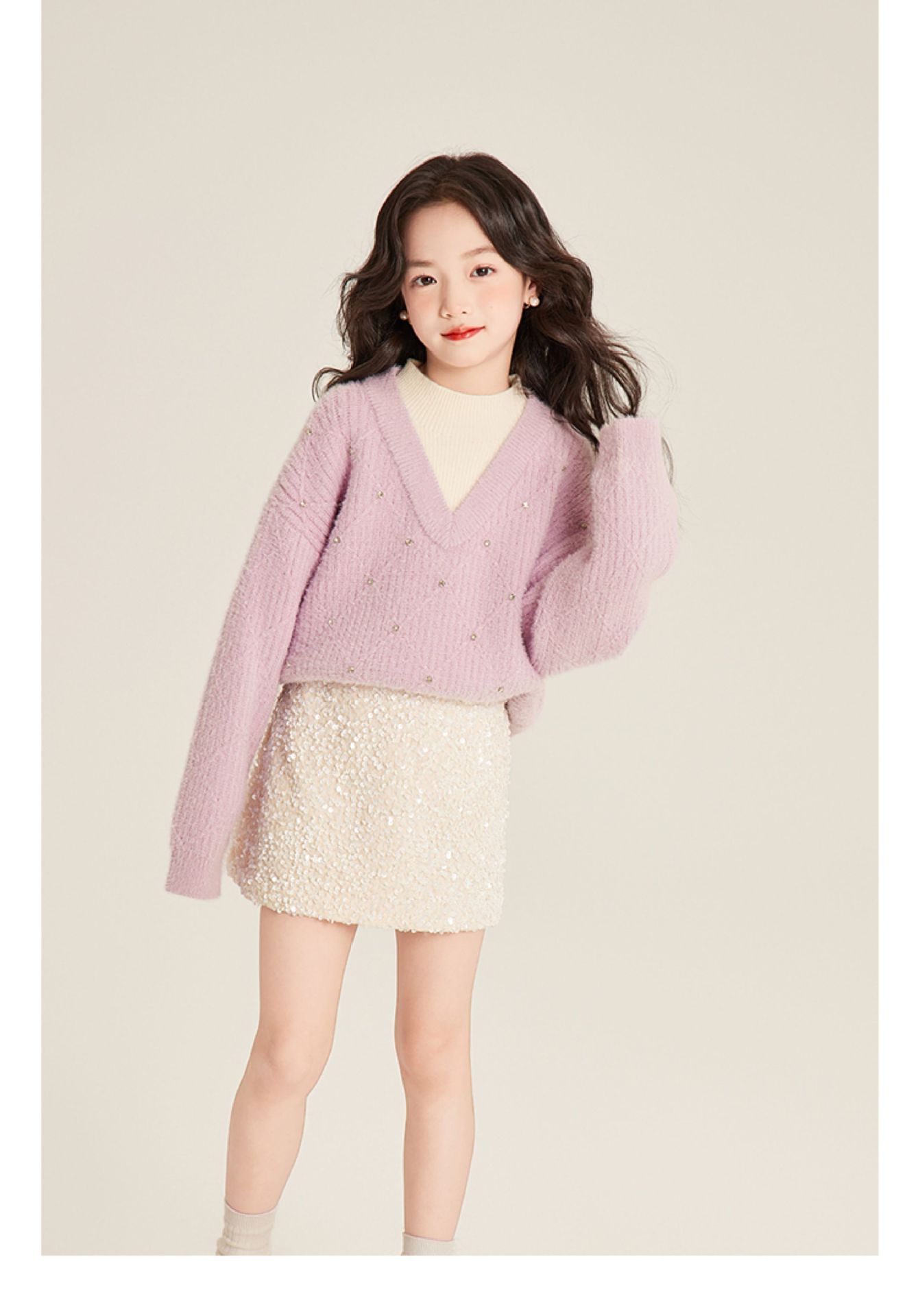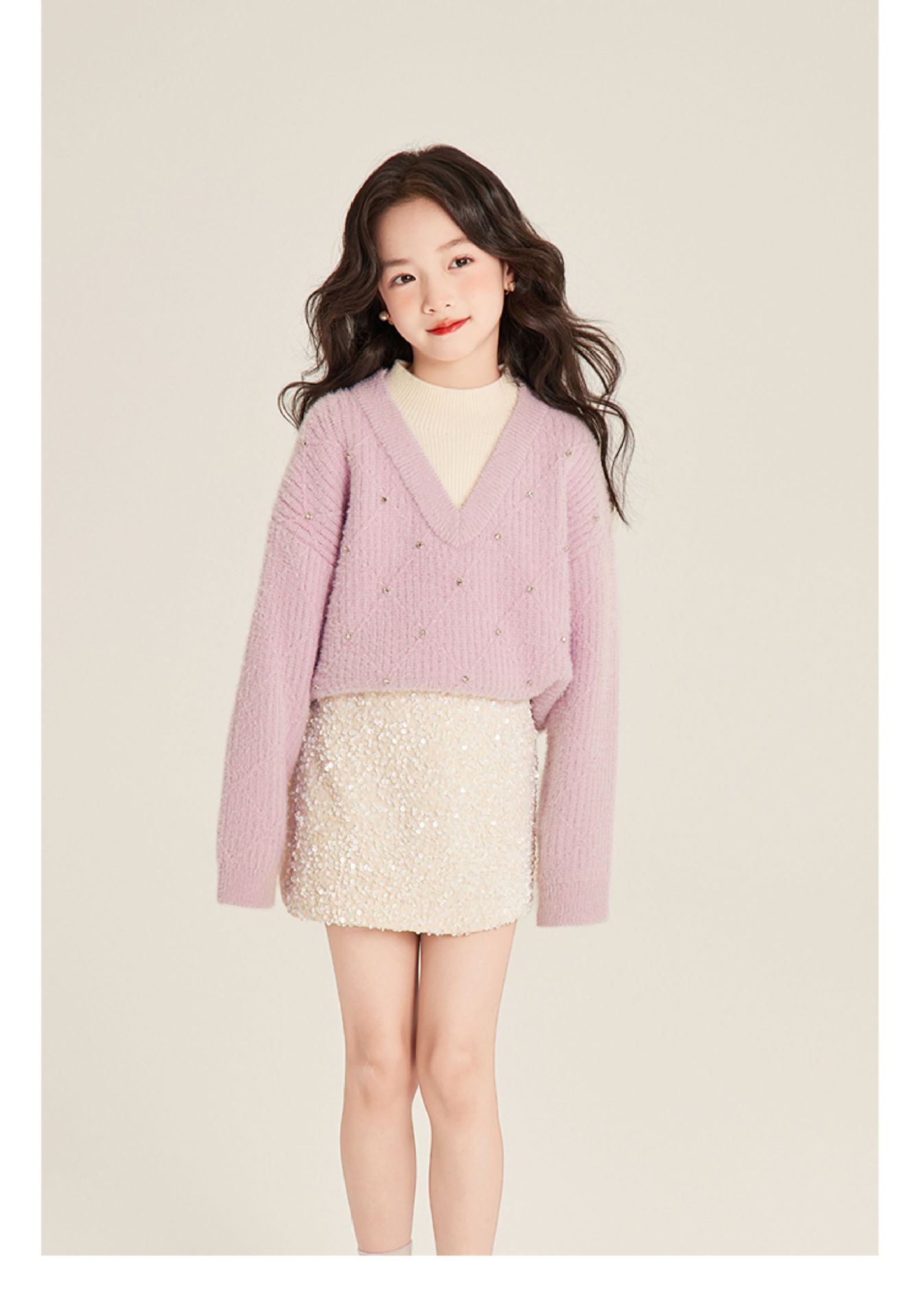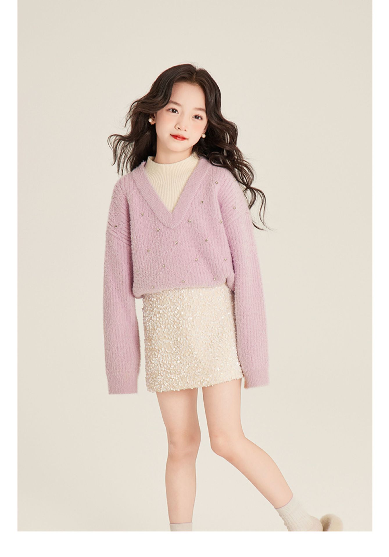 Amybaby Girls 'Top Winter 2024 새로운 캐주얼 소프트 왁스 젠틀 스타일 크루 넥 터틀넥 페이크 투피스 스웨터스토어 가기